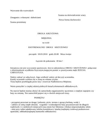 Wyzwanie dla wytrwałych Szansa na doświadczenie wiary Zmaganie z własnymi słabościami Nowa forma duchowości Szansa przemiany DROGA KRZYŻOWA MIĘKINIA na wzór EKSTREMALNEJ DROGI KRZYŻOWEJ początek 18.03.2016 godz.20.00 Msza święta Łącznie do pokonania 18 km ! Inicjatywa nie jest wyczynem sportowym. Jest to nabożeństwo DROGI KRZYŻOWEJ połączone z ekstremalnym wysiłkiem fizycznym,mającym pomóc w przeżywaniu męki JEZUSA CHRYSTUSA. Należy zabrać ze sobą krzyż. Jego wielkość zależy od decyzji uczestnika. Każdy uczestnik wybiera się w trasę na własne ryzyko. Trasa będzie przebiegała przez lasy i rezerwat Nadleśnictwa Miękinia. Warto pomyśleć o ciepłej odzieży,dobrych butach,elementach odblaskowych. Na starcie będzie można złożyć do samochodu organizatorów np.termos z ciepłym napojem czy buty na zmianę. Ten samochód pojawi się w dwóch miejscach trasy. PAMIĘTAJ - przygotuj prowiant na drogę ( jedzenie, picie, termos z gorącą herbatą, wodę ) - zabierz ze sobą ciepłe ubranie, wygodne i wodoodporne buty przystosowane do długich wędrówek ( w niektórych miejscach trasa może być błotnista i śliska) nieprzemakalny ubiór. - miej przy sobie naładowany telefon komórkowy, latarkę (najlepiej czołową) podstawowe opatrunki, odblaski(najlepiej kamizelki odblaskowe)
