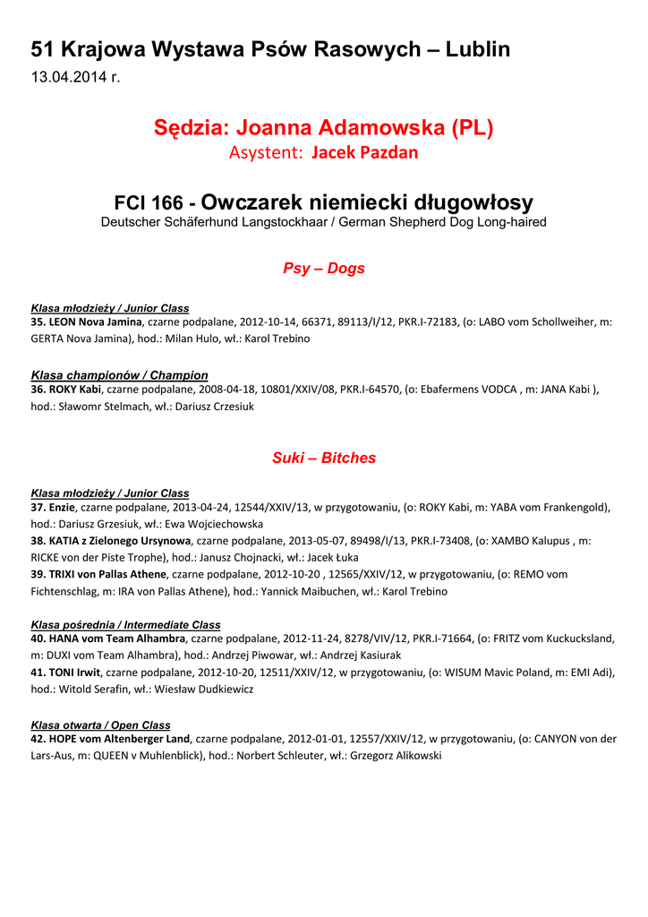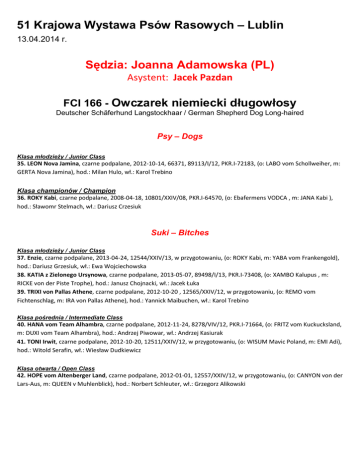 51 Krajowa Wystawa Psów Rasowych – Lublin 13.04.2014 r. Sędzia: Joanna Adamowska (PL) Asystent: Jacek Pazdan FCI 166 - Owczarek niemiecki długowłosy Deutscher Schäferhund Langstockhaar / German Shepherd Dog Long-haired Psy – Dogs Klasa młodzieży / Junior Class 35. LEON Nova Jamina, czarne podpalane, 2012-10-14, 66371, 89113/I/12, PKR.I-72183, (o: LABO vom Schollweiher, m: GERTA Nova Jamina), hod.: Milan Hulo, wł.: Karol Trebino Klasa championów / Champion 36. ROKY Kabi, czarne podpalane, 2008-04-18, 10801/XXIV/08, PKR.I-64570, (o: Ebafermens VODCA , m: JANA Kabi ), hod.: Sławomr Stelmach, wł.: Dariusz Crzesiuk Suki – Bitches Klasa młodzieży / Junior Class 37. Enzie, czarne podpalane, 2013-04-24, 12544/XXIV/13, w przygotowaniu, (o: ROKY Kabi, m: YABA vom Frankengold), hod.: Dariusz Grzesiuk, wł.: Ewa Wojciechowska 38. KATIA z Zielonego Ursynowa, czarne podpalane, 2013-05-07, 89498/I/13, PKR.I-73408, (o: XAMBO Kalupus , m: RICKE von der Piste Trophe), hod.: Janusz Chojnacki, wł.: Jacek Łuka 39. TRIXI von Pallas Athene, czarne podpalane, 2012-10-20 , 12565/XXIV/12, w przygotowaniu, (o: REMO vom Fichtenschlag, m: IRA von Pallas Athene), hod.: Yannick Maibuchen, wł.: Karol Trebino Klasa pośrednia / Intermediate Class 40. HANA vom Team Alhambra, czarne podpalane, 2012-11-24, 8278/VIV/12, PKR.I-71664, (o: FRITZ vom Kuckucksland, m: DUXI vom Team Alhambra), hod.: Andrzej Piwowar, wł.: Andrzej Kasiurak 41. TONI Irwit, czarne podpalane, 2012-10-20, 12511/XXIV/12, w przygotowaniu, (o: WISUM Mavic Poland, m: EMI Adi), hod.: Witold Serafin, wł.: Wiesław Dudkiewicz Klasa otwarta / Open Class 42. HOPE vom Altenberger Land, czarne podpalane, 2012-01-01, 12557/XXIV/12, w przygotowaniu, (o: CANYON von der Lars-Aus, m: QUEEN v Muhlenblick), hod.: Norbert Schleuter, wł.: Grzegorz Alikowski Sędzia: Joanna Adamowska (PL) Asystent: Jacek Pazdan FCI 166 - Owczarek niemiecki krótkowłosy Deutscher Schäferhund Stockhaar / German Shepherd Dog Short-haire Psy – Dogs Klasa młodzieży / Junior Class 43. GEK AMOL z Kojca Luny, czarne podpalane, 2012-12-12, 12472/XXIV/12, PKR.I-72233, (o: Falkoen's BAX, m: BISHA Atakatto), hod.: Czesław Tkaczyk, wł.: Zdzisław Kolbus Klasa użytkowa / Working Class 44. Falkoen's RAMOS, czarne podpalane, 2011-12-14 , 8499/XIV/11, PKR.I-73400, (o: ROY del Reventino, m: REA vom Hamburger Land), hod.: Kjell Olaf Olsen, wł.: Andrzej Piwowar Suki – Bitches Klasa młodzieży / Junior Class 45. HEYA vom Team Alhambra, czarne podpalane, 2012-11-24, 8497/XIV/12, PKR.I-73106, (o: FRITZ vom Kuckucksland, m: DUXI vom Team Alhambra), hod.: Andrzej Piwowar, wł.: Andrzej Piwowar 46. WIANA Alta Escuela, czarne podpalane, 2013-06-14 , 12710/XIV/13, w przygotowaniu, (o: QUENN vom Loher Weg, m: KIM vom Lichtetal), hod.: Zygmunt Miazek, wł.: Zygmunt Miazek Klasa pośrednia / Intermediate Class 47. CARRIE Barnero, wilczaste, 2012-08-12 , 12580/XXIV/12, PKR.I-74119, (o: Ängsbacken's ROSSO, m: USHA Barnero), hod.: Jozef Adamuscin, wł.: Bogdan Sztejmer 48. CATHERINE Barnero, wilczaste, 2012-08-12 , 12468/XXIV/12, PKR.I-73528, (o: Ängsbacken's ROSSO, m: USHA Barnero), hod.: Jozef Adamuscin, wł.: Mirosław Bałuc 49. QUANDA Jacentus, czarne podpalane, 2012-06-10 , 12475/XXIV/12, w przygotowaniu, (o: REMO Fichtenschlag , m: HEKSA Dlha Roven), hod.: Jacek Żydzik, wł.: Zdzisław Kolbus 50. QUERA Jacentus, czarne podpalane, 2012-06-10 , 12459/XXIV/12, w przygotowaniu, (o: REMO Fichtenschlag , m: HEKSA Dlha Roven), hod.: Jacek Żydzik, wł.: Zdzisław Kolbus 51. UBA Mis-Maz, czarne podpalane, 2012-09-03, 12432/XXIV/12, PKR.I-73461, (o: CARLOS z Peletonu Skorpiona, m: ZORKA Ardelia), hod.: Waldemar Federak, wł.: Jerzy Gomola Klasa otwarta / Open Class 52. BAXI Ezmar,czarne podpalane, 2011-11-24 , 11907/XXIV/11, PKR.I-70415, (o: Falkoen's BAX, m: NELA Animar), hod.: Zbigniew Marzec, wł.: Zdzisław Kolbus 53. HANA Team V-Max, czarne podpalane, 2011-06-28 , 1811/XXXV/11, w przygotowaniu, (o: ZIBU von der Freiheit Westerholt , m: DINA von Haus Yu), hod.: Kornel Dybul, wł.: Bogusław Szabat 54. HERA Ezmar, czarne podpalane, 2012-01-01 , 12096/XXIV/12, PKR.I-71760 , (o: BRAVOS Animar , m: HONDA Sądeckie Lachy), hod.: Zbigniew Marzec, wł.: Zdzisław Kolbus Klasa użytkowa / Working Class 55. KIM vom Lichteta, czarne podpalane, 2007-05-07 , 11098/XXIV/07, PKR.I-62110 , (o: XENO vom Elzmundungsraum, m: FINA vom Lichtetal), hod.: Steffi Kulbel, wł.: Zygmunt Miazek
