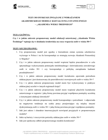 TEZY DO DYSKUSJI ZWIĄZANE Z WDRAŻANIEM AKADEMICKIEGO MODELU KSZTAŁCENIA USTAWICZNEGO – „AKADEMIA WIEKU ŚREDNIEGO” TEZA GŁÓWNA: Czy i w jakim zakresie proponowany model edukacji ustawicznej „Akademia Wieku Średniego” wpisuje się w działania środowiska na rzecz wsparcia osób w wieku 50+? TEZY SZCZEGÓŁOWE: 1. Czy proponowany model jest zgodny z kierunkiem zmian systemu szkolnictwa wyższego w Polsce i na ile koresponduje ze strategią rozwoju Akademii Pomorskiej w Słupsku? 2. Czy i w jakim zakresie proponowany model wspierać będzie pracodawców w celu optymalnego wykorzystania potencjału intelektualnego i doświadczenia zawodowego osób w wieku 50+ i czy koresponduje z polityką zarządzania kadrami przedsiębiorstw? 3. Czy i w jakim zakresie proponowany model kształcenia opowiada potrzebom edukacyjnym i jest dostosowany do prawidłowości rozwojowych osób w wieku 50+? 4. Czy i w jakim zakresie proponowany model może być wykorzystany w praktyce edukacyjnej uczelni w innych regionach kraju? 5. Czy i w jakim zakresie proponowany model może wspierać placówki kształcenia ustawicznego w regionie i jaką formę powinna przyjąć współpraca pomiędzy uczelnią a instytucjami edukacji dorosłych? 6. Czy i w jakim zakresie proponowany model koresponduje z potrzebami i odpowiada na negatywne tendencje na rynku pracy przejawiające się między innymi dyskryminacją osób w wieku 50+ i jaką formę powinna przyjąć współpraca pomiędzy 7. Jaki jest zakres i charakter innowacyjnych rozwiązań przyjętych w proponowanym modelu? 8. Jakie są bariery i rzeczywiste potrzeby edukacyjne osób w wieku 50+? 9. Jaki jest społeczny odbiór proponowanego modelu kształcenia? „AKADEMIA WIEKU ŚREDNIEGO – akademicki model kształcenia ustawicznego osób 50+” Projekt współfinansowany ze środków UE w ramach Europejskiego Funduszu Społecznego