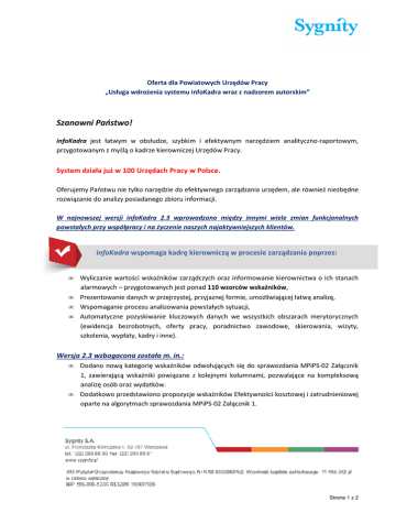 Oferta dla Powiatowych Urzędów Pracy „Usługa wdrożenia systemu infoKadra wraz z nadzorem autorskim” Szanowni Państwo! infoKadra jest łatwym w obsłudze, szybkim i efektywnym narzędziem analityczno-raportowym, przygotowanym z myślą o kadrze kierowniczej Urzędów Pracy. System działa już w 100 Urzędach Pracy w Polsce. Oferujemy Państwu nie tylko narzędzie do efektywnego zarządzania urzędem, ale również niezbędne rozwiązanie do analizy posiadanego zbioru informacji. W najnowszej wersji infoKadra 2.3 wprowadzono między innymi wiele zmian funkcjonalnych powstałych przy współpracy i na życzenie naszych najaktywniejszych klientów. infoKadra wspomaga kadrę kierowniczą w procesie zarządzania poprzez: • • • • Wyliczanie wartości wskaźników zarządczych oraz informowanie kierownictwa o ich stanach alarmowych – przygotowanych jest ponad 110 wzorców wskaźników, Prezentowanie danych w przejrzystej, przyjaznej formie, umożliwiającej łatwą analizę, Wspomaganie procesu analizowania powstałych sytuacji, Automatyczne pozyskiwanie kluczowych danych we wszystkich obszarach merytorycznych (ewidencja bezrobotnych, oferty pracy, poradnictwo zawodowe, skierowania, wizyty, szkolenia, wypłaty, kadry i inne). Wersja 2.3 wzbogacona została m. in.: • • Dodano nową kategorię wskaźników odwołujących się do sprawozdania MPiPS-02 Załącznik 1, zawierającą wskaźniki powiązane z kolejnymi kolumnami, pozwalające na kompleksową analizę osób oraz wydatków. Dodatkowo przedstawiono propozycje wskaźników Efektywności kosztowej i zatrudnieniowej oparte na algorytmach sprawozdania MPiPS-02 Załącznik 1. Strona 1 z 2 • • • W ramach Gwarancji dla Młodzieży dodano wskaźniki odwołujące się do kolejnych kolumn sprawozdania. Dodano nową kategorię wskaźników - Udział osób w programach ze standardowym zestawem filtrów rozbudowanym między innymi o możliwość analizy pod kątem profilu (na dzień rozpoczęcia udziału w programie), doradcy klienta, stażu pracy i czasu pozostawania bez pracy. Dokonaliśmy tez wielu zmian w już istniejących wskaźnikach Łączy koszt oferowanego rozwiązania zależny jest od liczby zarejestrowanych w systemie nazwanych użytkowników i wynosi odpowiednio: Oferta obowiązująca do 30 czerwca 2016 r. Liczba nazwanych /zarejestrowanych/ użytkowników Cena PLN netto Cena PLN brutto Cena PLN netto Cena PLN brutto do 5 23 000,00 28 290,00 4 600,00 5 658,00 do 10 26 000,00 31 980,00 5 200,00 6 396,00 bez limitu 30 000,00 36 900,00 6 000,00 7 380,00 Wdrożenie* Nadzór autorski na 2016 rok * W przypadku złożenia zamówienia wdrożenia do końca marca 2016 roku, nadzór autorski do końca 2016 roku otrzymają Państwo w cenie wdrożenia ! W przypadku pytań prosimy o kontakt z: Ewa Kwapisz, tel. 504-142-914, e-mail: [email protected]. Z poważaniem Dyrektor Sprzedaży Strona 2 z 2