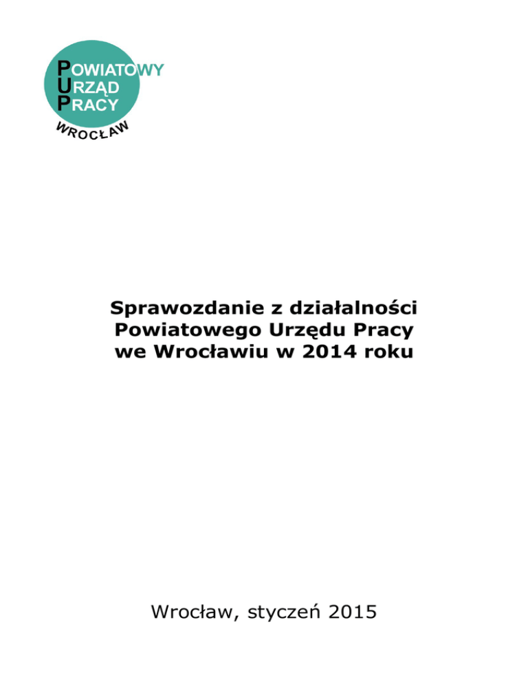 Sprawozdanie z działalności Powiatowego Urzędu Pracy we Wrocławiu w 2014 roku Wrocław, styczeń 2015 I. Ogólna sytuacja na lokalnym rynku pracy Powiatowy Urząd Pracy we Wrocławiu obejmuje swoim działaniem Wrocław i Powiat Wrocławski. Według stanu na koniec 2014 roku w Urzędzie zarejestrowanych było 16 683 bezrobotnych: 14 254 z Wrocławia oraz 2 429 z Powiatu Wrocławskiego. W porównaniu do 2013 roku liczba zarejestrowanych bezrobotnych zmniejszyła się o 4 926 osób (o 4 298 osób we Wrocławiu i o 628 osób w Powiecie Wrocławskim). Prawo do zasiłku według stanu na dzień 31 grudnia 2014 roku posiadało 2 781 osób (17% zarejestrowanych bezrobotnych). 1. Stopa bezrobocia Stopy bezrobocia na dzień 31 grudnia 2014 roku wynosiły 4,3% we Wrocławiu oraz 4,2% w Powiecie Wrocławskim i zmalały w porównaniu do ubiegłego roku odpowiednio o 1,2% i 1,1%. Zmiany wielkości stóp bezrobocia w poszczególnych miesiącach obrazuje poniższy wykres wraz z tabelą: Stopa bezrobocia na obszarze działania Urzędu nie przekraczała 150% przeciętnej stopy bezrobocia w kraju w dniu 30 czerwca 2013 roku, w związku z czym w 2014 roku zasadniczo okres pobierania zasiłku dla bezrobotnych wynosił 6 miesięcy. 2 2. Struktura bezrobocia 2.1. Wiek bezrobotnych Poniższy wykres obrazuje podział zarejestrowanych bezrobotnych według grup wiekowych. Zmiany w strukturze wiekowej w stosunku do roku 2013 ilustruje poniższy wykres: 3 2.2. Wykształcenie W 2014 roku najmniej liczną grupą byli bezrobotni z wykształceniem średnim ogólnokształcącym. Stanowili jedynie 10,2% ogółu zarejestrowanych bezrobotnych. Najliczniejsza natomiast była grupa z wykształceniem wyższym, która stanowiła 25% całej populacji bezrobotnych. Szczegółowe zmiany w strukturze wykształcenia bezrobotnych w stosunku do roku 2013 przedstawia poniższy wykres: 4 2.3. Staż pracy W strukturze osób bezrobotnych według stażu pracy największy odsetek stanowiły osoby ze stażem pracy do 1 roku (19,7%), a w następnej kolejności osoby ze stażem od 1 do 5 lat (17,5%). Zmiany w strukturze bezrobotnych według stażu pracy w stosunku do roku 2013 przedstawia poniższa tabela: 5 2.4. Czas pozostawania bez pracy Poniższy wykres obrazuje podział zarejestrowanych bezrobotnych według czasu pozostawania bez pracy. Zmiany w strukturze w stosunku do roku 2013 ilustruje poniższy histogram: 6 3. Fluktuacja bezrobotnych W 2014 roku zarejestrowało się 26 188 osób bezrobotnych, natomiast wyrejestrowało – 31 114. Najczęstszą przyczyną wyrejestrowania osób bezrobotnych było podjęcie pracy, przy czym w stosunku do poprzedniego roku nastąpił wzrost o 2% (z 45% do 47%). 7 II. Usługi i instrumenty rynku pracy 1. Pośrednictwo pracy W 2014 roku Powiatowy Urząd Pracy we Wrocławiu posiadał 23 025 ofert pracy i aktywizacji zawodowej, w tym 3 034 dla osób niepełnosprawnych. Ofert zatrudnienia było 21 381 (93%), natomiast pozostałych 1 644 ofert obejmowało staże i prace społecznie użyteczne. Najwięcej ofert dotyczyło zawodów: 1) pozostali magazynierzy i pokrewni 2) robotnik magazynowy 3) pracownik ochrony fizycznej bez licencji 4) pozostali pracownicy obsługi biura gdzie indziej niesklasyfikowani 5) sprzedawca 6) pozostałe pomoce i sprzątaczki biurowe, hotelowe i podobne 7) robotnik budowlany 8) sprzątaczka biurowa 9) magazynier 10) pakowacz – – – – – – – – – – 3 430 ofert, 1 293 oferty, 836 ofert, 829 ofert, 799 ofert, 469 ofert, 458 ofert, 419 ofert, 411 ofert, 385 ofert. Napływ wolnych miejsc pracy i miejsc aktywizacji zawodowej w stosunku do 2013 roku obrazuje poniższy wykres: W 2014 roku pośrednicy zewnętrzni pełniący funkcję doradcy klienta instytucjonalnego nawiązali kontakt z 699 nowymi pracodawcami. W wyniku kontaktów bezpośrednich, telefonicznych i drogą elektroniczną pozyskali oni 13 478 ofert pracy. Ponadto w celu promocji i pozyskania miejsc stażowych, pośrednicy skontaktowali się z 525 pracodawcami, co zaowocowało złożeniem wniosków stażowych przez 78 firm na 249 stażystów. Pozyskanie ofert na przestrzeni roku, w porównaniu do lat ubiegłych przedstawia poniższy wykres: 8 miesiąc rok 2012 2013 2014 styczeń 531 990 688 luty 615 596 427 marzec 455 398 813 kwiecień 424 594 774 maj 708 709 918 czerwiec 683 647 622 lipiec 609 845 841 sierpień 594 582 1 290 wrzesień 594 463 4 974 październik 762 1 004 1 367 listopad 611 616 500 grudzień 460 405 264 7 046 7 849 13 478 Suma: Pośrednicy pracy pełniący funkcję klienta indywidualnego odnotowali 145 668 wizyt osób bezrobotnych i poszukujących pracy, w efekcie których wydano 32 849 skierowań do pracodawców. W wyniku otrzymanych od pośredników pracy skierowań 1 208 osób rozpoczęło odbywanie stażu u pracodawcy. W ramach sieci EURES pośrednicy dysponowali 3 476 miejscami pracy; asystent EURES udzielił pomocy 2 191 osobom zainteresowanym miejscami pracy zgłoszonymi przez pracodawców z Europejskiego Obszaru Gospodarczego. W roku 2014 zorganizowano 58 giełd pracy, na które zaproszono 1 247 osób, a zgłosiło się 913 osób, spośród których zatrudnienie znalazły 464 osoby. Giełdy organizowano głównie na stanowiska: pracownik magazynowy, pracownik – operator produkcji, osoba sprzątająca, maszynista i sprzedawca-kasjer. 9 Pośrednicy pracy skierowali 5 037 osób do doradców zawodowych w celu udzielenia porad ułatwiających wybór zawodu, zmianę kwalifikacji, podjęcie zatrudnienia lub skierowania na specjalistyczne badania lekarskie umożliwiające wydanie opinii o przydatności zawodowej do pracy i opracowanie na tej podstawie Indywidualnego Planu Działania. W roku 2014 pośrednicy pracy przyjęli od pracodawców 25 086 oświadczeń o zamiarze powierzenia wykonywania pracy cudzoziemcowi oraz wydali 881 informacji o braku możliwości zaspokojenia potrzeb kadrowych pracodawcy w oparciu o rejestry bezrobotnych i poszukujących pracy lub o negatywnym wyniku rekrutacji or