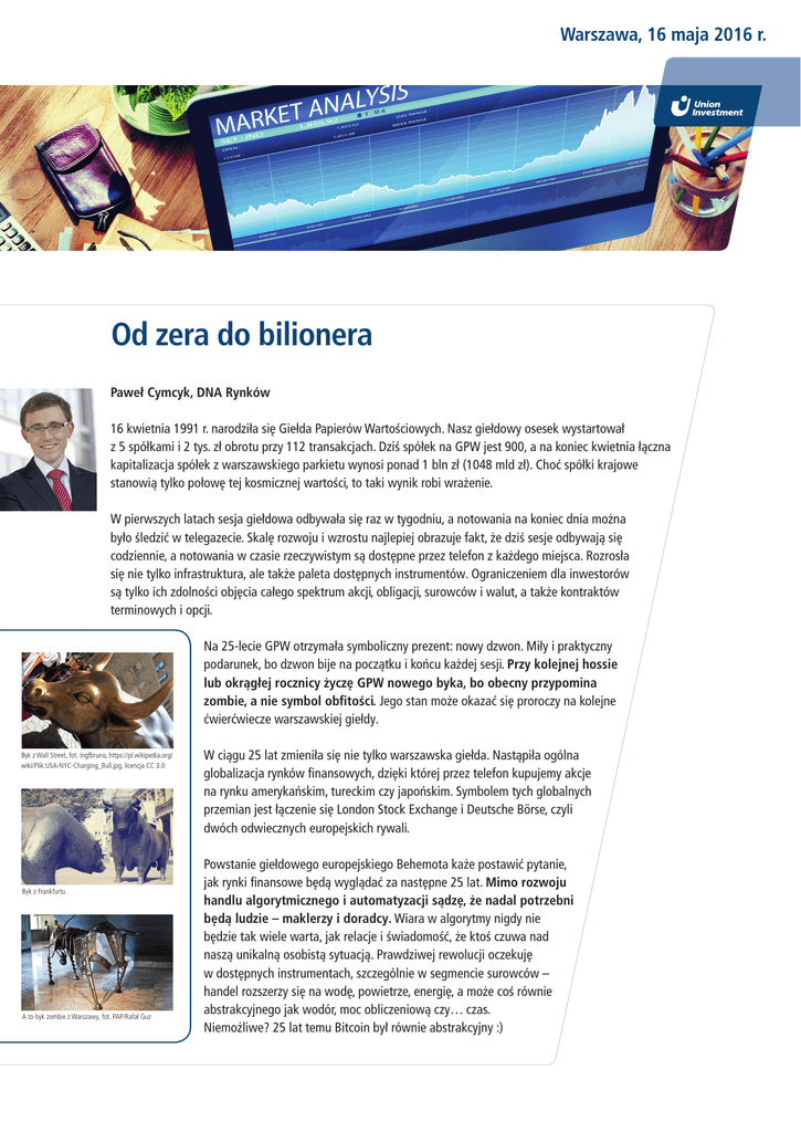 Warszawa, 16 maja 2016 r. Od zera do bilionera Paweł Cymcyk, DNA Rynków 16 kwietnia 1991 r. narodziła się Giełda Papierów Wartościowych. Nasz giełdowy osesek wystartował z 5 spółkami i 2 tys. zł obrotu przy 112 transakcjach. Dziś spółek na GPW jest 900, a na koniec kwietnia łączna kapitalizacja spółek z warszawskiego parkietu wynosi ponad 1 bln zł (1048 mld zł). Choć spółki krajowe stanowią tylko połowę tej kosmicznej wartości, to taki wynik robi wrażenie. W pierwszych latach sesja giełdowa odbywała się raz w tygodniu, a notowania na koniec dnia można było śledzić w telegazecie. Skalę rozwoju i wzrostu najlepiej obrazuje fakt, że dziś sesje odbywają się codziennie, a notowania w czasie rzeczywistym są dostępne przez telefon z każdego miejsca. Rozrosła się nie tylko infrastruktura, ale także paleta dostępnych instrumentów. Ograniczeniem dla inwestorów są tylko ich zdolności objęcia całego spektrum akcji, obligacji, surowców i walut, a także kontraktów terminowych i opcji. Na 25-lecie GPW otrzymała symboliczny prezent: nowy dzwon. Miły i praktyczny podarunek, bo dzwon bije na początku i końcu każdej sesji. Przy kolejnej hossie lub okrągłej rocznicy życzę GPW nowego byka, bo obecny przypomina zombie, a nie symbol obfitości. Jego stan może okazać się proroczy na kolejne ćwierćwiecze warszawskiej giełdy. Byk z Wall Street, fot. Ingfbruno, https://pl.wikipedia.org/ wiki/Plik:USA-NYC-Charging_Bull.jpg, licencja CC 3.0 Byk z Frankfurtu A to byk zombie z Warszawy, fot. PAP/Rafał Guz W ciągu 25 lat zmieniła się nie tylko warszawska giełda. Nastąpiła ogólna globalizacja rynków finansowych, dzięki której przez telefon kupujemy akcje na rynku amerykańskim, tureckim czy japońskim. Symbolem tych globalnych przemian jest łączenie się London Stock Exchange i Deutsche Börse, czyli dwóch odwiecznych europejskich rywali. Powstanie giełdowego europejskiego Behemota każe postawić pytanie, jak rynki finansowe będą wyglądać za następne 25 lat. Mimo rozwoju handlu algorytmicznego i automatyzacji sądzę, że nadal potrzebni będą ludzie – maklerzy i doradcy. Wiara w algorytmy nigdy nie będzie tak wiele warta, jak relacje i świadomość, że ktoś czuwa nad naszą unikalną osobistą sytuacją. Prawdziwej rewolucji oczekuję w dostępnych instrumentach, szczególnie w segmencie surowców – handel rozszerzy się na wodę, powietrze, energię, a może coś równie abstrakcyjnego jak wodór, moc obliczeniową czy… czas. Niemożliwe? 25 lat temu Bitcoin był równie abstrakcyjny :) Warszawa, 16 maja 2016 r. Kolejna zmiana to przeniesienie handlu do rzeczywistości wirtualnej. Po co 6 monitorów z setkami wykresów, kiedy zakładając okulary 3D, momentalnie przeniesiemy się w samo serce globalnego rynku. A tam zlecenia już będziemy składać rękami. A jak Twoim zdaniem będzie wyglądać warszawski i globalny rynek finansowy za 25 lat? Zapraszam do dyskusji.