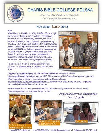 CHARIS BIBLE COLLEGE POLSKA Usłysz Jego głos. Znajdź swoje powołanie... Pójdź drogą swojego przeznaczenia. Newsletter Lato 2013 Witaj. Wróciliśmy do Polski z podróży do USA. Wakacje były okazją do spotkania z naszą rodziną i przyjaciółmi, za którymi bardzo tęskniliśmy. Mieliśmy też wiele ważnych spotkań w CBC Colorado. Spotkaliśmy się z Andrew, który z radością słuchał o tym jak rozwija się szkoła w Łodzi. Spędziliśmy wiele godzin z dyrektorami innych szkół CBC na świecie. Mogliśmy wymieniać się spostrzeżeniami o tym jak zmienia ludzi głoszone Słowo Boże. Usłyszeliśmy wiele niesamowitych świadectw Bożego działania. Byliśmy tym bardzo zbudowani i poruszeni. To były wspaniałe wakacje! Po powrocie do Polski z energią zabraliśmy się do pracy. Przygotowujemy już zajęcia dla I i II roku szkoły. Ewa, Andrew, Joseph Ciągle przyjmujemy zapisy na rok szkolny 2013/2014. Na naszej stronie http://cbcpolska.com/rekrutacja-na-rok-2013-2014/ są wszystkie informacje dotyczące rekrutacji. Wśród materiałów dostępnych na stronie jest przykładowa lekcja http://cbcpolska.com/szkola/program/dzinne/, zachęcamy do zapoznania się z nią - to próbka nauczania jakie dostaniesz w naszej szkole. Jeśli zastanawiasz się nad przyjściem do CBC lub wahasz się, zadzwoń do nas lub napisz. Chętnie odpowiemy na wszystkie Twoje pytania. Pozdrawiamy Cię serdecznie Ewa i Joseph Joseph i Ken - dyrektor CBC Phoenix USA Andrew i kubek od studentów z CBC Polska www.CBCPolska.com kom 533-999-139 Ewa i Jamie [email protected] ul. Gdańska 80 90-613 Łódż