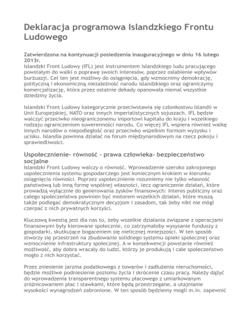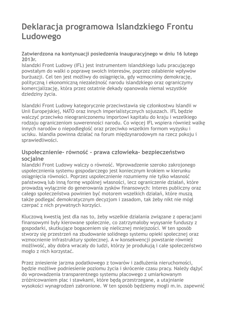 Deklaracja programowa Islandzkiego Frontu Ludowego Zatwierdzona na kontynuacji posiedzenia inauguracyjnego w dniu 16 lutego 2013r. Islandzki Front Ludowy (IFL) jest instrumentem islandzkiego ludu pracującego powstałym do walki o poprawę swoich interesów, poprzez osłabienie wpływów burżuazji. Cel ten jest możliwy do osiągnięcia, gdy wzmocnimy demokrację, polityczną i ekonomiczną niezależność narodu islandzkiego oraz ograniczymy komercjalizację, która przez ostatnie dekady opanowała niemal wszystkie dziedziny życia. Islandzki Front Ludowy kategorycznie przeciwstawia się członkostwu Islandii w Unii Europejskiej, NATO oraz innych imperialistycznych sojuszach. IFL będzie walczyć przeciwko nieograniczonemu importowi kapitału do kraju i wszelkiego rodzaju ograniczeniom suwerenności narodu. Co więcej IFL wspiera również walkę innych narodów o niepodległość oraz przeciwko wszelkim formom wyzysku i ucisku. Islandia powinna działać na forum międzynarodowym na rzecz pokoju i sprawiedliwości. Uspołecznienie- równość - prawa człowieka- bezpieczeństwo socjalne Islandzki Front Ludowy walczy o równość. Wprowadzenie szeroko zakrojonego uspołecznienia systemu gospodarczego jest koniecznym krokiem w kierunku osiągnięcia równości. Poprzez uspołecznienie rozumiemy nie tylko własność państwową lub inną formę wspólnej własności, lecz ograniczenie działań, które prowadzą wyłącznie do generowania zysków finansowych: Interes publiczny oraz całego społeczeństwa powinien być motorem wszelkich działań, które muszą także podlegać demokratycznym decyzjom i zasadom, tak żeby nikt nie mógł czerpać z nich prywatnych korzyści. Kluczową kwestią jest dla nas to, żeby wszelkie działania związane z operacjami finansowymi były kierowane społecznie, co zatrzymałoby wysysanie funduszy z gospodarki, skutkujące bogaceniem się nielicznej mniejszości. W ten sposób stworzy się przestrzeń na zbudowanie solidnego systemu opieki społecznej oraz wzmocnienie infrastruktury społecznej. A w konsekwencji powstanie również możliwość, aby dobra wracały do ludzi, którzy je produkują i całe społeczeństwo mogło z nich korzystać. Przez zniesienie jarzma podatkowego z towarów i zadłużenia nieruchomości, będzie możliwe podniesienie poziomu życia i skrócenie czasu pracy. Należy dążyć do wprowadzenia transparentnego systemu płacowego z umiarkowanym zróżnicowaniem płac i stawkami, które będą przestrzegane, a utajnianie wysokości wynagrodzeń zabronione. W ten sposób będziemy mogli m.in. zapewnić równe płace dla obu płci i zapobiegać akumulacji kapitału oraz tworzeniu monopolu. Podstawowymi zasadami współżycia w społeczeństwie mają być równość i równouprawnienie. Wprowadzone zostaną rzeczywiste działania zapobiegające dyskryminacji ze względu na płeć, rasę, orientację seksualną, miejsce zamieszkania czy pozycję społeczną. Wyroki w sprawach spornych, także sądowe, będą wydawane bezpłatnie dla wszystkich stron, tak aby prawo do obrony nie było uzależnione od pozycji ekonomicznej. Wszystkim, którzy nie będą w stanie pracować na powszechnym rynku pracy zapewnione zostanie godne wsparcie, bez potrzeby opłacania funduszu emerytalnego. Zmienimy system emerytalny, który teraz zależny jest od podatków oraz akumulacji kapitału w funduszach, które maja być przeznaczone na wypłaty emerytur, a przez dekady były wykorzystywane do spekulacji na rynku finansowym i skazane są na utratę części inwestycji. W zamian oferujemy skoordynowany, powszechny system emerytalny, który zapewni identyczne świadczenia dla wszystkich, niezależnie od tego czy wymagają ich ze względu na wiek, niepełnosprawność, zły stan zdrowia, bezrobocie, czy z jakiejkolwiek innej przyczyny. Należy stworzyć wszelkie możliwości sprzyjające wykorzystywaniu swoich umiejętności w służbie społeczeństwu. Przejście na emeryturę powinno być elastyczne i do pewnego stopnia zależne od woli każdej osoby. Infrastruktura społeczna Islandzki Front Ludowy propaguje odbudowę systemu opieki zdrowotnej. Wzrost uspołecznienia w systemie gospodarczym stworzy możliwości przeznaczenia większych funduszy na opiekę zdrowotną. Należy stworzyć warunki ku temu, aby służba zdrowia zarządzana była społecznie lub przez instytucje publiczne i aby zwiększone fundusze były skuteczniej zagospodarowywane oraz dążyć do osiągniecia porozumienia z pracownikami służby zdrowia odnośnie odnowienia systemu. Naszym priorytetem jest to, aby każdy mógł skorzystać z bezpłatnej opieki zdrowotnej, której potrzebuje, zgodnie z możliwościami technicznymi i aktualnym stanem wiedzy oraz jak najbliżej swojego miejsca zamieszkania. Należy wzmocnić rolę opieki zdrowotnej i skupić większą uwagę na kwestiach związanych ze zdrowiem publicznym. Usługi stomatologiczne będą podlegać tym samym regułom, co służba zdrowia, a produkcja lekarstw oraz ich sprzedaż, staną się częścią powszechnego systemu opieki zdrowotnej. Islandzki Front Ludowy wspiera usprawnienie systemu edukacji. System szkolny powinien systematycznie pracować nad personalnym i społecznym rozwojem islandzkiej młodzieży w duchu sprawiedliwości i uczciwości. Nałożony zostanie nacisk na równy dostęp do edukacji i odpowiedniego kształcenia ustawicznego. Podstawą polityki edukacyjnej powinno być dążenie do tego, żeby edukacja stała się jednym ze standardów życia, do którego wszyscy mają prawo oraz w większym stopniu wartością społeczną niż towarem rynkowym. Postaramy się, aby model edukacji dopasowywany był do potrzeb i zdolności każdego człowieka. System szkolnictwa w kraju powinien być całkowicie powszechny i darmowy. Islandzki Front Ludowy popiera wzrost uspołecznienia, szczególnie kosztem komercjalizacji, zwłaszcza w obrębie usług publicznych, z których wszyscy korzystają oraz w zarządzaniu zas