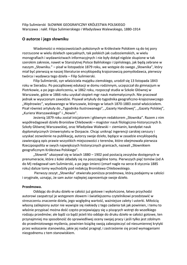 Filip Sulimierski SŁOWNIK GEOGRAFICZNY KRÓLESTWA POLSKIEGO Warszawa : nakł. Filipa Sulimierskiego i Władysława Walewskiego, 1880-1914 O autorze i jego słowniku Wiadomości o miejscowościach położonych w Królestwie Polskiem są do tej pory rozrzucone w wielu dziełach specyalnych, tak polskich jak cudzoziemskich, w wielu monografiach i wydawnictwach informacyjnych i nie były dotąd nigdzie skupione w tak szerokim zakresie, nawet w Starożytnej Polsce Balioskiego i Lipioskiego, jak będą zebrane w naszym „Słowniku.” – pisał w listopadzie 1879 roku, we wstępie do swego „Słownika”, który miał byd pierwszą w naszej literaturze encyklopedią krajoznawczą pomysłodawca, pierwszy twórca i wydawca tego dzieła – Filip Sulimierski. Filip Sulimierski, syn właściciela majątku ziemskiego, urodził się 13 listopada 1843 roku w Sieradzu. Po początkowej edukacji w domu rodzinnym, uczęszczał do gimnazjum w Piotrkowie, a po jego ukooczeniu, w 1862 roku, rozpoczął studia w Szkole Głównej w Warszawie, gdzie w 1866 roku uzyskał stopieo mgr nauk matematycznych. Nie pracował jednak w wyuczonym zawodzie. Pisywał artykuły do tygodnika geograficzno-krajoznawczego „Wędrowiec”, wydawanego w Warszawie, którego w latach 1870-1883 został właścicielem. Pisał również artykuły do „Tygodnika Ilustrowanego”, „Gazety Handlowej”, „Gazety Polskiej”, „Kuriera Warszawskiego” i „Nowin”. Jesienią 1879 roku został inicjatorem i głównym redaktorem „Słownika”. Razem z nim współredagowali dzieło Bronisław Chlebowski – magister nauk filologiczno-historycznych b. Szkoły Głównej Warszawskiej, oraz Władysław Walewski – ziemianin, kandydat nauk dyplomatycznych Uniwersytetu w Dorpacie. Chcąc uniknąd ingerencji carskiej cenzury i uzyskad zezwolenie na publikację, autorzy swoje dzieło, będące w zasadzie encyklopedią zawierającą opis prawie wszystkich miejscowości z terenów, które obejmowała pierwsza Rzeczpospolita w swych największych historycznych granicach, nazwali „Słownikiem geograficznym Królestwa Polskiego”. „Słownik” ukazywał się w latach 1880 – 1902 pod postacią zeszytów dostępnych w prenumeracie, które z kolei składały się na poszczególne tomy. Pierwszych pięd tomów (od A do M) redagował sam Sulimierski, a po jego śmierci (zmarł nagle na serce 8 stycznia 1885 roku) dalsze tomy wychodziły pod redakcją Bronisława Chlebowskiego. Pierwszy zeszyt „Słownika” otwierała poniższa przedmowa, którą podajemy w całości i oryginale, uznając, że sam autor najlepiej zaprezentuje swoje dzieło. Przedmowa. Oddając do druku dzieło w całości już gotowe i wykooczone, łatwo przychodzi autorowi zaopatrzyd je wstępnem słowem i światlejszemu czytelnikowi przedstawid w streszczeniu znaczenie dzieła, jego względną wartośd, ważniejsze zalety i usterki. Miłością własną zaślepiony autor nie wywiąże się niekiedy z tego zadania tak jak powinien, i temu to właśnie przypisad można dośd często przejawiający się u piszących wstręt do wszelkiego rodzaju przedmów; ale bądź co bądź jeżeli kto oddaje do druku dzieło w całości gotowe, ten przynajmniej ma sposobnośd do sprawiedliwej oceny swojej pracy i jeśli tylko jest zdolnym do przedmiotowego myślenia, powinien książkę swoją zabezpieczyd od niesumiennej krytyki przez wskazanie stanowiska, jakie jej nadad pragnął, i zastrzeżenie się przed wymaganiami niezgodnemu z tem stanowiskiem. Redakcya naszego Słownika trudniejsze ma zadanie w tej chwili, bo jakkolwiek mamy poza sobą jasno wytknięty cel i mnóstwo nagromadzonych środków, które do tego celu doprowadzid nas mają, to jednakże przed nami jeszcze większa częśd pracy, zbiorowej, nawet w pewnym stopniu luźnej, a od wykonania tej pracy, od codziennej, mrówczej roboty wielu osób rozproszonych po świecie zależed będzie wartośd tego, co w niniejszej przedmowie powinniśmy określid, przedstawid i zalecid czytelnikom polskim. W takich warunkach byłoby może najlepiej zrzec się przedmowy; w danym atoli wypadku jest to rzeczą niemożliwą, i chociażbyśmy się mieli ograniczyd na prostym objaśnieniu celu i formy ,,Słownika,” parę słów czytelnikowi jesteśmy dłużni. Do dzieła naszego, stosownie do programu zatwierdzonego przez Wydział Prasy, wejdą: Wszystkie miejscowości położone w Królestwie Polskiem. Wszystkie ważniejsze miejscowości w guberniach Nadbałtyckich, Zachodnich i Południowych Cesarstwa Rossyjskiego. Miasta gubernialne, stacye pocztowe, telegraficzne i stacye dróg żelaznych w pozostałych guberniach Rossyi Europejskiej. Wszystkie ważniejsze miejscowości Prus Zachodnich i Wschodnich, W. Ks. Poznaoskiego i Szląska Pruskiego ze szczególnym względem na słowiaoskie nazwy miejscowości, dziś zniemczone. Wszystkie ważniejsze miejscowości Galicyi, Szląska Austryackiego, Morawy, słowackich komitatów Węgier, Bukowiny, także z uwzględnieniem dokładności w nomenklaturze okolic, które uległy wpływowi: germanizacyi, madziaryzacyi i romanizacyi Dokładna hydrografia i orografia wymienionych powyżej krajów. Wszystkie miejscowości będą opisane pod względem geograficznym, statystycznym, społecznym (szkoły, stosunki religijne, przemysł, komunikacye, handel), historycznym (założenie miejscowości, wypadki ważniejsze, przechodzenie z rąk do rąk) i archeologicznym. Wiadomości te, rozrzucone w wielu dziełach specyalnych, tak polskich jak cudzoziemskich, w wielu monografiach i wydawnictwach informacyjnych, nie były dotąd nigdzie skupione w tak szerokim zakresie, nawet w Starożytnej Polsce Balioskiego i Lipioskiego, jak będą zebrane w naszym „Słowniku.” Chcąc się zbliżyd ile możności do wyczerpującego w zakresie ziemioznawczym obrazu, gromadziliśmy wiadomości statystyczne, społeczne, historyczne a nawet po części etnograficzne, ażeby „Słownik” był raczej „Encyklopedyą” krajo