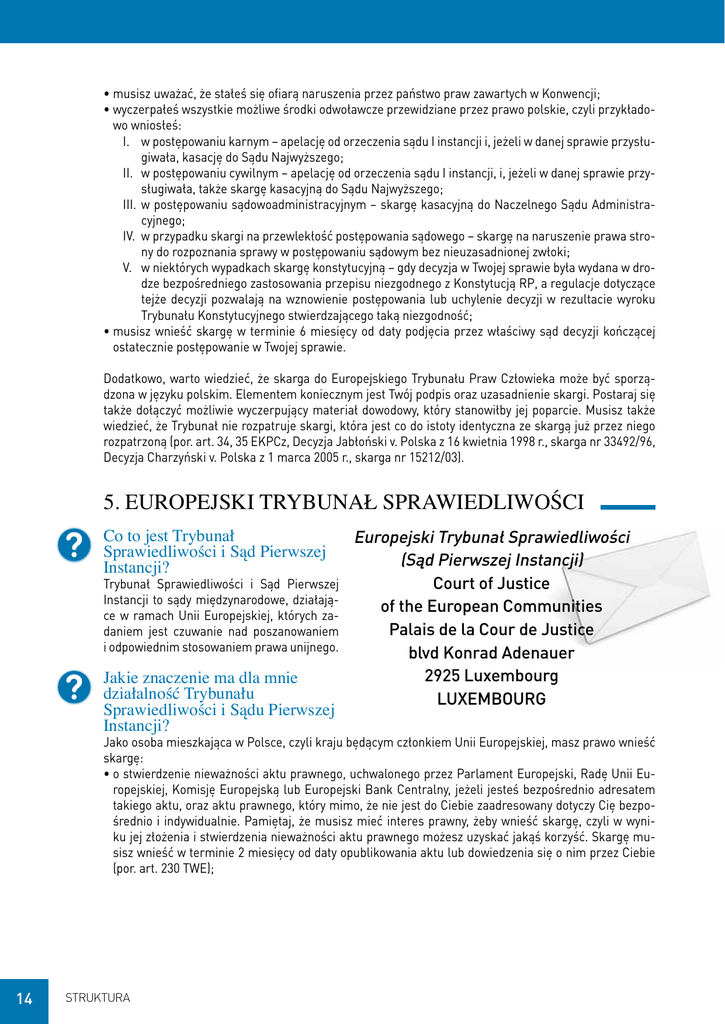 •m usisz uważać, że stałeś się ofiarą naruszenia przez państwo praw zawartych w Konwencji; •w yczerpałeś wszystkie możliwe środki odwoławcze przewidziane przez prawo polskie, czyli przykładowo wniosłeś: I.w postępowaniu karnym – apelację od orzeczenia sądu I instancji i, jeżeli w danej sprawie przysługiwała, kasację do Sądu Najwyższego; II.w postępowaniu cywilnym – apelację od orzeczenia sądu I instancji, i, jeżeli w danej sprawie przysługiwała, także skargę kasacyjną do Sądu Najwyższego; III.w postępowaniu sądowoadministracyjnym – skargę kasacyjną do Naczelnego Sądu Administracyjnego; IV.w przypadku skargi na przewlekłość postępowania sądowego – skargę na naruszenie prawa strony do rozpoznania sprawy w postępowaniu sądowym bez nieuzasadnionej zwłoki; V.w niektórych wypadkach skargę konstytucyjną – gdy decyzja w Twojej sprawie była wydana w drodze bezpośredniego zastosowania przepisu niezgodnego z Konstytucją RP, a regulacje dotyczące tejże decyzji pozwalają na wznowienie postępowania lub uchylenie decyzji w rezultacie wyroku Trybunału Konstytucyjnego stwierdzającego taką niezgodność; • musisz wnieść skargę w terminie 6 miesięcy od daty podjęcia przez właściwy sąd decyzji kończącej ostatecznie postępowanie w Twojej sprawie. Dodatkowo, warto wiedzieć, że skarga do Europejskiego Trybunału Praw Człowieka może być sporządzona w języku polskim. Elementem koniecznym jest Twój podpis oraz uzasadnienie skargi. Postaraj się także dołączyć możliwie wyczerpujący materiał dowodowy, który stanowiłby jej poparcie. Musisz także wiedzieć, że Trybunał nie rozpatruje skargi, która jest co do istoty identyczna ze skargą już przez niego rozpatrzoną (por. art. 34, 35 EKPCz, Decyzja Jabłoński v. Polska z 16 kwietnia 1998 r., skarga nr 33492/96, Decyzja Charzyński v. Polska z 1 marca 2005 r., skarga nr 15212/03). 5. EUROPEJSKI TRYBUNAŁ SPRAWIEDLIWOŚCI Co to jest Trybunał Sprawiedliwości i Sąd Pierwszej Instancji? Trybunał Sprawiedliwości i Sąd Pierwszej Instancji to sądy międzynarodowe, działające w ramach Unii Europejskiej, których zadaniem jest czuwanie nad poszanowaniem i odpowiednim stosowaniem prawa unijnego. Jakie znaczenie ma dla mnie działalność Trybunału Sprawiedliwości i Sądu Pierwszej Instancji? Europejski Trybunał Sprawiedliwości (Sąd Pierwszej Instancji) Court of Justice of the European Communities Palais de la Cour de Justice blvd Konrad Adenauer 2925 Luxembourg LUXEMBOURG Jako osoba mieszkająca w Polsce, czyli kraju będącym członkiem Unii Europejskiej, masz prawo wnieść skargę: • o stwierdzenie nieważności aktu prawnego, uchwalonego przez Parlament Europejski, Radę Unii Europejskiej, Komisję Europejską lub Europejski Bank Centralny, jeżeli jesteś bezpośrednio adresatem takiego aktu, oraz aktu prawnego, który mimo, że nie jest do Ciebie zaadresowany dotyczy Cię bezpośrednio i indywidualnie. Pamiętaj, że musisz mieć interes prawny, żeby wnieść skargę, czyli w wyniku jej złożenia i stwierdzenia nieważności aktu prawnego możesz uzyskać jakąś korzyść. Skargę musisz wnieść w terminie 2 miesięcy od daty opublikowania aktu lub dowiedzenia się o nim przez Ciebie (por. art. 230 TWE); 14 STRUKTURA •n a bezczynność instytucji unijnej (Parlament Europejski, Komisja Europejska, Rada Unii Europejskiej, Europejski Bank Centralny) w sytuacji, gdy nie wydała aktu prawnego skierowanego do Ciebie, do wydania którego była zobowiązana; obowiązek wydania aktu prawnego musi być wystarczająco konkretny (musi być dokładnie wiadomo o wydanie jakiego aktu chodzi) oraz należy wskazać jego treść (co konkretnie w danym akcie miało być zawarte) (por. art. 232 TWE). Jaka jest procedura składania skargi? Skargę na dany akt instytucji unijnej lub jego brak powinieneś skierować do Sądu Pierwszej Instancji. W skardze musisz zawrzeć następujące informacje: • T woje imię i nazwisko oraz miejsce zamieszkania, •w skazanie instytucji, która według Ciebie dopuściła się naruszenia prawa wspólnotowego, • p rzedmiot sporu oraz zwięzłe przedstawienie powołanych zarzutów, • T woje żądanie, •w nioski dowodowe (por. art. 38 § 1 regulaminu ETS). Jeżeli Trybunał Sprawiedliwości przyzna Ci rację w kwestii, której dotyczy złożona przez Ciebie skarga, orzeknie on o nieważności aktu, którego skarga dotyczy. Może także nałożyć na stronę oskarżoną obowiązek określonego działania, w tym także w uzasadnionych wypadkach – przyznania Ci odszkodowania (por. art. 230, 232, 288 TWE). STRUKTURA 15