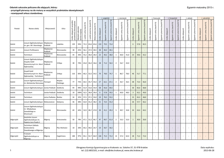 Odsetek sukcesów policzono dla zdających, którzy: - przystąpili pierwszy raz do matury ze wszystkich przdmiotów obowiązkowych - rozwiązywali arkusz standardowy Egzamin maturalny 2013 r. J. ukraiński Egzamin pisemny (wynik %) Liczba zdających Egzamin ustny (wynik %) Egzamin pisemny (wynik %) Liczba zdających Egzamin ustny (wynik %) Egzamin pisemny (wynik %) Liczba zdających Egzamin ustny (wynik %) Egzamin pisemny (wynik %) Liczba zdających Egzamin ustny (wynik %) Egzamin pisemny (wynik %) Liczba zdających Egzamin ustny (wynik %) Egzamin pisemny (wynik %) Liczba zdających Egzamin ustny (wynik %) Egzamin pisemny (wynik %) Lubelska 139 94% 72,3 63,6 65,6 133 79,5 73,4 - - - 6 57,8 82,5 - - - - - - - - - - - - Warszawska 38 45% 56,1 37,5 28,5 38 40,2 40,1 - - - - - - - - - - - - - - - - - - Warszawska 44 36% 55,2 38,4 28,3 22 40,2 38,0 1 60,0 41,0 23 39,6 42,2 - - - - - - - - - - - - bialski Liceum Ogólnokształcące Zespołu Szkół Międzyrzec Ekonomicznych im. Marii Podlaski Dąbrowskiej 3 Maja 30 70% 65,8 46,2 36,6 28 71,2 56,5 2 56,7 42,0 - - - - - - - - - - - - - - - bialski Zespół Szkół Międzyrzec Ekonomicznych im. Marii Podlaski Dąbrowskiej - Technikum 3 Maja 116 83% 66,3 52,5 54,5 70 78,0 74,7 1 86,7 78,0 46 51,7 77,1 - - - - - - - - - - - - bialski Liceum Ogólnokształcące Terespol im. Bohaterów Warszawy Wojska Polskiego 77 75% 64,5 45,7 44,4 27 62,1 67,1 2 36,7 36,5 48 72,4 66,0 - - - - - - - - - - - - bialski Liceum Ogólnokształcące Janów Podlaski Siedlecka 94 90% 61,9 53,6 54,4 58 65,6 69,5 - - - 36 82,6 68,8 - - - - - - - - - - - - bialski Technikum Janów Podlaski Siedlecka 10 100% 52,5 38,4 39,4 6 57,8 59,5 1 60,0 48,0 3 62,2 49,0 - - - - - - - - - - - - bialski Technikum Leśna Podlaska Bialska 34 32% 57,5 37,1 33,0 19 76,5 55,5 - - - 15 65,3 48,0 - - - - - - - - - - - - bialski Liceum Ogólnokształcące Małaszewicze Kolejarzy 46 48% 62,0 41,2 38,2 21 72,5 55,3 - - - 26 57,7 66,2 - - - - - - - - - - - - bialski Liceum Ogólnokształcące im. Władysława Wisznice Zawadzkiego w Wisznicach Warszawska 69 64% 52,9 48,7 47,8 30 41,1 49,3 5 40,7 33,8 34 63,4 64,2 - - - - - - - - - - - - biłgorajski Katolickie Liceum Ogólnokształcące im. Papieża Jana Pawła II Krzeszowska 50 78% 67,1 52,2 46,7 47 69,7 61,4 2 33,3 52,0 1 30,0 20,0 - - - - - - - - - - - - biłgorajski Technikum Zakładu Doskonalenia Biłgoraj Zawodowego w Biłgoraju Plac Wolności 10 30% 85,5 40,5 24,7 10 50,7 36,5 - - - - - - - - - - - - - - - - - - biłgorajski II Liceum Ogólnokształcące w Biłgoraju Cegielniana 188 97% 83,1 52,7 66,9 146 75,3 72,2 14 57,4 62,0 28 71,3 72,4 - - - - - - - - - - - - Powiat Nazwa szkoły Miejscowość bialski Liceum Ogólnokształcące Międzyrzec im. gen. Wł. Sikorskiego Podlaski bialski Liceum Profilowane bialski Technikum 1 Międzyrzec Podlaski Międzyrzec Podlaski Biłgoraj Biłgoraj Ulica Matematyka (wynik %) Egzamin ustny (wynik %) J. włoski Liczba zdających J. hiszpański J. polski pisemny (wynik %) J. francuski J. polski ustny (wynik %) J. rosyjski Odsetek sukcesów termin majowy J. niemiecki Liczba zdających wszystkie przedmioty obowiązkowe J. angielski Okręgowa Komisja Egzaminacyjna w Krakowie: os. Szkolne 37, 31-978 Kraków tel. (12) 6832101, e-mail: [email protected], www.oke.krakow.pl Data wydruku: 2013-06-28 Odsetek sukcesów policzono dla zdających, którzy: - przystąpili pierwszy raz do matury ze wszystkich przdmiotów obowiązkowych - rozwiązywali arkusz standardowy Egzamin maturalny 2013 r. Egzamin ustny (wynik %) Egzamin pisemny (wynik %) Liczba zdających Egzamin ustny (wynik %) Egzamin pisemny (wynik %) Liczba zdających Egzamin ustny (wynik %) Egzamin pisemny (wynik %) Liczba zdających Egzamin ustny (wynik %) Egzamin pisemny (wynik %) Liczba zdających Egzamin ustny (wynik %) Egzamin pisemny (wynik %) Liczba zdających Egzamin ustny (wynik %) Egzamin pisemny (wynik %) Liczba zdających Egzamin ustny (wynik %) Egzamin pisemny (wynik %) 53 92% 71,7 46,0 56,9 47 70,6 62,1 - - - 6 47,8 54,8 - - - - - - - - - - - - Biłgoraj Polna 59 83% 67,9 51,3 50,7 57 57,6 68,0 2 33,3 36,3 - - 16,0 - - - - - - - - - - - - Biłgoraj Przemysłowa 55 47% 78,7 39,6 36,1 43 58,7 49,9 1 33,3 24,0 11 64,8 60,2 - - - - - - - - - - - - Ulica Matematyka (wynik %) Liczba zdających biłgorajski J. ukraiński J. włoski Cegielniana Miejscowość Technikum Budowlane w Biłgoraj Biłgoraju Technikum Leśne III Liceum Ogólnokształcące im. Armii Krajowej w Biłgoraju J. hiszpański J. polski pisemny (wynik %) biłgorajski J. francuski J. polski ustny (wynik %) biłgorajski Nazwa szkoły J. rosyjski Odsetek sukcesów termin majowy Powiat J. niemiecki Liczba zdających wszystkie przedmioty obowiązkowe J. angielski biłgorajski Technikum w Biłgoraju Biłgoraj Przemysłowa 72 36% 79,6 37,5 31,8 63 61,5 45,7 - - 20,0 9 42,6 47,0 - - - - - - - - - - - - biłgorajski Uzupełniające Liceum Ogólnokształcące w Biłgoraju Biłgoraj Przemysłowa 15 40% 63,0 39,1 29,6 8 47,9 44,8 1 63,3 34,0 6 51,7 49,2 - - - - - - - - - - - - biłgorajski Liceum Ogólnokształcące im. Organizacji Narodów Biłgoraj Zjednoczonych w Biłgoraju Kościuszki 353 99% 92,2 63,8 80,1 326 86,9 83,4 6 82,2 80,3 20 85,8 86,0 - - - 1 93,3 97,0 - - - - - - biłgorajski II Liceum Profilowane w Regionalnym Centrum Edukacji Zawodowej w Biłgoraju Biłgoraj Kościuszki 50 74% 76,1 45,5 47,7 42 52,0 46,2 3 10,0 31,0 6 61,7 59,0 - - - - - - - - - - - - biłgorajski Technikum MechanicznoElektryczne w Regionalnym Centrum Biłgoraj Edukacji Zawodowej w Biłgoraju Kościuszki 158 78% 74,3 44,4 58,7 135 66,9 64,5 - - - 24 63,5 56,7 - - - - - - - - - - - - biłgorajski Uzupełniające Liceum Ogólnokształcące Nr 2 w Regionalnym Centrum Biłgoraj Edukacji Zawodowej w Biłgoraju Kościuszki 7 57% 61,9 37,1 33,3 7 61,0 48,3 - - - - - - - - - - - - - - - - - - biłgorajski Samorządowy Zespół Szkół - Liceum Ogólnokształcące w Józefowie Broniewskiego 19 84% 81,3 48,6 47,7 11 74,5 67,9 - -