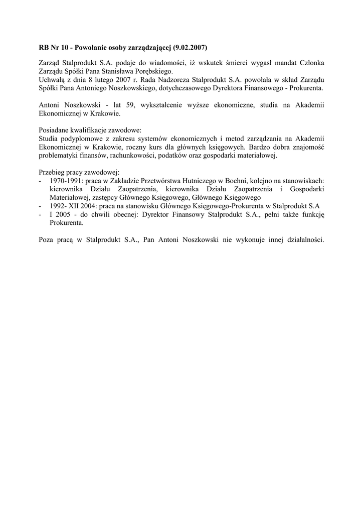 RB Nr 10 - Powołanie osoby zarządzającej (9.02.2007) Zarząd Stalprodukt S.A. podaje do wiadomości, iż wskutek śmierci wygasł mandat Członka Zarządu Spółki Pana Stanisława Porębskiego. Uchwałą z dnia 8 lutego 2007 r. Rada Nadzorcza Stalprodukt S.A. powołała w skład Zarządu Spółki Pana Antoniego Noszkowskiego, dotychczasowego Dyrektora Finansowego - Prokurenta. Antoni Noszkowski - lat 59, wykształcenie wyższe ekonomiczne, studia na Akademii Ekonomicznej w Krakowie. Posiadane kwalifikacje zawodowe: Studia podyplomowe z zakresu systemów ekonomicznych i metod zarządzania na Akademii Ekonomicznej w Krakowie, roczny kurs dla głównych księgowych. Bardzo dobra znajomość problematyki finansów, rachunkowości, podatków oraz gospodarki materiałowej. Przebieg pracy zawodowej: - 1970-1991: praca w Zakładzie Przetwórstwa Hutniczego w Bochni, kolejno na stanowiskach: kierownika Działu Zaopatrzenia, kierownika Działu Zaopatrzenia i Gospodarki Materiałowej, zastępcy Głównego Księgowego, Głównego Księgowego - 1992- XII 2004: praca na stanowisku Głównego Księgowego-Prokurenta w Stalprodukt S.A - I 2005 - do chwili obecnej: Dyrektor Finansowy Stalprodukt S.A., pełni także funkcję Prokurenta. Poza pracą w Stalprodukt S.A., Pan Antoni Noszkowski nie wykonuje innej działalności.