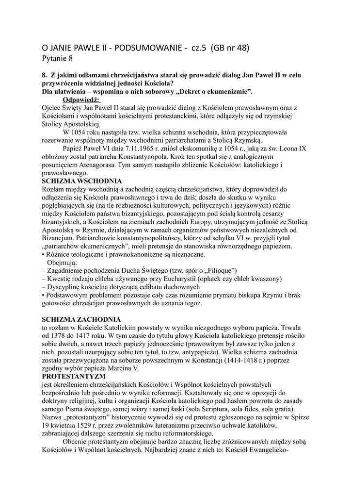 O JANIE PAWLE II - PODSUMOWANIE - cz.5 (GB nr 48) Pytanie 8 8. Z jakimi odłamami chrześcijaństwa starał się prowadzić dialog Jan Paweł II w celu przywrócenia widzialnej jedności Kościoła? Dla ułatwienia – wspomina o nich soborowy „Dekret o ekumenizmie”. Odpowiedź: Ojciec Święty Jan Paweł II starał się prowadzić dialog z Kościołem prawosławnym oraz z Kościołami i wspólnotami kościelnymi protestanckimi, które odłączyły się od rzymskiej Stolicy Apostolskiej. W 1054 roku nastąpiła tzw. wielka schizma wschodnia, która przypieczętowała rozerwanie wspólnoty między wschodnimi patriarchatami a Stolicą Rzymską. Papież Paweł VI dnia 7.11.1965 r. zniósł ekskomunikę z 1054 r., jaką za św. Leona IX obłożony został patriarcha Konstantynopola. Krok ten spotkał się z analogicznym posunięciem Atenagorasa. Tym samym nastąpiło zbliżenie Kościołów: katolickiego i prawosławnego. SCHIZMA WSCHODNIA Rozłam między wschodnią a zachodnią częścią chrześcijaństwa, który doprowadził do odłączenia się Kościoła prawosławnego i trwa do dziś; doszła do skutku w wyniku pogłębiających się (na tle rozbieżności kulturowych, politycznych i językowych) różnic między Kościołem państwa bizantyjskiego, pozostającym pod ścisłą kontrolą cesarzy bizantyjskich, a Kościołem na ziemiach zachodnich Europy, utrzymującym jedność ze Stolicą Apostolską w Rzymie, działającym w ramach organizmów państwowych niezależnych od Bizancjum. Patriarchowie konstantynopolitańscy, którzy od schyłku VI w. przyjęli tytuł „patriarchów ekumenicznych”, mieli pretensje do stanowiska równorzędnego papieżom. • Różnice teologiczne i prawnokanoniczne są nieznaczne. Obejmują: – Zagadnienie pochodzenia Ducha Świętego (tzw. spór o „Filioque”) – Kwestię rodzaju chleba używanego przy Eucharystii (opłatek czy chleb kwaszony) – Dyscyplinę kościelną dotyczącą celibatu duchownych • Podstawowym problemem pozostaje cały czas rozumienie prymatu biskupa Rzymu i brak gotowości chrześcijan prawosławnych do uznania tegoż. SCHIZMA ZACHODNIA to rozłam w Kościele Katolickim powstały w wyniku niezgodnego wyboru papieża. Trwała od 1378 do 1417 roku. W tym czasie do tytułu głowy Kościoła katolickiego pretensje rościło sobie dwóch, a nawet trzech papieży jednocześnie (prawowitym był zawsze tylko jeden z nich, pozostali uzurpujący sobie ten tytuł, to tzw. antypapieże). Wielka schizma zachodnia została przezwyciężona na soborze powszechnym w Konstancji (1414-1418 r.) poprzez zgodny wybór papieża Marcina V. PROTESTANTYZM jest określeniem chrześcijańskich Kościołów i Wspólnot kościelnych powstałych bezpośrednio lub pośrednio w wyniku reformacji. Kształtowały się one w opozycji do doktryny religijnej, kultu i organizacji Kościoła katolickiego pod hasłem powrotu do zasady samego Pisma świętego, samej wiary i samej łaski (sola Scriptura, sola fides, sola gratia). Nazwa „protestantyzm” historycznie wywodzi się od protestu zgłoszonego na sejmie w Spirze 19 kwietnia 1529 r. przez zwolenników luteranizmu przeciwko uchwale katolików, zabraniającej dalszego szerzenia się ruchu reformatorskiego. Obecnie protestantyzm obejmuje bardzo znaczną liczbę zróżnicowanych między sobą Kościołów i Wspólnot kościelnych. Najbardziej znane z nich to: Kościół Ewangelicko- Augsburski (luterański), Kościół Ewangelicko-Reformowany (kalwiński), Wspólnota Anglikańska, Kościół Zielonoświątkowy, Kościół Chrześcijan Baptystów, Kościół Ewangelicko-Metodystyczny, Kościół Adwentystów Dnia Siódmego, Religijne Towarzystwo Przyjaciół (kwakrzy). • Wyznawców protestanckich łączy: – uznawanie Biblii (Pisma Św.) za jedyne źródło Objawienia; negują oni rolę Tradycji, odrzucają także istotną część dogmatów katolickich (w sensie ścisłym jest to więc herezja); – przyjmowanie z sakramentów katolickich tylko chrztu świętego. Co prawda protestanci uznają także „Komunię świętą” czy „Wieczerzę Pańską” (odpowiednik Eucharystii), ale rozumieją ją istotnie inaczej niż Kościół katolicki, w szczególności zaprzeczają realnej obecności Chrystusa w Eucharystii; – nieuznawanie spowiedzi indywidualnej z rozgrzeszeniem i roli kapłana jako spowiednika; – odrzucenie kultu Maryi, kultu świętych, relikwii, odpustów, roli codziennej Mszy świętej, – zmniejszenie znaczenia duchownych, – nieuznawanie potrzeby istnienia zakonów i celibatu. Powstała w 1948 r. Światowa Rada Kościołów zmierza do nawiązania ścisłej współpracy wszystkich wyznań chrześcijańskich, zwłaszcza protestanckich. Kościół rzymskokatolicki nie jest członkiem tej Rady, ale od 30 lat z nią współpracuje. opracował Andrzej Witkowski