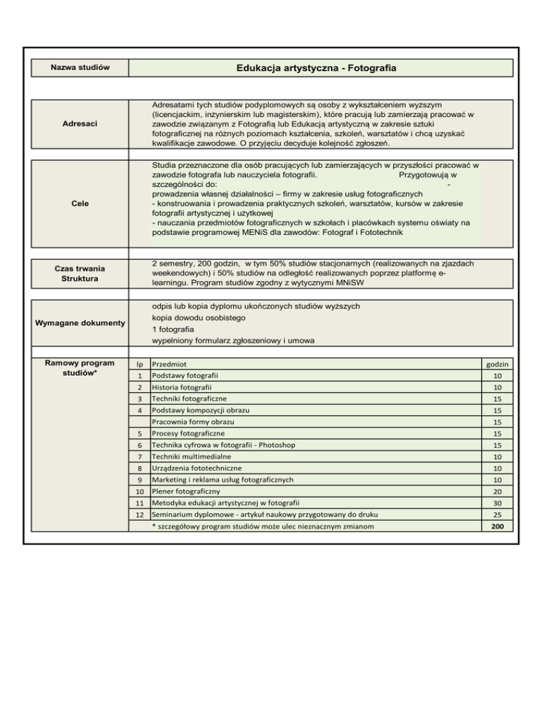 Edukacja artystyczna - Fotografia Nazwa studiów Adresatami tych studiów podyplomowych są osoby z wykształceniem wyższym (licencjackim, inżynierskim lub magisterskim), które pracują lub zamierzają pracować w zawodzie związanym z Fotografią lub Edukacją artystyczną w zakresie sztuki fotograficznej na różnych poziomach kształcenia, szkoleń, warsztatów i chcą uzyskać kwalifikacje zawodowe. O przyjęciu decyduje kolejność zgłoszeń. Adresaci Studia przeznaczone dla osób pracujących lub zamierzających w przyszłości pracować w zawodzie fotografa lub nauczyciela fotografii. Przygotowują w szczególności do: prowadzenia własnej działalności – firmy w zakresie usług fotograficznych - konstruowania i prowadzenia praktycznych szkoleń, warsztatów, kursów w zakresie fotografii artystycznej i użytkowej - nauczania przedmiotów fotograficznych w szkołach i placówkach systemu oświaty na podstawie programowej MENiS dla zawodów: Fotograf i Fototechnik Cele 2 semestry, 200 godzin, w tym 50% studiów stacjonarnych (realizowanych na zjazdach weekendowych) i 50% studiów na odległość realizowanych poprzez platformę elearningu. Program studiów zgodny z wytycznymi MNiSW Czas trwania Struktura odpis lub kopia dyplomu ukończonych studiów wyższych kopia dowodu osobistego Wymagane dokumenty Ramowy program studiów* 1 fotografia wypelniony formularz zgłoszeniowy i umowa lp 1 2 Przedmiot Podstawy fotografii godzin 10 3 Historia fotografii Techniki fotograficzne 15 10 4 Podstawy kompozycji obrazu 15 Pracownia formy obrazu 15 5 Procesy fotograficzne 15 6 Technika cyfrowa w fotografii - Photoshop 15 7 Techniki multimedialne 10 8 Urządzenia fototechniczne 10 9 Marketing i reklama usług fotograficznych 10 10 Plener fotograficzny 11 Metodyka edukacji artystycznej w fotografii 30 12 Seminarium dyplomowe - artykuł naukowy przygotowany do druku 25 * szczegółowy program studiów może ulec nieznacznym zmianom 20 200
