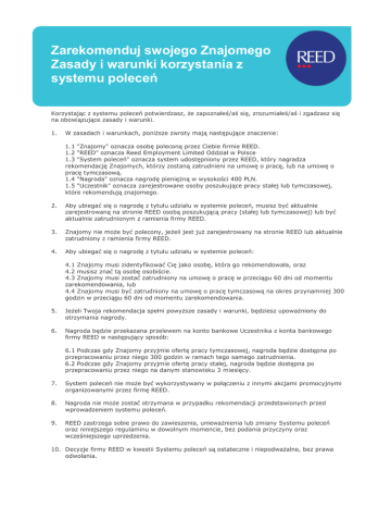 Zarekomenduj swojego Znajomego Zasady i warunki korzystania z systemu poleceń Korzystając z systemu poleceń potwierdzasz, że zapoznałeś/aś się, zrozumiałeś/aś i zgadzasz się na obowiązujące zasady i warunki. 1. W zasadach i warunkach, poniższe zwroty mają następujące znaczenie: 1.1 "Znajomy" oznacza osobę poleconą przez Ciebie firmie REED. 1.2 "REED" oznacza Reed Employment Limited Oddział w Polsce 1.3 "System poleceń" oznacza system udostępniony przez REED, który nagradza rekomendację Znajomych, którzy zostaną zatrudnieni na umowę o pracę, lub na umowę o pracę tymczasową. 1.4 "Nagroda" oznacza nagrodę pieniężną w wysokości 400 PLN. 1.5 "Uczestnik" oznacza zarejestrowane osoby poszukujące pracy stałej lub tymczasowej, które rekomendują znajomego. 2. Aby ubiegać się o nagrodę z tytułu udziału w systemie poleceń, musisz być aktualnie zarejestrowaną na stronie REED osobą poszukującą pracy (stałej lub tymczasowej) lub być aktualnie zatrudnionym z ramienia firmy REED. 3. Znajomy nie może być polecony, jeżeli jest już zarejestrowany na stronie REED lub aktualnie zatrudniony z ramienia firmy REED. 4. Aby ubiegać się o nagrodę z tytułu udziału w systemie poleceń: 4.1 Znajomy musi zidentyfikować Cię jako osobę, która go rekomendowała, oraz 4.2 musisz znać tą osobę osobiście. 4.3 Znajomy musi zostać zatrudniony na umowę o pracę w przeciągu 60 dni od momentu zarekomendowania, lub 4.4 Znajomy musi być zatrudniony na umowę o pracę tymczasową na okres przynamniej 300 godzin w przeciągu 60 dni od momentu zarekomendowania. 5. Jeżeli Twoja rekomendacja spełni powyższe zasady i warunki, będziesz upoważniony do otrzymania nagrody. 6. Nagroda będzie przekazana przelewem na konto bankowe Uczestnika z konta bankowego firmy REED w następujący sposób: 6.1 Podczas gdy Znajomy przyjmie ofertę pracy tymczasowej, nagroda będzie dostępna po przepracowaniu przez niego 300 godzin w ramach tego samego zatrudnienia. 6.2 Podczas gdy Znajomy przyjmie ofertę pracy stałej, nagroda będzie dostępna po przepracowaniu przez niego na danym stanowisku 3 miesięcy. 7. System poleceń nie może być wykorzystywany w połączeniu z innymi akcjami promocyjnymi organizowanymi przez firmę REED. 8. Nagroda nie może zostać otrzymana w przypadku rekomendacji przedstawionych przed wprowadzeniem systemu poleceń. 9. REED zastrzega sobie prawo do zawieszenia, unieważnienia lub zmiany Systemu poleceń oraz niniejszego regulaminu w dowolnym momencie, bez podania przyczyny oraz wcześniejszego uprzedzenia. 10. Decyzje firmy REED w kwestii Systemu poleceń są ostateczne i niepodważalne, bez prawa odwołania. 11. Firma REED nie odpowiada za żadne straty, koszty lub szkody związane w jakikolwiek sposób z udziałem w Systemie poleceń do maksymalnego poziomu określonego przez stosowne przepisy prawa. Ten paragraf nie może być interpretowany jako wykluczenie lub ograniczenie odpowiedzialności firmy REED za śmierć lub uszczerbek na zdrowiu spowodowany zaniedbaniem lub inną przyczyną, która nie może być wykluczona lub ograniczona zgodnie z obowiązującym prawem. 12. W Systemie poleceń nie mogą brać udziału pracownicy (ani członkowie ich rodzin) firmy REED i powiązanych z nią podmiotów. 13 Firma REED zastrzega sobie prawo do wykluczenia uczestnika Systemu poleceń, w przypadku podejrzenia o czerpanie korzyści z systemu przez danego uczestnika poprzez używanie innego imienia i nazwiska lub jakąkolwiek inną działalność, którą można uznać za podejmowaną w złej wierze. Firma REED może zdecydować o wykluczeniu Uczestnika z Systemu poleceń bez podania wyjaśnień. 14. Powyższe zasady i warunki będą interpretowane, rozumiane i wdrażane z całkowitym poszanowaniem prawa polskiego, a poprzez udział w systemie uczestnik poddaje się jurysdykcji sądów polskich.