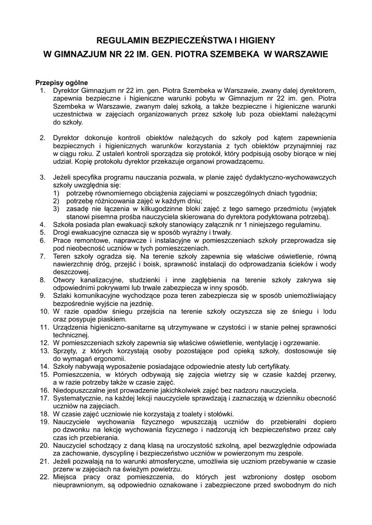 REGULAMIN BEZPIECZEŃSTWA I HIGIENY W GIMNAZJUM NR 22 IM. GEN. PIOTRA SZEMBEKA W WARSZAWIE Przepisy ogólne 1. Dyrektor Gimnazjum nr 22 im. gen. Piotra Szembeka w Warszawie, zwany dalej dyrektorem, zapewnia bezpieczne i higieniczne warunki pobytu w Gimnazjum nr 22 im. gen. Piotra Szembeka w Warszawie, zwanym dalej szkołą, a także bezpieczne i higieniczne warunki uczestnictwa w zajęciach organizowanych przez szkołę lub poza obiektami należącymi do szkoły. 2. Dyrektor dokonuje kontroli obiektów należących do szkoły pod kątem zapewnienia bezpiecznych i higienicznych warunków korzystania z tych obiektów przynajmniej raz w ciągu roku. Z ustaleń kontroli sporządza się protokół, który podpisują osoby biorące w niej udział. Kopię protokołu dyrektor przekazuje organowi prowadzącemu. 3. Jeżeli specyfika programu nauczania pozwala, w planie zajęć dydaktyczno-wychowawczych szkoły uwzględnia się: 1) potrzebę równomiernego obciążenia zajęciami w poszczególnych dniach tygodnia; 2) potrzebę różnicowania zajęć w każdym dniu; 3) zasadę nie łączenia w kilkugodzinne bloki zajęć z tego samego przedmiotu (wyjątek stanowi pisemna prośba nauczyciela skierowana do dyrektora podyktowana potrzebą). Szkoła posiada plan ewakuacji szkoły stanowiący załącznik nr 1 niniejszego regulaminu. Drogi ewakuacyjne oznacza się w sposób wyraźny i trwały. Prace remontowe, naprawcze i instalacyjne w pomieszczeniach szkoły przeprowadza się pod nieobecność uczniów w tych pomieszczeniach. Teren szkoły ogradza się. Na terenie szkoły zapewnia się właściwe oświetlenie, równą nawierzchnię dróg, przejść i boisk, sprawność instalacji do odprowadzania ścieków i wody deszczowej. Otwory kanalizacyjne, studzienki i inne zagłębienia na terenie szkoły zakrywa się odpowiednimi pokrywami lub trwale zabezpiecza w inny sposób. Szlaki komunikacyjne wychodzące poza teren zabezpiecza się w sposób uniemożliwiający bezpośrednie wyjście na jezdnię. W razie opadów śniegu przejścia na terenie szkoły oczyszcza się ze śniegu i lodu oraz posypuje piaskiem. Urządzenia higieniczno-sanitarne są utrzymywane w czystości i w stanie pełnej sprawności technicznej. W pomieszczeniach szkoły zapewnia się właściwe oświetlenie, wentylację i ogrzewanie. Sprzęty, z których korzystają osoby pozostające pod opieką szkoły, dostosowuje się do wymagań ergonomii. Szkoły nabywają wyposażenie posiadające odpowiednie atesty lub certyfikaty. Pomieszczenia, w których odbywają się zajęcia wietrzy się w czasie każdej przerwy, a w razie potrzeby także w czasie zajęć. Niedopuszczalne jest prowadzenie jakichkolwiek zajęć bez nadzoru nauczyciela. Systematycznie, na każdej lekcji nauczyciele sprawdzają i zaznaczają w dzienniku obecność uczniów na zajęciach. W czasie zajęć uczniowie nie korzystają z toalety i stołówki. Nauczyciele wychowania fizycznego wpuszczają uczniów do przebieralni dopiero po dzwonku na lekcję wychowania fizycznego i nadzorują ich bezpieczeństwo przez cały czas ich przebierania. Nauczyciel schodzący z daną klasą na uroczystość szkolną, apel bezwzględnie odpowiada za zachowanie, dyscyplinę i bezpieczeństwo uczniów w powierzonym mu zespole. Jeżeli pozwalają na to warunki atmosferyczne, umożliwia się uczniom przebywanie w czasie przerw w zajęciach na świeżym powietrzu. Miejsca pracy oraz pomieszczenia, do których jest wzbroniony dostęp osobom nieuprawnionym, są odpowiednio oznakowane i zabezpieczone przed swobodnym do nich 4. 5. 6. 7. 8. 9. 10. 11. 12. 13. 14. 15. 16. 17. 18. 19. 20. 21. 22. dostępem. 23. Schody wyposaża się w balustrady z poręczami zabezpieczonymi przed ewentualnym zsuwaniem się po nich. Stopnie schodów nie mogą być śliskie. 24. Otwartą przestrzeń pomiędzy biegami schodów zabezpiecza się siatką lub w inny skuteczny sposób. 25. W pomieszczeniach, w których odbywają się zajęcia, zapewnia się temperaturę, co najmniej 18°C. 26. Jeżeli nie jest możliwe zapewnienie temperatury, o której mowa w ust. 1, dyrektor zawiesza zajęcia na czas oznaczony, powiadamiając o tym organ prowadzący. 27. Dyrektor za zgodą organu prowadzącego może zawiesić zajęcia na czas oznaczony, jeżeli: 1) temperatura zewnętrzna mierzona o godz. 2100 w dwóch kolejnych dniach poprzedzających zawieszenie zajęć wynosi -15°C lub jest niższa; 2) wystąpiły na danym terenie zdarzenia, które mogą zagrozić zdrowiu uczniów. 28. Jeżeli pomieszczenie lub inne miejsce, w którym mają być prowadzone zajęcia, lub stan znajdującego się w nim wyposażenia stwarza zagrożenia dla bezpieczeństwa, niedopuszczalne jest rozpoczęcie zajęć. 29. Jeżeli stan zagrożenia powstanie lub ujawni się w czasie zajęć - niezwłocznie się je przerywa i wyprowadza się z zagrożonych miejsc osoby powierzone opiece szkoły. 30. Pomieszczenia szkoły, w szczególności pokój nauczycielski, pracownię chemiczną, pokój nauczycieli wychowania fizycznego, wyposaża się w apteczki zaopatrzone w środki niezbędne do udzielania pierwszej pomocy i instrukcję o zasadach udzielania tej pomocy. 31. Nauczyciele, w szczególności prowadzący zajęcia w pracowni chemicznej, a także zajęcia wychowania fizycznego, podlegają przeszkoleniu w zakresie udzielania pierwszej pomocy. 32. Udział uczniów w pracach na rzecz szkoły i środowiska może mieć miejsce po zaopatrzeniu ich w odpowiednie do wykonywanych prac urządzenia, sprzęt i środki ochrony indywidualnej oraz po zapewnieniu właściwego nadzoru i bezpiecznych warunków pracy. Dyżury podczas przerw 33. Przerwy w zajęciach uczniowie spędzają pod nadzorem nauczyciela wyznaczonego w grafiku do pełnienia dyżurów lub innego pracownika szkoły upoważnionego przez dyrektora. 34. Podczas dyżuru szczególną uwagę nauczyciele i pracownicy obsługi zwracają na newralgiczne punkty (toalety, okolice schodów, klatki schodowe). 35. Nauczyciele i p