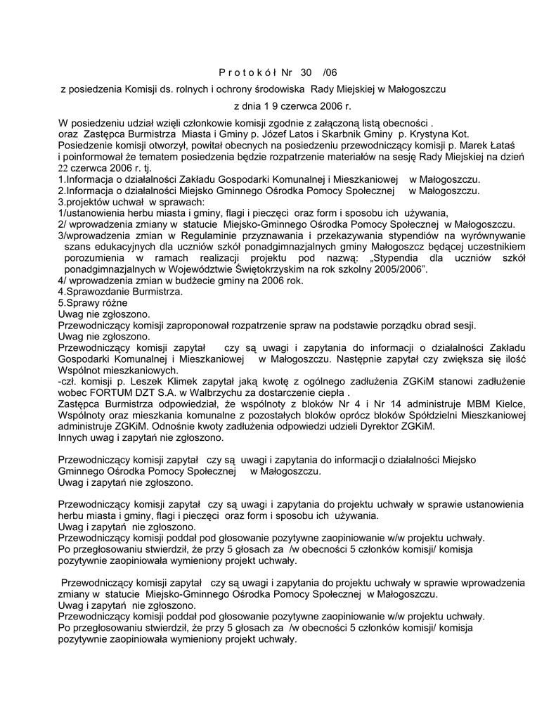P r o t o k ó ł Nr 30 /06 z posiedzenia Komisji ds. rolnych i ochrony środowiska Rady Miejskiej w Małogoszczu z dnia 1 9 czerwca 2006 r. W posiedzeniu udział wzięli członkowie komisji zgodnie z załączoną listą obecności . oraz Zastępca Burmistrza Miasta i Gminy p. Józef Latos i Skarbnik Gminy p. Krystyna Kot. Posiedzenie komisji otworzył, powitał obecnych na posiedzeniu przewodniczący komisji p. Marek Łataś i poinformował że tematem posiedzenia będzie rozpatrzenie materiałów na sesję Rady Miejskiej na dzień 22 czerwca 2006 r. tj. 1.Informacja o działalności Zakładu Gospodarki Komunalnej i Mieszkaniowej w Małogoszczu. 2.Informacja o działalności Miejsko Gminnego Ośrodka Pomocy Społecznej w Małogoszczu. 3.projektów uchwał w sprawach: 1/ustanowienia herbu miasta i gminy, flagi i pieczęci oraz form i sposobu ich używania, 2/ wprowadzenia zmiany w statucie Miejsko-Gminnego Ośrodka Pomocy Społecznej w Małogoszczu. 3/wprowadzenia zmian w Regulaminie przyznawania i przekazywania stypendiów na wyrównywanie szans edukacyjnych dla uczniów szkół ponadgimnazjalnych gminy Małogoszcz będącej uczestnikiem porozumienia w ramach realizacji projektu pod nazwą: „Stypendia dla uczniów szkół ponadgimnazjalnych w Województwie Świętokrzyskim na rok szkolny 2005/2006”. 4/ wprowadzenia zmian w budżecie gminy na 2006 rok. 4.Sprawozdanie Burmistrza. 5.Sprawy różne Uwag nie zgłoszono. Przewodniczący komisji zaproponował rozpatrzenie spraw na podstawie porządku obrad sesji. Uwag nie zgłoszono. Przewodniczący komisji zapytał czy są uwagi i zapytania do informacji o działalności Zakładu Gospodarki Komunalnej i Mieszkaniowej w Małogoszczu. Następnie zapytał czy zwiększa się ilość Wspólnot mieszkaniowych. -czł. komisji p. Leszek Klimek zapytał jaką kwotę z ogólnego zadłużenia ZGKiM stanowi zadłużenie wobec FORTUM DZT S.A. w Walbrzychu za dostarczenie ciepła . Zastępca Burmistrza odpowiedział, że wspólnoty z bloków Nr 4 i Nr 14 administruje MBM Kielce, Wspólnoty oraz mieszkania komunalne z pozostałych bloków oprócz bloków Spółdzielni Mieszkaniowej administruje ZGKiM. Odnośnie kwoty zadłużenia odpowiedzi udzieli Dyrektor ZGKiM. Innych uwag i zapytań nie zgłoszono. Przewodniczący komisji zapytał czy są uwagi i zapytania do informacji o działalności Miejsko Gminnego Ośrodka Pomocy Społecznej w Małogoszczu. Uwag i zapytań nie zgłoszono. Przewodniczący komisji zapytał czy są uwagi i zapytania do projektu uchwały w sprawie ustanowienia herbu miasta i gminy, flagi i pieczęci oraz form i sposobu ich używania. Uwag i zapytań nie zgłoszono. Przewodniczący komisji poddał pod głosowanie pozytywne zaopiniowanie w/w projektu uchwały. Po przegłosowaniu stwierdził, że przy 5 głosach za /w obecności 5 członków komisji/ komisja pozytywnie zaopiniowała wymieniony projekt uchwały. Przewodniczący komisji zapytał czy są uwagi i zapytania do projektu uchwały w sprawie wprowadzenia zmiany w statucie Miejsko-Gminnego Ośrodka Pomocy Społecznej w Małogoszczu. Uwag i zapytań nie zgłoszono. Przewodniczący komisji poddał pod głosowanie pozytywne zaopiniowanie w/w projektu uchwały. Po przegłosowaniu stwierdził, że przy 5 głosach za /w obecności 5 członków komisji/ komisja pozytywnie zaopiniowała wymieniony projekt uchwały. Przewodniczący komisji zapytał czy są uwagi i zapytania do projektu uchwały w sprawie wprowadzenia zmian w Regulaminie przyznawania i przekazywania stypendiów na wyrównywanie szans edukacyjnych dla uczniów szkół ponadgimnazjalnych gminy Małogoszcz będącej uczestnikiem porozumienia w ramach realizacji projektu pod nazwą: „Stypendia dla uczniów szkół ponadgimnazjalnych w Województwie Świętokrzyskim na rok szkolny 2005/2006”. Zastępca Burmistrza poinformował, że proponowane zmiany w regulaminie dotyczą zmiany zasad wypłaty stypendiów Unijnych. Uwag i zapytań nie zgłoszono. Przewodniczący komisji poddał pod głosowanie pozytywne zaopiniowanie w/w projektu uchwały. Po przegłosowaniu stwierdził, że przy 5 głosach za, /w obecności 5 członków komisji/ komisja pozytywnie zaopiniowała wymieniony projekt uchwały. Przewodniczący komisji zapytał czy są uwagi i zapytania do projektu uchwały w sprawie wprowadzenia zmian w budżecie gminy na rok 2006. Skarbnik MiG poinformowała, że są już przyznane środki ze ZPORR na inwestycję wodociągu Lipnica – Mniszek w wysokości 489.737,84 zł. ze środków Unijnych i ze środków krajowych 75.344,28 zł. .Była już kontrola odnośnie wykonanej inwestycji. Nie stwierdzono uwag. Następnie odczytała uzasadnienie do projektu uchwały. Ponadto poinformowała, że proponowane jest zwiększenie środków na drogi gminne i powiatowe w związku z tym że po przetargach wynikły wyższe kwoty na te zadania. Zastępca Burmistrza powiedział że aby nie ograniczać zakresu robót dróg zasadne jest zwiększenie środków na ten cel. -czł. komisji p. Sławomir Mikulski zapytał czy w przypadku radnego miesięczna kwota diety plus kwota diety za udział w posiedzeniach Gminnej Komisji Rozw. Probl. Alkoholowych nie przekracza kwoty możliwej do otrzymania przez radnego miesięcznie. Skarbnik odpowiedziała, że ryczałt miesięczny wypłacany radnemu a wynagrodzenie za posiedzenie GKRPA są to dwie różne sprawy i nie są ze sobą powiązane. Przew. komisji zapytał jakie koszty poniosła gmina na wodociąg Lipnica Mniszek. Skarbnik odpowiedziała, że na wodociąg Lipnica Mniszek otrzymaliśmy 75% kosztów inwestycji, natomiast wcześniej na wodociąg Złotniki otrzymaliśmy tylko 45% kosztów inwestycji. -Przew. komisji zapytał czy jest możliwość udzielenia pomocy finansowej dla mieszkańca Wygnanowa gdzie wystąpiło zdarzenie losowe -pożar w jego gospodarstwie. Skarbnik odpowiedziała, że jest taka możliwość poprzez Opiekę Społeczną do której tej pan powinien się zwrócić. Innych uwag 