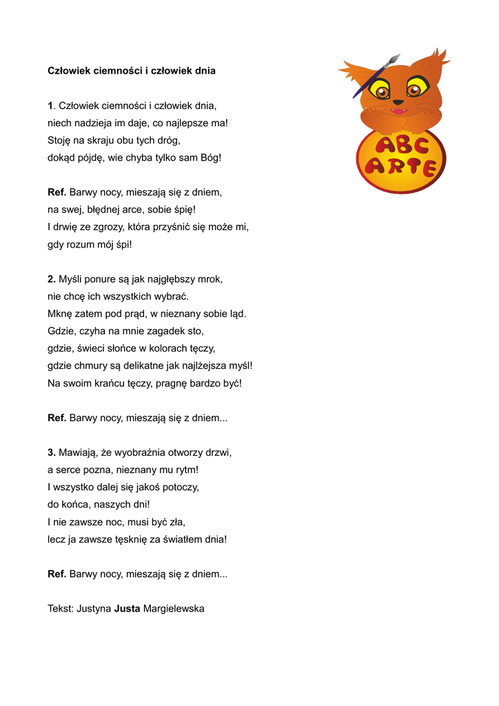 Człowiek ciemności i człowiek dnia 1. Człowiek ciemności i człowiek dnia, niech nadzieja im daje, co najlepsze ma! Stoję na skraju obu tych dróg, dokąd pójdę, wie chyba tylko sam Bóg! Ref. Barwy nocy, mieszają się z dniem, na swej, błędnej arce, sobie śpię! I drwię ze zgrozy, która przyśnić się może mi, gdy rozum mój śpi! 2. Myśli ponure są jak najgłębszy mrok, nie chcę ich wszystkich wybrać. Mknę zatem pod prąd, w nieznany sobie ląd. Gdzie, czyha na mnie zagadek sto, gdzie, świeci słońce w kolorach tęczy, gdzie chmury są delikatne jak najlżejsza myśl! Na swoim krańcu tęczy, pragnę bardzo być! Ref. Barwy nocy, mieszają się z dniem... 3. Mawiają, że wyobraźnia otworzy drzwi, a serce pozna, nieznany mu rytm! I wszystko dalej się jakoś potoczy, do końca, naszych dni! I nie zawsze noc, musi być zła, lecz ja zawsze tęsknię za światłem dnia! Ref. Barwy nocy, mieszają się z dniem... Tekst: Justyna Justa Margielewska