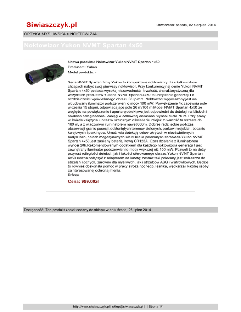 Siwiaszczyk.pl Utworzono: sobota, 02 sierpień 2014 OPTYKA MYŚLIWSKA > NOKTOWIZJA Noktowizor Yukon NVMT Spartan 4x50 Nazwa produktu: Noktowizor Yukon NVMT Spartan 4x50 Producent: Yukon Model produktu: Seria NVMT Spartan firmy Yukon to kompaktowe noktowizory dla użytkownikow chcących nabyć swoj pierwszy noktowizor. Przy konkurencyjnej cenie Yukon NVMT Spartan 4x50 posiada wysoką niezawodność i trwałość, charakterystyczną dla wszystkich produktow Yukona.NVMT Spartan 4x50 to urządzenie generacji I o rozdzielczości wyświetlanego obrazu 36 lp/mm. Noktowizor wyposażony jest we wbudowany iluminator podczerwieni o mocy 100 mW. Powiększenie 4x zapewnia pole widzenia 15 stopni, odpowiadające polu 26 m/100 m.Model NVMT Spartan 4x50 ze względu na powiększenie i aperturę obiektywu jest odpowiedni do detekcji na bliskich i średnich odległościach. Zasięg w całkowitej ciemności wynosi około 70 m. Przy pracy w świetle księżyca lub też w sztucznym oświetleniu miejskim wartość ta wzrasta do 180 m, a z włączonym iluminatorem nawet 600m. Dobrze radzi sobie podczas obserwacji granic posesji, odsłoniętych terenow zielonych, parkow miejskich, bocznic kolejowych i parkingow. Umożliwia detekcję celow ukrytych w nieoświetlonych budynkach, halach magazynowych lub w blisko położonych zaroślach.Yukon NVMT Spartan 4x50 jest zasilany baterią litową CR123A. Czas działania z iluminatorem wynosi 20h.Rekomendowanym dodatkiem dla każdego noktowizora generacji I jest zewnętrzny iluminator podczerwieni o mocy większej niż 100 mW. Pozwoli to na duży przyrost odległości detekcji, jak i jakości oferowanego obrazu.Yukon NVMT Spartan 4x50 można połączyć z adapterem na lunetę; zestaw taki polecany jest zwłaszcza do strzelań nocnych, zarowno dla myśliwych, jak i strzelcow ASG i wiatrowkowych. Będzie to rownież doskonała pomoc w pracy stroża nocnego, leśnika, wędkarza i każdej osoby zainteresowanej ochroną mienia. Cena: 999.00zł Dostępność: Ten produkt został dodany do sklepu w dniu środa, 23 lipiec 2014 http://www.siwiaszczyk.pl | [email protected] | | Strona 1/1