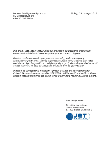 Luceos Intelligence Sp. z o.o. ul. Orzeszkowa 19 05-420 JÓZEFÓW Elbląg, 23. lutego 2015 Dla grupy JetSystem optymalizacja procesów zarządzania wszystkimi obszarami działalności swoich spółek jest procesem ciągłym. Bardzo dokładnie analizujemy nasze potrzeby, a do współpracy zapraszamy partnerów, którzy wykraczają poza ramy ogólnie przyjętej rzetelności i profesjonalizmu. Wiążemy się z tymi, dla których elastyczność i wizja rozwoju to coś, co znajduje się poza tym co jest "teraz". Dlatego do zarządzania kosztami i pracą, a także do koordynowania działań i komunikacją w obrębie SERWISU „WJSupport” wybraliśmy firmę Luceso Intelligence oraz jej portal wraz z aplikacją mobilną Luceos Smart. Ewa Chojnowska Dyrektor Marketingu Grupa JetSystem 82-300 Elblag ul. Niska 2