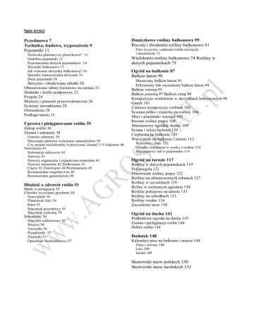 Spis treści Przedmowa 7 Technika, budowa, wyposaŜenie 9 Pojemniki 11 Doniczka gliniana czy plastykowa? 11 Ozdobne pojemniki 12 Przestawianie duŜych pojemników 14 Skrzynki balkonowe 15 Jak wykonać skrzynkę balkonową? 16 Sposoby zamocowania skrzynek 16 DuŜe pojemniki 18 Skrzynie i obudowane rabatki 20 Obmurowane rabaty kwiatowe na tarasie 21 Drabinki i kratki podporowe 22 Pergola 24 Markizy i parasole przeciwsłoneczne 26 Systemy nawadniania 28 Oświetlenie 29 Podłoga tarasu 31 Uprawa i pielęgnowanie roślin 35 Zakup roślin 36 Ziemia i substraty 38 Gotowe substraty 38 Mieszanki glebowe wykonane samodzielnie 39 Czy moŜna wielokrotnie wykorzystać ziemię? 3 9 Sadzenie 40 NawoŜenie 41 Substancje odŜywcze 41 Nawozy 41 Nawozy organiczne i organiczno-mineralne 41 Nawozy mineralne 42 Podlewanie 43 Cięcie 43 Zimowanie 44 RozmnaŜanie 45 RozmnaŜanie wegetatywne 45 RozmnaŜanie generatywne 48 Dbałość o zdrowie roślin 51 Błędy w pielęgnacji 52 Choroby wywołane grzybami 54 Szara pleśń 54 Plamistość liści 54 Rdze 55 Mączniak prawdziwy 55 Mączniak rzekomy 55 Szkodniki 56 Mączliki szklarniowe 56 Mszyce 56 Tarczniki 56 Przędziorki 57 Zmieniki 57 Opuchlaki truskawkowce 57 Doniczkowe rośliny balkonowe 59 Roczne i dwuletnie rośliny balkonowe 61 Pora wysiewu i sadzenia roślin rocznych i dwuletnich 73 Wieloletnie rośliny balkonowe 74 Rośliny w duŜych pojemnikach 75 Ogród na balkonie 87 Balkon latem 90 Słoneczny balkon latem 91 Półcienisty lub zacieniony balkon latem 94 Balkon wiosną 95 Balkon jesienią 97 Balkon zimą 98 Kompozycje wieloletnie w skrzynkach balkonowych 98 Ganek 101 Ciekawe kompozycje roślinne 102 Ścienna półka i etaŜerka na rośliny 104 Misy i pojemniki wiszące 105 Roczne rośliny pnące 108 Miniaturowy ogródek skalny 109 Ściana i wieŜa torfowa 110 Cieplarnia na balkonie 111 Warzywnik na balkonie i tarasie 112 Warzywa i zioła 112 Grządka warzywna w worku z torfem 114 Miniaturowy sad w pojemniku 114 Ogród na tarasie 117 Rośliny w duŜych pojemnikach 119 Pod pergolą 121 Zimotrwałe rośliny pnące 122 Rośliny na obmurowanych rabatach 127 Rośliny w szczelinach 129 Byliny w ruchomym ogrodzie 130 Rośliny pokojowe na tarasie 133 Rośliny na schodkach 133 Rośliny wodne 134 Zacieniony taras 138 Ogród na dachu 141 Podbudowa ogrodu na dachu 143 Ziemia i pielęgnacja roślin 144 Dobór roślin 144 Dodatek 148 Kalendarz prac na balkonie i tarasie 148 Zima i wiosna 148 Lato 149 Jesień 149 Skorowidz nazw polskich 150 Skorowidz nazw łacińskich 151