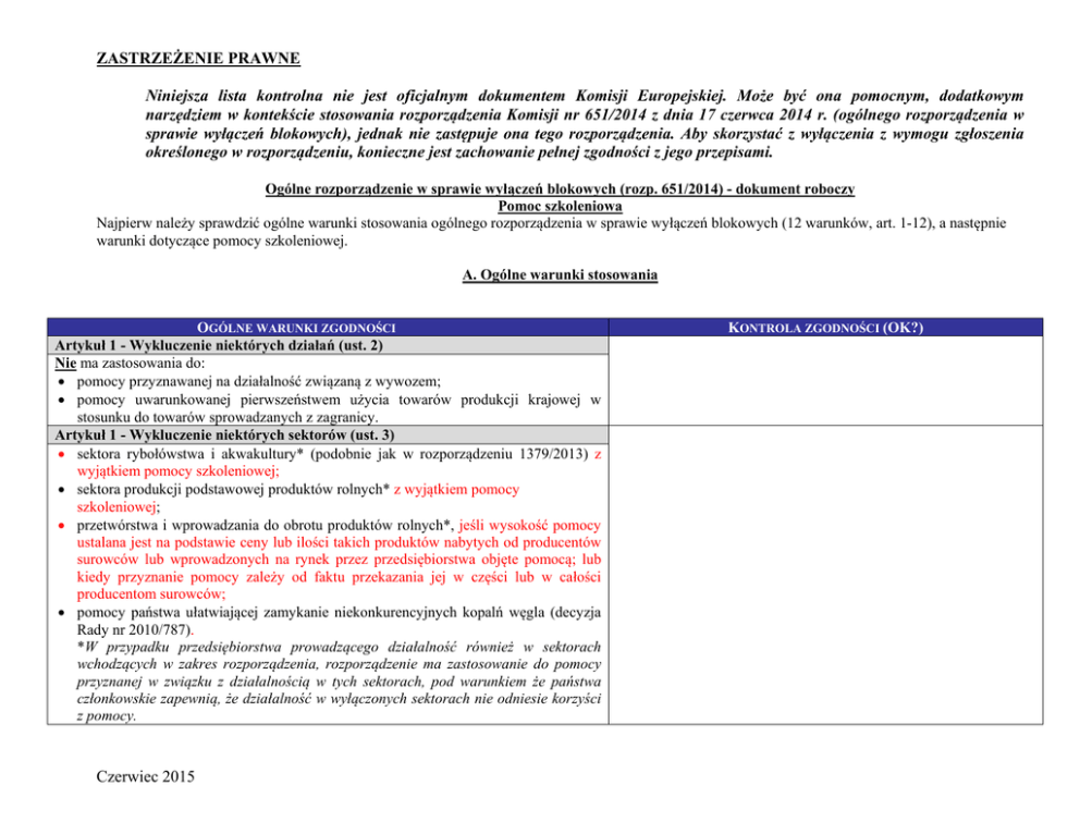 ZASTRZEŻENIE PRAWNE Niniejsza lista kontrolna nie jest oficjalnym dokumentem Komisji Europejskiej. Może być ona pomocnym, dodatkowym narzędziem w kontekście stosowania rozporządzenia Komisji nr 651/2014 z dnia 17 czerwca 2014 r. (ogólnego rozporządzenia w sprawie wyłączeń blokowych), jednak nie zastępuje ona tego rozporządzenia. Aby skorzystać z wyłączenia z wymogu zgłoszenia określonego w rozporządzeniu, konieczne jest zachowanie pełnej zgodności z jego przepisami. Ogólne rozporządzenie w sprawie wyłączeń blokowych (rozp. 651/2014) - dokument roboczy Pomoc szkoleniowa Najpierw należy sprawdzić ogólne warunki stosowania ogólnego rozporządzenia w sprawie wyłączeń blokowych (12 warunków, art. 1-12), a następnie warunki dotyczące pomocy szkoleniowej. A. Ogólne warunki stosowania OGÓLNE WARUNKI ZGODNOŚCI Artykuł 1 - Wykluczenie niektórych działań (ust. 2) Nie ma zastosowania do: • pomocy przyznawanej na działalność związaną z wywozem; • pomocy uwarunkowanej pierwszeństwem użycia towarów produkcji krajowej w stosunku do towarów sprowadzanych z zagranicy. Artykuł 1 - Wykluczenie niektórych sektorów (ust. 3) • sektora rybołówstwa i akwakultury* (podobnie jak w rozporządzeniu 1379/2013) z wyjątkiem pomocy szkoleniowej; • sektora produkcji podstawowej produktów rolnych* z wyjątkiem pomocy szkoleniowej; • przetwórstwa i wprowadzania do obrotu produktów rolnych*, jeśli wysokość pomocy ustalana jest na podstawie ceny lub ilości takich produktów nabytych od producentów surowców lub wprowadzonych na rynek przez przedsiębiorstwa objęte pomocą; lub kiedy przyznanie pomocy zależy od faktu przekazania jej w części lub w całości producentom surowców; • pomocy państwa ułatwiającej zamykanie niekonkurencyjnych kopalń węgla (decyzja Rady nr 2010/787). *W przypadku przedsiębiorstwa prowadzącego działalność również w sektorach wchodzących w zakres rozporządzenia, rozporządzenie ma zastosowanie do pomocy przyznanej w związku z działalnością w tych sektorach, pod warunkiem że państwa członkowskie zapewnią, że działalność w wyłączonych sektorach nie odniesie korzyści z pomocy. Czerwiec 2015 KONTROLA ZGODNOŚCI (OK?) ZASTRZEŻENIE PRAWNE Niniejsza lista kontrolna nie jest oficjalnym dokumentem Komisji Europejskiej. Może być ona pomocnym, dodatkowym narzędziem w kontekście stosowania rozporządzenia Komisji nr 651/2014 z dnia 17 czerwca 2014 r. (ogólnego rozporządzenia w sprawie wyłączeń blokowych), jednak nie zastępuje ona tego rozporządzenia. Aby skorzystać z wyłączenia z wymogu zgłoszenia określonego w rozporządzeniu, konieczne jest zachowanie pełnej zgodności z jego przepisami. Artykuł 1 - Wykluczenie przedsiębiorstw, do których zastosowanie ma zasada Deggendorf (ust. 4) Nie ma zastosowania do programów pomocy, które nie wykluczają wyraźnie możliwości wypłacenia pomocy indywidualnej na rzecz przedsiębiorstwa, na którym ciąży obowiązek zwrotu pomocy wynikający z wcześniejszej decyzji Komisji uznającej pomoc za niezgodną z prawem/z rynkiem wewnętrznym, i nie ma zastosowania do pomocy ad hoc dla takiego przedsiębiorstwa. Artykuł 1 - Wykluczenie przedsiębiorstw znajdujących się w trudnej sytuacji (ust. 4) Nie ma zastosowania do przedsiębiorstw znajdujących się w trudnej sytuacji. Artykuł 1 - Wykluczenie środków pomocy naruszających prawo Unii (ust. 5) Nie ma zastosowania do środków pomocy państwa, które nierozerwalnie wiążą się z naruszeniem prawa Unii, w szczególności: a) jeśli przyznanie pomocy uwarunkowane jest obowiązkiem posiadania przez beneficjenta siedziby w danym państwie członkowskim lub prowadzeniem przez niego działalności w przeważającej mierze w danym państwie członkowskim. Dozwolony jest wymóg posiadania w momencie wypłaty pomocy zakładu lub oddziału w państwie członkowskim przyznającym pomoc; b) jeśli przyznanie pomocy uwarunkowane jest obowiązkiem korzystania z towarów produkcji krajowej lub usług krajowych; c) do środków ograniczających możliwości beneficjentów w zakresie wykorzystania wyników działalności badawczej, rozwojowej i innowacyjnej w innych państwach członkowskich. Artykuł 4 - Progi pomocy powodujące obowiązek zgłoszenia Nie ma zastosowania do pomocy przekraczającej następujące progi: • szkolenia: 2 mln EUR na projekt szkoleniowy. Nie należy obchodzić progów poprzez sztuczne dzielenie programów pomocy lub projektów pomocy. Artykuł 5 - Przejrzystość pomocy Za pomoc przejrzystą uznaje się następujące kategorie pomocy: • dotacje oraz dotacje na spłatę odsetek; 2 ZASTRZEŻENIE PRAWNE Niniejsza lista kontrolna nie jest oficjalnym dokumentem Komisji Europejskiej. Może być ona pomocnym, dodatkowym narzędziem w kontekście stosowania rozporządzenia Komisji nr 651/2014 z dnia 17 czerwca 2014 r. (ogólnego rozporządzenia w sprawie wyłączeń blokowych), jednak nie zastępuje ona tego rozporządzenia. Aby skorzystać z wyłączenia z wymogu zgłoszenia określonego w rozporządzeniu, konieczne jest zachowanie pełnej zgodności z jego przepisami. • pożyczki (gdzie ekwiwalent dotacji brutto oblicza się na podstawie stopy referencyjnej obowiązującej w dniu przyznania pomocy); • gwarancje (ekwiwalent dotacji brutto obliczony na podstawie bezpiecznych stawek określonych w obwieszczeniu Komisji lub ekwiwalent dotacji brutto zatwierdzony przed wprowadzeniem środka na podstawie obwieszczenia Komisji w sprawie gwarancji, a przyjęta metoda obliczania wyraźnie odnosi się do przedmiotowego rodzaju gwarancji i rodzaju transakcji bazowej w kontekście stosowania ogólnego rozporządzenia w sprawie wyłączeń blokowych); • korzyści podatkowe (gdzie przewidziano pułap zapobiegający przekroczeniu obowiązującego progu); • zaliczki zwrotne (jeżeli łączna nominalna kwota zaliczek zwrotnych nie przekracza progów obowiązujących na mocy tego rozporz