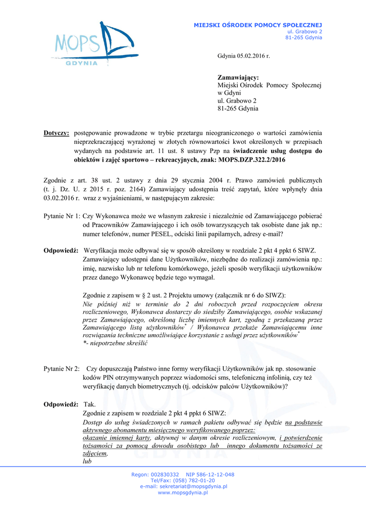 MIEJSKI OŚRODEK POMOCY SPOŁECZNEJ ul. Grabowo 2 81-265 Gdynia Gdynia 05.02.2016 r. Zamawiający: Miejski Ośrodek Pomocy Społecznej w Gdyni ul. Grabowo 2 81-265 Gdynia Dotyczy: postępowanie prowadzone w trybie przetargu nieograniczonego o wartości zamówienia nieprzekraczającej wyrażonej w złotych równowartości kwot określonych w przepisach wydanych na podstawie art. 11 ust. 8 ustawy Pzp na świadczenie usług dostępu do obiektów i zajęć sportowo – rekreacyjnych, znak: MOPS.DZP.322.2/2016 Zgodnie z art. 38 ust. 2 ustawy z dnia 29 stycznia 2004 r. Prawo zamówień publicznych (t. j. Dz. U. z 2015 r. poz. 2164) Zamawiający udostępnia treść zapytań, które wpłynęły dnia 03.02.2016 r. wraz z wyjaśnieniami, w następującym zakresie: Pytanie Nr 1: Czy Wykonawca może we własnym zakresie i niezależnie od Zamawiającego pobierać od Pracowników Zamawiającego i ich osób towarzyszących tak osobiste dane jak np.: numer telefonów, numer PESEL, odciski linii papilarnych, adresy e-mail? Odpowiedź: Weryfikacja może odbywać się w sposób określony w rozdziale 2 pkt 4 ppkt 6 SIWZ. Zamawiający udostępni dane Użytkowników, niezbędne do realizacji zamówienia np.: imię, nazwisko lub nr telefonu komórkowego, jeżeli sposób weryfikacji użytkowników przez danego Wykonawcę będzie tego wymagał. Zgodnie z zapisem w § 2 ust. 2 Projektu umowy (załącznik nr 6 do SIWZ): Nie później niż w terminie do 2 dni roboczych przed rozpoczęciem okresu rozliczeniowego, Wykonawca dostarczy do siedziby Zamawiającego, osobie wskazanej przez Zamawiającego, określoną liczbę imiennych kart, zgodną z przekazaną przez Zamawiającego listą użytkowników* / Wykonawca przekaże Zamawiającemu inne rozwiązania techniczne umożliwiające korzystanie z usługi przez użytkowników* *- niepotrzebne skreślić Pytanie Nr 2: Czy dopuszczają Państwo inne formy weryfikacji Użytkowników jak np. stosowanie kodów PIN otrzymywanych poprzez wiadomości sms, telefoniczną infolinią, czy też weryfikację danych biometrycznych (tj. odcisków palców Użytkowników)? Odpowiedź: Tak. Zgodnie z zapisem w rozdziale 2 pkt 4 ppkt 6 SIWZ: Dostęp do usług świadczonych w ramach pakietu odbywać się będzie na podstawie aktywnego abonamentu miesięcznego weryfikowanego poprzez: okazanie imiennej karty, aktywnej w danym okresie rozliczeniowym, i potwierdzenie tożsamości za pomocą dowodu osobistego lub innego dokumentu tożsamości ze zdjęciem, lub Regon: 002830332 NIP 586-12-12-048 Tel/Fax: (058) 782-01-20 e-mail: [email protected] www.mopsgdynia.pl identyfikację (potwierdzenie tożsamości) Użytkownika w sposób wynikający ze stosowanych przez danego Wykonawcę rozwiązań technicznych i organizacyjnych, innych aniżeli okazanie dokumentu tożsamości lub użycie karty imiennej. Weryfikacja miesięcznego abonamentu danego Użytkownika nie może wiązać się z żadnymi dodatkowymi kosztami, a także nie może wiązać się z koniecznością posiadania przez użytkowników dodatkowych urządzeń typu: telefon komórkowy lub tablet itp. Wszelkie koszty związane z ze sposobem weryfikacji ponosi Wykonawca. Pytanie Nr 3: Czy Zamawiający wyraża zgodę, aby potencjalni Wykonawcy w swoich ofertach podawali obiekty świadczące takie usługi jak: solaria, zabiegi kosmetyczne, masaże, usługi fryzjerskie itp.? Odpowiedź: Tak, ale jedynie, jako usługa dodatkowa w rozumieniu zapisu w rozdziale 2 pkt 3 ppkt 12 tj.: Obok usług będących przedmiotem zamówienia Wykonawca może zaoferować usługi dodatkowe (np. inne karty, karty rabatowe, kupony). Przy czym wszystkie usługi dodatkowe muszą być ujęte w cenie oferty. Pytanie Nr 4: Czy Zamawiający wymaga, aby Wykonawca stosujący inne metody weryfikacji (jak np. Kod wysyłany sms) na własny koszt i niezależnie od Zamawiającego dostarczył Użytkownikom, którzy nie posiadają telefonów komórkowych lub nie wyrażają zgody na korzystanie z prywatnych telefonów komórkowych nieodpłatne (na własny koszt) telefony komórkowe przeznaczone do weryfikacji Użytkowników? ( w przypadku weryfikacji na podstawie karty Wykonawca jest zobowiązany do dostarczenia na własny koszt niezbędnych narzędzi weryfikujących). Odpowiedź: Tak, odpowiedź analogiczna jak w przypadku pytania 2. Powyższe wyjaśnienia są wiążące dla Wykonawców i należy je uwzględnić w pełnym zakresie przy sporządzaniu ofert.