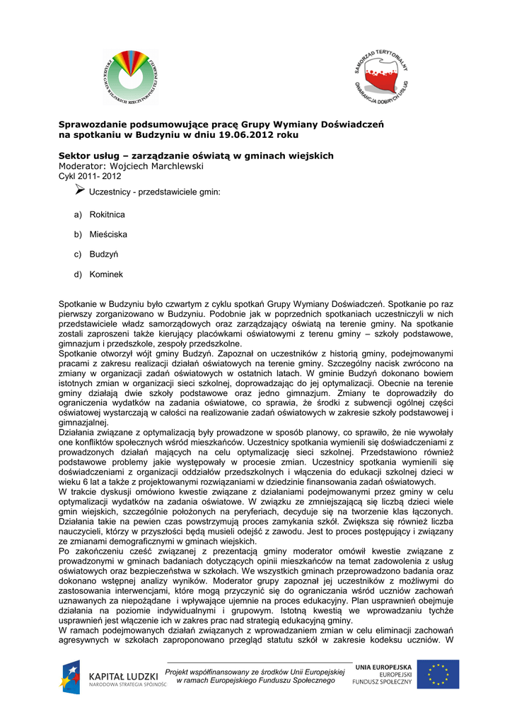 Sprawozdanie podsumowujące pracę Grupy Wymiany Doświadczeń na spotkaniu w Budzyniu w dniu 19.06.2012 roku Sektor usług – zarządzanie oświatą w gminach wiejskich Moderator: Wojciech Marchlewski Cykl 2011- 2012 Uczestnicy - przedstawiciele gmin: a) Rokitnica b) Mieściska c) Budzyń d) Kominek Spotkanie w Budzyniu było czwartym z cyklu spotkań Grupy Wymiany Doświadczeń. Spotkanie po raz pierwszy zorganizowano w Budzyniu. Podobnie jak w poprzednich spotkaniach uczestniczyli w nich przedstawiciele władz samorządowych oraz zarządzający oświatą na terenie gminy. Na spotkanie zostali zaproszeni także kierujący placówkami oświatowymi z terenu gminy – szkoły podstawowe, gimnazjum i przedszkole, zespoły przedszkolne. Spotkanie otworzył wójt gminy Budzyń. Zapoznał on uczestników z historią gminy, podejmowanymi pracami z zakresu realizacji działań oświatowych na terenie gminy. Szczególny nacisk zwrócono na zmiany w organizacji zadań oświatowych w ostatnich latach. W gminie Budzyń dokonano bowiem istotnych zmian w organizacji sieci szkolnej, doprowadzając do jej optymalizacji. Obecnie na terenie gminy działają dwie szkoły podstawowe oraz jedno gimnazjum. Zmiany te doprowadziły do ograniczenia wydatków na zadania oświatowe, co sprawia, że środki z subwencji ogólnej części oświatowej wystarczają w całości na realizowanie zadań oświatowych w zakresie szkoły podstawowej i gimnazjalnej. Działania związane z optymalizacją były prowadzone w sposób planowy, co sprawiło, że nie wywołały one konfliktów społecznych wśród mieszkańców. Uczestnicy spotkania wymienili się doświadczeniami z prowadzonych działań mających na celu optymalizację sieci szkolnej. Przedstawiono również podstawowe problemy jakie występowały w procesie zmian. Uczestnicy spotkania wymienili się doświadczeniami z organizacji oddziałów przedszkolnych i włączenia do edukacji szkolnej dzieci w wieku 6 lat a także z projektowanymi rozwiązaniami w dziedzinie finansowania zadań oświatowych. W trakcie dyskusji omówiono kwestie związane z działaniami podejmowanymi przez gminy w celu optymalizacji wydatków na zadania oświatowe. W związku ze zmniejszającą się liczbą dzieci wiele gmin wiejskich, szczególnie położonych na peryferiach, decyduje się na tworzenie klas łączonych. Działania takie na pewien czas powstrzymują proces zamykania szkół. Zwiększa się również liczba nauczycieli, którzy w przyszłości będą musieli odejść z zawodu. Jest to proces postępujący i związany ze zmianami demograficznymi w gminach wiejskich. Po zakończeniu cześć związanej z prezentacją gminy moderator omówił kwestie związane z prowadzonymi w gminach badaniach dotyczących opinii mieszkańców na temat zadowolenia z usług oświatowych oraz bezpieczeństwa w szkołach. We wszystkich gminach przeprowadzono badania oraz dokonano wstępnej analizy wyników. Moderator grupy zapoznał jej uczestników z możliwymi do zastosowania interwencjami, które mogą przyczynić się do ograniczania wśród uczniów zachowań uznawanych za niepożądane i wpływające ujemnie na proces edukacyjny. Plan usprawnień obejmuje działania na poziomie indywidualnymi i grupowym. Istotną kwestią we wprowadzaniu tychże usprawnień jest włączenie ich w zakres prac nad strategią edukacyjną gminy. W ramach podejmowanych działań związanych z wprowadzaniem zmian w celu eliminacji zachowań agresywnych w szkołach zaproponowano przegląd statutu szkół w zakresie kodeksu uczniów. W Projekt współfinansowany ze środków Unii Europejskiej w ramach Europejskiego Funduszu Społecznego trakcie przeglądu tych dokumentów należy zwrócić uwagę, w jakim zakresie uwzględniono zasady, jakie miały być wdrażane. Na poziomie grupy klasy zaproponowano następujące działania: • tworzenie kultury wymiany informacji pomiędzy uczniami - nauczycielami - rodzicami • wzmocnienie rad klasowych w działaniach na rzecz upowszechnienia znajomości kodeksu ucznia, postępowania i rozwiązywania sytuacji konfliktowych, • powołanie grupy reagowania składającej się z nauczycieli, uczniów, psychologa szkolnego okazującej pomoc ofiarom napaści; • powołanie lub wzmocnienie instytucji sądów koleżeńskich uczniów, które rozstrzygać będą „sprawy” związane z naruszaniem lub łamaniem kodeksu ucznia; • zmiany w organizacji przestrzeni klasowych uniemożliwiające dokonanie aktu przemocy; • tworzenie projektów mediacyjnych pozwalających uczniom na wychodzenie z sytuacji konfliktowych • rozwijanie wrażliwości i kształtowanie postaw wobec agresji – dramy, dyskusje dotyczące filmów. • wzmacnianie więzi wspólnoty (wycieczki, zajęcia sportowe połączone z programem budowania zespołu) Na poziomie indywidualnym: • zapewnienie pomocy psychologicznej uczniom w szkole (psycholog szkolny) i poza szkołą, • grupy wsparcia dla osób będących ofiarami aktów przemocy; • telefoniczne linie pomocy zorganizowane na wzór niebieskiej linii itp. • uruchomienie w szkole mediatora W kolejnej części moderator omówił zagadnienia związane z przygotowaniem strategii edukacyjnych w gminach członkowskich GWD. Z dokonanego przeglądu dokumentów strategicznych okazało się, że żadna z gmin nie posiada strategii edukacyjnej. Stwierdzono również, że dokumenty opracowane w innych gminach wiejskich nie spełniają wymogów dokumentu strategicznego, odnoszącego się do realizowania zadań z zakresu edukacji. Główne problemy związane były z błędną diagnozą problemów, ze zbyt ogólnym opisaniem celów strategicznych, brakiem powiązania celów strategicznych z zasobami – finansowymi i ludzkimi, brak perspektywy finansowej wprowadzanych zmian, a szczególnie z nieuwzględnieniem kalkulacji kosztów przyszłych wydatków związanych z utrzymaniem obiektów. Uczestnicy spotkania wymienili następnie swoje uwagi co do zaprezentowanych przez