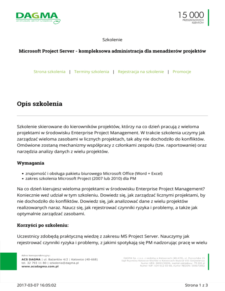 Szkolenie Microsoft Project Server - kompleksowa administracja dla menadżerów projektów Strona szkolenia | Terminy szkolenia | Rejestracja na szkolenie | Promocje Opis szkolenia Szkolenie skierowane do kierowników projektów, którzy na co dzień pracują z wieloma projektami w środowisku Enterprise Project Management. W trakcie szkolenia uczymy jak zarządzać wieloma zasobami w licznych projektach, tak aby nie dochodziło do konfliktów. Omówione zostaną mechanizmy współpracy z członkami zespołu (tzw. raportowanie) oraz narzędzia analizy danych z wielu projektów. Wymagania znajomość i obsługa pakietu biurowego Microsoft Office (Word + Excel) zakres szkolenia Microsoft Project (2007 lub 2010) dla PM Na co dzień kierujesz wieloma projektami w środowisku Enterprise Project Management? Koniecznie weź udział w tym szkoleniu. Dowiedz się, jak zarządzać licznymi projektami, by nie dochodziło do konfliktów. Dowiedz się, jak analizować dane z wielu projektów realizowanych naraz. Naucz się, jak rejestrować czynniki ryzyka i problemy, a także jak optymalnie zarządzać zasobami. Korzyści po szkoleniu: Uczestnicy zdobędą praktyczną wiedzę z zakresu MS Project Server. Nauczymy jak rejestrować czynniki ryzyka i problemy, z jakimi spotykają się PM nadzorując pracę w wielu 2017-03-07 16:05:02 Strona 1 z 3 projektach realizowanych naraz. Całość można zakończyć egzaminem i tym samym uczestnicy, którzy zdadzą pomyślnie test otrzymają Certyfikaty Autoryzowanego Centrum Szkoleniowego DAGMA. Dzięki szkoleniu: zaoszczędzisz czas, zwiększysz kontrolę nad harmonogramem, usprawnisz komunikację i zwiększysz wydajność zespołu, zminimalizujesz wpływ problemów na postęp prac, będziesz skutecznym menadżerem projektów. Długość szkolenia: 16 h (2 dni x 8 h) Program szkolenia 1. Wprowadzenie do środowiska EPM (Enterprise Project Management). jak działa i jakie są role programów Project Server i SharePoint? omówienie interfejsu i widoków programu Project Web Access konfiguracja MS Project do pracy z serwerem 2. Tworzenie i publikacja projektów w organizacji. zapisywanie projektu na serwerze publikowanie projektu i obszaru roboczego zamykanie i otwieranie pliku, praca offline importowanie projektów do serwera korzystanie z szablonu globalnego organizacji przeglądanie i edycja projektu w PWA do czego służą propozycje i działania? 3. Praca z zasobami. przeglądanie zasobów i wykresów w PWA importowanie zasobów do serwera 2017-03-07 16:05:02 Strona 2 z 3 definiowanie Struktury Podziału Zasobów i wpływ na uprawnienia edytowanie zasobów 4. Praca z zadaniami. przypisywanie zadań i odbieranie informacji o postępach analiza odchyleń od planu bazowego żądanie informacji o postępach 5. Analiza danych i komunikacja w zespole. korzystanie z raportów portfela projektów analiza wykresów dostępności zasobów odbieranie i akceptacja grafików (okresowych raportów) wysyłanie żądań raportów o stanie 6. Obszar roboczy projektu. praca z dokumentami projektowymi – współdzielenie plików ryzyka i Problemy – jak utworzyć i powiązać je z zadaniami korzystanie z bibliotek, kalendarzy, paneli dyskusyjnych 7. Egzamin (opcjonalnie). 2017-03-07 16:05:02 Strona 3 z 3