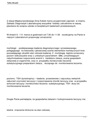 Tylko dla pań Z okazji Międzynarodowego Dnia Kobiet mamy przyjemność zaprosić w imieniu Zakładu Diagnostyki Laboratoryjnej wszystkie kobiety zatrudnione w naszej placówce do wzięcia udziału w bezpłatnych badaniach przesiewowych. W dniach 6 i 13 marca w godzinach od 7.30 do 11.00 oczekujemy na Panie w naszym Laboratorium proponując oznaczenia: - morfologii - podstawowego badania diagnostycznego i przesiewowego, polegającego na ilościowej i jakościowej ocenie elementów morfotycznych krwi; pozwalającego określić stan zdrowia badanej. Z morfologią będzie oznaczany poziom retikulocytów wraz z unikalnym parametrem Chr, umożliwiającym natychmiastowe rozpoznanie anemii z niedoboru żelaza, ocenę gospodarki żelazowej w organizmie, oraz w przypadku konieczności leczenia substytucyjnego preparatami żelaza, służącego do monitorowania leczenia. - poziomu TSH (tyreotropiny) – badania przesiewowe ( najczulszy wskaźnik zaburzeń czynności tarczycy) i rozpoznawania chorób tarczycy oraz w przypadku schorzeń tarczycy i konieczności leczenia substytucyjnego, TSH służy do monitorowania leczenia. Drogie Panie pamiętajcie, że gospodarka żelazem i funkcjonowanie tarczycy ma: - istotne znaczenie kliniczne na stan zdrowia, 1/2 Tylko dla pań - bezpośredni wpływ na urodę – stan włosów, paznokci, skóry. Dlatego w trosce o zdrowie i urodę Panie powinny zgłosić się na badania na czczo. Wyniki do odebrania w Laboratorium w dniach 9 i 16 marca. Partnerzy akcji: firma Sarstedt, Siemens Medical Solutions Diagnostics, Roche. 2/2