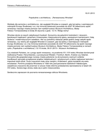 Pobrano z PlatformaKultury.pl 16.01.2013 Popołudnie z architekturą - „Renesansowy Wrocław” ____________________________ Wykłady dla seniorów o architekturze. Jak wyglądał Wrocław w czasach, gdy był jedną z ważniejszych metropolii Europy Środkowej i co z tej minionej świetności pozostało do dziś? W odtworzeniu epoki renesansu naszego miasta pomoże nam wykład kustosz Muzeum Architektury, Beaty Fekecz-Tomaszewskiej w środę 30 stycznia o godz. 12.15. Wstęp wolny! Wrocław słynie ze swych zabytkowych budowli. Szczycimy się gotyckimi kościołami i ratuszem, barokowymi kaplicami i gmachem Uniwersytetu; klasycystyczną operą, secesyjnymi kamienicami; Halą Stulecia i modernistycznymi osiedlami. Ale czy potrafimy wskazać jakieś godne uwagi zabytki epoki renesansu, czy wiemy jak wyglądał Wrocław w czasach, gdy był jedną z ważniejszych metropolii Europy Środkowej i co z tej minionej świetności pozostało do dziś? W odtworzeniu tej epoki naszego miasta pomoże nam wykład kustosz Muzeum Architektury, Beaty Fekecz-Tomaszewskiej w ramach cyklu „Popołudnie z architekturą” (12:15 środa, 30.01.2013 r. Muzeum Architektury). Czy wiedzieli Państwo, że u progu epoki renesansu, na przełomie XV i XVI wieku Wrocław dorównywał wielkością Pradze i Norymberdze, a przewyższał Wiedeń, Frankfurt, Berlin, Kraków czy Gdańsk. Korzystne dla gospodarczego rozwoju miasta położenie na skrzyżowaniu ważnych szlaków handlowych sprzyjało przepływowi prądów intelektualnych i artystycznych a także napływowi twórców i importowi dzieł sztuki. Duże znaczenie miały silne związki z Krakowem, gdzie kształciło się wielu wrocławian. Pomimo przejścia Wrocławia w 1526 roku pod panowanie katolickich Habsburgów, zasadnicze znaczenie dla przemian w sztuce miała reforma protestancka wprowadzona w latach 20. XVI wieku. Sztuka tego okresu stała się w pełni mieszczańska. Serdecznie zapraszam do poznania renesansowego oblicza Wrocławia. strona 1 / 1
