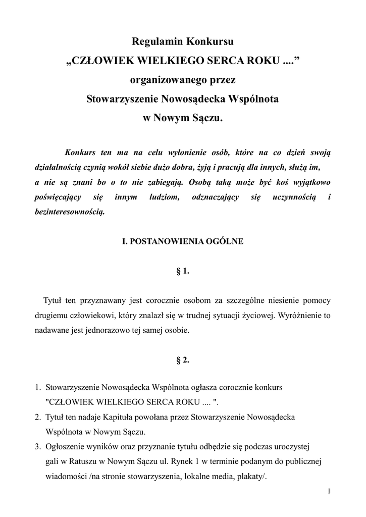 Regulamin Konkursu „CZŁOWIEK WIELKIEGO SERCA ROKU ....” organizowanego przez Stowarzyszenie Nowosądecka Wspólnota w Nowym Sączu. Konkurs ten ma na celu wyłonienie osób, które na co dzień swoją działalnością czynią wokół siebie dużo dobra, żyją i pracują dla innych, służą im, a nie są znani bo o to nie zabiegają. Osobą taką może być koś wyjątkowo poświęcający się innym ludziom, odznaczający się uczynnością i bezinteresownością. I. POSTANOWIENIA OGÓLNE § 1. Tytuł ten przyznawany jest corocznie osobom za szczególne niesienie pomocy drugiemu człowiekowi, który znalazł się w trudnej sytuacji życiowej. Wyróżnienie to nadawane jest jednorazowo tej samej osobie. § 2. 1. Stowarzyszenie Nowosądecka Wspólnota ogłasza corocznie konkurs "CZŁOWIEK WIELKIEGO SERCA ROKU .... ". 2. Tytuł ten nadaje Kapituła powołana przez Stowarzyszenie Nowosądecka Wspólnota w Nowym Sączu. 3. Ogłoszenie wyników oraz przyznanie tytułu odbędzie się podczas uroczystej gali w Ratuszu w Nowym Sączu ul. Rynek 1 w terminie podanym do publicznej wiadomości /na stronie stowarzyszenia, lokalne media, plakaty/. 1 II. PROCEDURA ZGŁASZANIA I WYŁONIENIA LAUREATÓW § 3. 1. Konkurs „Człowieka Wielkiego Serca Roku ...” jest dwu etapowy: - zgłaszanie osób do konkursu, - głosowanie na nominowanych. 2. Spośród zgłoszonych osób do konkursu Kapituła wyłania listę dziesięciu nominowanych, (po 5 osób z terenu miasta i powiatu). Wybierając nominowanych z miasta i powiatu decyduje miejsce zamieszkania. Nazwiska nominowanych podaje się do publicznej wiadomości za pośrednictwem lokalnych mediów oraz informacji zamieszczonej na stronie internetowej stowarzyszenia. 3. Wyboru nominowanych dokonuje Kapituła Stowarzyszenia w oparciu o następujące kryteria: - liczba oddanych głosów na kandydata, - promowanie bezinteresownej pracy, pomocy, - uczynność, skromność, itp. 4. Spośród nominowanych, Kapituła Stowarzyszenia w głosowaniu wybiera laureatów, podając uzasadnienie dokonanego wyboru na uroczystej gali. 5. W przypadku równej ilości oddanych głosów na nominowanych w głosowaniu kolejnym, decyduje głos przewodniczącego Kapituły. 6. Od wyboru Kapituły nie przysługuje odwołanie. 7. Osoby zgłoszone, nominowane do wcześniejszych edycji konkursu, którzy nie zostali laureatami , mogą być zgłoszenie ponownie do Konkursu. 2 III. ZGŁOSZENIE I GŁOSOWANIE § 4. 1. Zgłoszenia kandydatów do Konkursu może dokonać każda osoba fizyczna oraz prawna. 2. Zgłoszenia kandydatów dokonywane są: - internetowo na stronie Stowarzyszenia www.snw.org.pl - na kartach zgłoszeń znajdujących się w siedzibie stowarzyszenia w Nowym Sączu ul. Narutowicza 2, lub pobranych ze strony internetowej stowarzyszenia www.snw.org.pl /karta zgłoszeniowa do konkursu ”Człowiek Wielkiego Serca”/. - kuponów zgłoszeniowych zamieszczonych w lokalnej prasie : Gazeta Krakowska, Tygodnik nowosądecki "Miasto", "Dobry Tygodnik Sądecki", 3. Kupony należy składać osobiście lub przesłać na adres: Stowarzyszenie Nowosądecka Wspólnota, ul. Narutowicza 2, 33-300 Nowy Sącz z dopiskiem „Konkurs Człowiek Wielkiego Serca Roku....”. 4. Głosowanie na nominowanych jest: - internetowo na stronie Stowarzyszenia http://www.snw.org.pl/ - na kartach do głosowania znajdujących się w siedzibie stowarzyszenia w Nowym Sączu ul. Narutowicza 2, lub pobranych ze strony internetowej stowarzyszenia www.snw.org.pl /karta do głosowania w konkursie ”Człowiek Wielkiego Serca”/. - kuponów do głosowania zamieszczonych w lokalnej prasie : Gazeta Krakowska, Tygodnik nowosądecki "Miasto", "Dobry Tygodnik Sądecki", 3 IV. OGŁOSZENIE LISTY NOMINOWANYCH § 5. Lista nominowanych wyłonionych w myśl postanowień niniejszego Regulaminu będzie prezentowana publicznie na stronie internetowej Organizatora www.snw.org.pl oraz w lokalnych mediach. V. NAGRODY §6. Nominowani w Konkursie (po 5 osób z terenu miasta i powiatu), otrzymują okolicznościowe dyplomy i upominki. Laureaci Konkursu (po 1 osobie z terenu miasta i powiatu), otrzymają tytuł „CZŁOWIEK WIELKIEGO SERCA ROKU ...”, oraz statuetkę i dyplom potwierdzający otrzymany tytuł, oraz wartościowe nagrody rzeczowe. VI. OGŁOSZENIE LAUREATÓW § 7. Każda z osób nominowanych zostanie powiadomiona telefoniczne lub mailowo o terminie i miejscu odbywania się gali, co najmniej z pięciodniowym wyprzedzeniem. VII. POSTANOWIENIA KOŃCOWE § 8. 1. Pełna treść niniejszego regulaminu Konkursu jest dostępna na stronie internetowej www.snw.org.pl oraz w siedzibie Organizatora w Nowym Sączu ul. Narutowicza 2. 2. W sprawach nieuregulowanych niniejszym Regulaminem ostateczną decyzję podejmuje Organizator. 4
