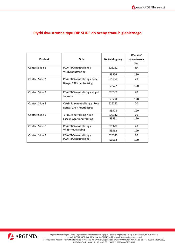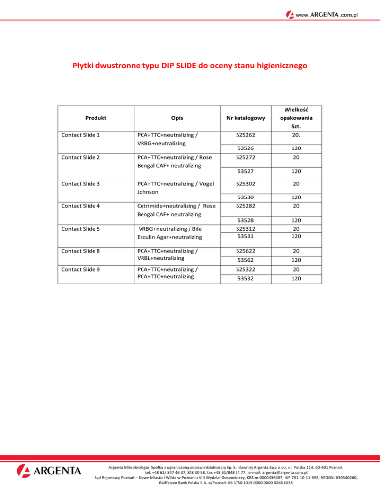 Płytki dwustronne typu DIP SLIDE do oceny stanu higienicznego PCA+TTC+neutralizing / VRBG+neutralizing 525262 Wielkość opakowania Szt. 20. 53526 120 PCA+TTC+neutralizing / Rose Bengal CAF+ neutralizing 525272 20 53527 120 Contact Slide 3 PCA+TTC+neutralizing / Vogel Johnson 525302 20 Contact Slide 4 Cetrimide+neutralizing / Rose Bengal CAF+ neutralizing 53530 525282 120 20 Contact Slide 5 VRBG+neutralizing / Bile Esculin Agar+neutralizing 53528 525312 53531 120 20 120 Contact Slide 8 PCA+TTC+neutralizing / VRBL+neutralizing 525622 20 53562 120 PCA+TTC+neutralizing / PCA+TTC+neutralizing 525322 20 53532 120 Produkt Contact Slide 1 Contact Slide 2 Contact Slide 9 Opis Nr katalogowy Argenta Mikrobiologia Spółka z ograniczoną odpowiedzialnością Sp. k.( dawniej Argenta Sp.z o.o.), ul. Polska 114, 60-401 Poznań, tel. +48 61/ 847 46 37, 848 30 58, fax +48 61/848 34 77 , e-mail: [email protected] Sąd Rejonowy Poznań – Nowe Miasto i Wilda w Poznaniu VIII Wydział Gospodarczy, KRS nr 0000436487, NIP 781-10-11-656, REGON: 630340260, Raiffeisen Bank Polska S.A. o/Poznań: 86 1750 1019 0000 0000 0265 8038