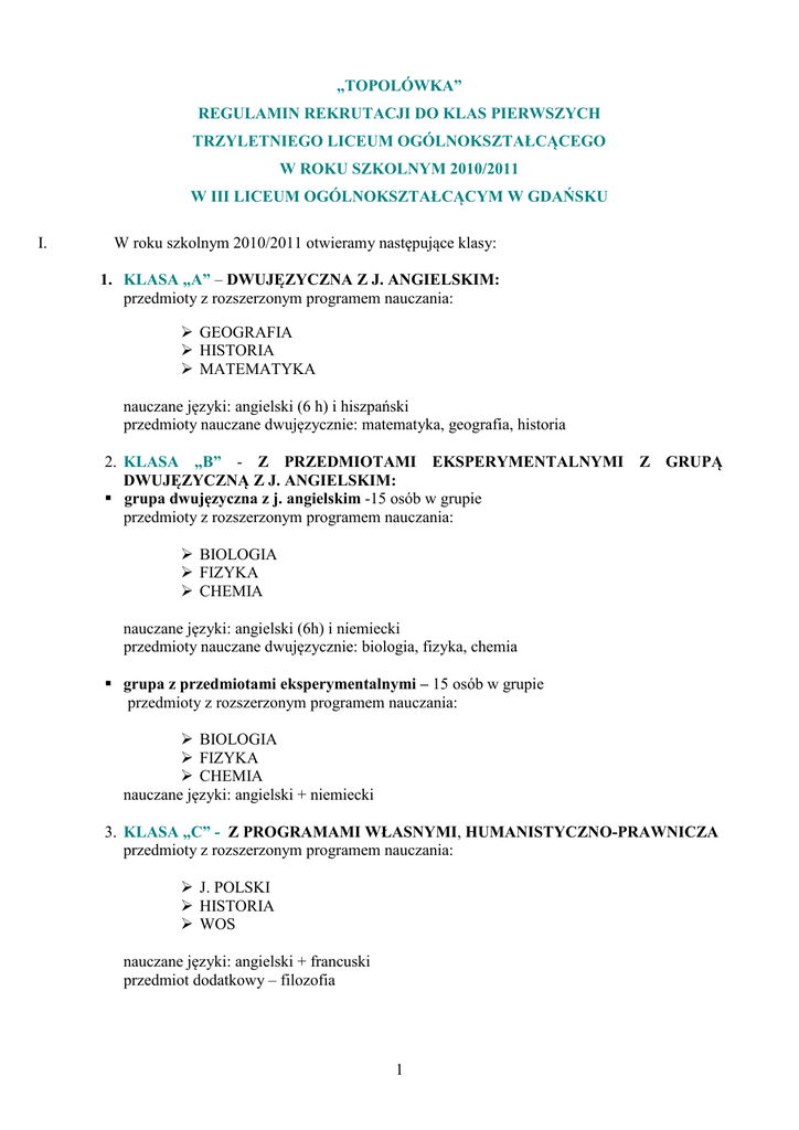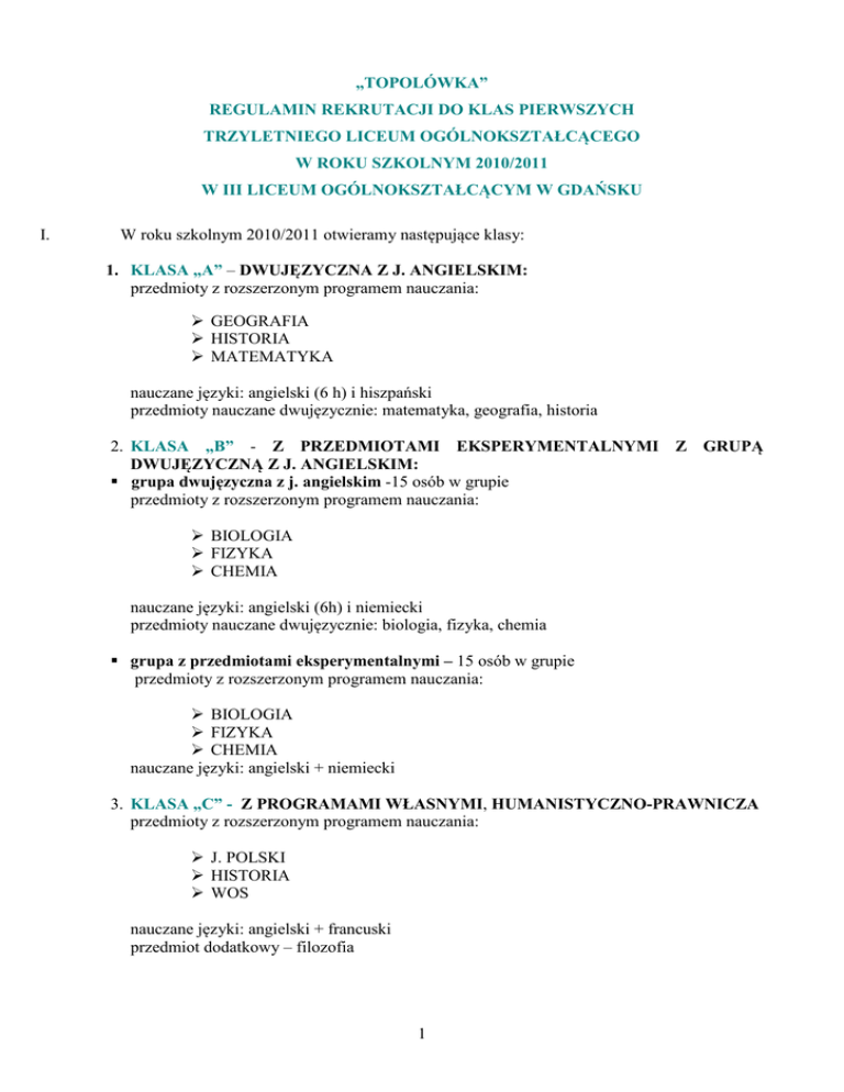 „TOPOLÓWKA” REGULAMIN REKRUTACJI DO KLAS PIERWSZYCH TRZYLETNIEGO LICEUM OGÓLNOKSZTAŁCĄCEGO W ROKU SZKOLNYM 2010/2011 W III LICEUM OGÓLNOKSZTAŁCĄCYM W GDAŃSKU I. W roku szkolnym 2010/2011 otwieramy następujące klasy: 1. KLASA „A” – DWUJĘZYCZNA Z J. ANGIELSKIM: przedmioty z rozszerzonym programem nauczania: GEOGRAFIA HISTORIA MATEMATYKA nauczane języki: angielski (6 h) i hiszpański przedmioty nauczane dwujęzycznie: matematyka, geografia, historia 2. KLASA „B” - Z PRZEDMIOTAMI EKSPERYMENTALNYMI Z GRUPĄ DWUJĘZYCZNĄ Z J. ANGIELSKIM: grupa dwujęzyczna z j. angielskim -15 osób w grupie przedmioty z rozszerzonym programem nauczania: BIOLOGIA FIZYKA CHEMIA nauczane języki: angielski (6h) i niemiecki przedmioty nauczane dwujęzycznie: biologia, fizyka, chemia grupa z przedmiotami eksperymentalnymi – 15 osób w grupie przedmioty z rozszerzonym programem nauczania: BIOLOGIA FIZYKA CHEMIA nauczane języki: angielski + niemiecki 3. KLASA „C” - Z PROGRAMAMI WŁASNYMI, HUMANISTYCZNO-PRAWNICZA przedmioty z rozszerzonym programem nauczania: J. POLSKI HISTORIA WOS nauczane języki: angielski + francuski przedmiot dodatkowy – filozofia 1 4. KLASA „D” - Z PROGRAMAMI WŁASNYMI, przedmioty z rozszerzonym programem nauczania: POLITECHNICZNA MATEMATYKA FIZYKA INFORMATYKA nauczane języki: angielski + niemiecki 5. KLASA „I H” - DWUJĘZYCZNA Z JĘZYKIEM HISZPAŃSKIM, przygotowująca do matury polskiej i hiszpańskiej (kontynuacja po klasie wstępnej „0H”). Drugi język język angielski. Przedmioty dodatkowe: literatura hiszpańska, historia z elementami historii sztuki Królestwa Hiszpanii i geografia Królestwa Hiszpanii. Dodatkowe godziny na przedmioty: geografia, historia. (10 miejsc dla kandydatów spoza III LO) 8. KLASA „0H” - WSTĘPNA Z JĘZYKIEM HISZPAŃSKIM, przygotowująca do klasy dwujęzycznej z językiem hiszpańskim, drugi język – język angielski. Zajęcia z nauczycielem z Hiszpanii. Tygodniowo 18h języka hiszpańskiego. Dodatkowe opłaty. 9. KLASA „preIB” - DWUJĘZYCZNA Z J. ANGIELSKIM – tylko dla uczniów, którzy od II klasy chcą uczestniczyć w programie dyplomowym matury międzynarodowej. Drugi język - język niemiecki. 7 przedmiotów nauczanych dwujęzycznie: matematyka, biologia, fizyka, geografia, historia, chemia. Dodatkowe przedmioty: metodologia badań naukowych (nauczana w języku angielskim) i CAS (Creativity, Action, Service). Dodatkowe opłaty. -----------------------------------------------------------------------------------------------------------------------INFORMACJE SZCZEGÓŁOWE DOTYCZĄCE REKRUTACJI DO KLASY PIERWSZEJ „H” DWUJĘZYCZNEJ Z JĘZYKIEM HISZPAŃSKIM I KLASY 0 H: Uczniowie klasy wstępnej „ 0H” hiszpańskiej przystępują do sprawdzianu z języka hiszpańskiego w dn. 7 czerwca 2010 o godz 9.00. Sprawdzian składa się z części pisemnej ( 60 min.) i części ustnej ( 10 min.). Wyniki sprawdzianu zostaną ogłoszone dn. 15 czerwca 2010 o godz. 9:00. Uczniowie, którzy zdali sprawdzian z języka hiszpańskiego i otrzymali pozytywne oceny ze wszystkich przedmiotów w klasie „ 0H” oraz dobrą ocenę z zachowania, uzyskują promocję do klasy I H, dwujęzycznej hiszpańskiej z możliwością przystąpienia do matury hiszpańskiej. W przypadku niezaklasyfikowania uczniów klasy „0H” wstępnej hiszpańskiej do klasy I H dwujęzycznej hiszpańskiej istnieje możliwość odwołania się do dyrektora szkoły w terminie trzech dni (do 17.06.2010 godz. 15:00). Ostateczną decyzję o zaklasyfikowaniu uczniów klasy „0H” wstępnej do klasy I H dwujęzycznej hiszpańskiej podejmuje dyrektor szkoły w porozumieniu z nauczycielami języka hiszpańskiego. Uczniowie klasy 0 H, którzy ze względu na brak postępów w nauce języka hiszpańskiego i brak pozytywnej oceny z testu z języka hiszpańskiego, mogą ubiegać się o przyjęcie do klasy I na ogólnych zasadach rekrutacji elektronicznej, obowiązujących w III LO w roku szkolnym 2010/2011. W rekrutacji do klasy „I H” dwujęzycznej hiszpańskiej mogą wziąć udział kandydaci spoza III LO w Gdańsku (absolwenci gimnazjów), którzy zalogują się na ogólnych zasadach rekrutacji elektronicznej, złożą podania do szkoły (do 25.06.2010 r. do godz. 12.00) oraz zaliczą sprawdzian z języka hiszpańskiego dnia 7 czerwca 2010 r. 2 Sprawdzian uzdolnień językowych do klasy „0H” wstępnej hiszpańskiej odbywa się 31.05.2010 r. o godz. 12:00 na podstawie materiałów z MEN. JĘZYK ANGIELSKI JEST OBOWIĄZKOWY, JAKO PIERWSZY JĘZYK OBCY WE WSZYSTKICH KLASACH PIERWSZYCH ( nauczany w III LO od poziomu Intermediate). W klasie wstępnej „0 H” i klasie I H pierwszym językiem obcym jest język hiszpański. II. Członków Komisji powołuje dyrektor szkoły. III. W skład Komisji wchodzą: 1. Bożena Ordak - dyrektor 2. Małgorzata Jakubowska – wicedyrektor 3. Elżbieta Cierniak - wicedyrektor 4. Barbara Kufel 5. Jolanta Sojka 6. Aleksandra Sankowska 7. Hanna Szarafińska 8. Barbara Garus 9. Beata Poulakowska 10. Wanda Gronberska 11. Joanna Świąder 12. Janusz Sokoliński 13. Mirosława Rejniak IV. Dyrektor wyznacza nauczycieli języka angielskiego do przygotowania i przeprowadzenia sprawdzianu uzdolnień kierunkowych do klas dwujęzycznych z językiem angielskim i preIB: mgr Małgorzata Boduch mgr Anna Orłowska V. Komisja sprawdza, czy zostały spełnione warunki rekrutacji kandydatów. VI. Do sprawdzianu uzdolnień kierunkowych z języka angielskiego do klas dwujęzycznych (A i preIB) i grupy dwujęzycznej klasy I B i do sprawdzianu uzdolnień kierunkowych z języka hiszpańskiego do klasy dwujęzycznej I H oraz do sprawdzianu uzdolnień językowych do klasy wstępnej „0 H” z językiem hiszpańskim przystępują wszyscy kandydaci, którzy złożyli podania. 3 VII. Terminy przyjmowania dokumentów od 10 maja 2010 r. do 17 czerwca 2010 r. do godz. 15.00 ( wydrukowane podanie ze strony internetowej: www.trojmiasto.edu.com.pl + 3 podpi