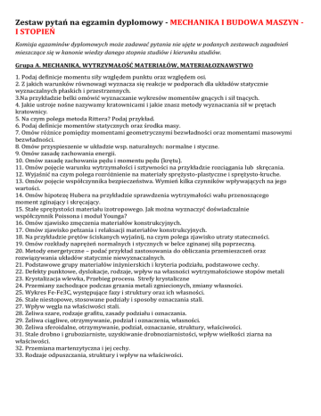 Zestaw pytań na egzamin dyplomowy - MECHANIKA I BUDOWA MASZYN I STOPIEŃ Komisja egzaminów dyplomowych może zadawać pytania nie ujęte w podanych zestawach zagadnień mieszczące się w kanonie wiedzy danego stopnia studiów i kierunku studiów. Grupa A. MECHANIKA, WYTRZYMAŁOŚĆ MATERIAŁÓW, MATERIAŁOZNAWSTWO 1. Podaj definicje momentu siły względem punktu oraz względem osi. 2. Z jakich warunków równowagi wyznacza się reakcje w podporach dla układów statycznie wyznaczalnych płaskich i przestrzennych. 3.Na przykładzie belki omówić wyznaczanie wykresów momentów gnących i sił tnących. 4. Jakie ustroje nośne nazywamy kratownicami i jakie znasz metody wyznaczania sił w prętach kratownicy. 5. Na czym polega metoda Rittera? Podaj przykład. 6. Podaj definicje momentów statycznych oraz środka masy. 7. Omów różnice pomiędzy momentami geometrycznymi bezwładności oraz momentami masowymi bezwładności. 8. Omów przyspieszenie w układzie wsp. naturalnych: normalne i styczne. 9. Omów zasadę zachowania energii. 10. Omów zasadę zachowania pędu i momentu pędu (krętu). 11. Omów pojęcie warunku wytrzymałości i sztywności na przykładzie rozciągania lub skręcania. 12. Wyjaśnić na czym polega rozróżnienie na materiały sprężysto-plastyczne i sprężysto-kruche. 13. Omów pojęcie współczynnika bezpieczeństwa. Wymień kilka czynników wpływających na jego wartości. 14. Omów hipotezę Hubera na przykładzie sprawdzenia wytrzymałości wału przenoszącego moment zginający i skręcający. 15. Stałe sprężystości materiału izotropowego. Jak można wyznaczyć doświadczalnie współczynnik Poissona i moduł Younga? 16. Omów zjawisko zmęczenia materiałów konstrukcyjnych. 17. Omów zjawisko pełzania i relaksacji materiałów konstrukcyjnych. 18. Na przykładzie prętów ściskanych wyjaśnij, na czym polega zjawisko utraty stateczności. 19. Omów rozkłady naprężeń normalnych i stycznych w belce zginanej siłą poprzeczną. 20. Metody energetyczne – podać przykład zastosowania do obliczania przemieszczeń oraz rozwiązywania układów statycznie niewyznaczalnych. 21. Podstawowe grupy materiałów inżynierskich i kryteria podziału, podstawowe cechy. 22. Defekty punktowe, dyslokacje, rodzaje, wpływ na własności wytrzymałościowe stopów metali 23. Krystalizacja wlewka, Przebieg procesu. Strefy krystaliczne 24. Przemiany zachodzące podczas grzania metali zgniecionych, zmiany własności. 25. Wykres Fe-Fe3C, występujące fazy i struktury oraz ich własności. 26. Stale niestopowe, stosowane podziały i sposoby oznaczania stali. 27. Wpływ węgla na właściwości stali. 28. Żeliwa szare, rodzaje grafitu, zasady podziału i oznaczania. 29. Żeliwa ciągliwe, otrzymywanie, podział i oznaczenia, własności. 30. Żeliwa sferoidalne, otrzymywanie, podział, oznaczanie, struktury, właściwości. 31. Stale drobno i gruboziarniste, uzyskiwanie drobnoziarnistości, wpływ wielkości ziarna na właściwości. 32. Przemiana martenzytyczna i jej cechy. 33. Rodzaje odpuszczania, struktury i wpływ na właściwości. Grupa B. KONSTRUKCJE – PKM, TMM 1. Sposób budowy tablic morfologicznych przy generowaniu wariantów rozwiązań. Podać przykłady. 2. Omówić metody wyboru optymalnego wariantu rozwiązania zadania technicznego. 3. Pary kinematyczne: definicja, klasyfikacja 4. Układy racjonalne i nieracjonalne (więzy bierne) 5. Związki wektorowe na prędkości i przyspieszenia dwóch punktów jednego członu w ruchu płaskim 6. Opis położeń mechanizmu za pomocą równań wektorowych i algebraicznych 7. Manipulator: zadanie proste i odwrotne kinematyki i dynamiki 8. Wypadkowa sił bezwładności członu w ruchu płaskim 9. Grupa statycznie wyznaczalna 10. Tarcie w parze krzywkowej (kat tarcia) i obrotowej (koło tarcia) 11. Wymienić cechy konstrukcyjne oraz je omówić. 12. Naprężenie dopuszczalne „k”, sposób wyznaczenia jego wartości przy obciążeniach statycznych i dynamicznych. Podać przykłady. 13. Czynniki wpływające na wytrzymałość zmęczeniową elementów maszyn oraz sposób ich uwzględnienia w obliczeniach konstrukcyjnych. 14. Warunek samohamowności połączenia gwintowego i jego ilustracja na równi pochyłej (rozwinięciu jednego zwoju). 15. Wymienić warunki konieczne aby naciski pomiędzy zwojami śruby i nakrętki były równomierne. 16. Złącze śrubowe podatne, jego istota i wykres pracy. 17. Narysować przekrój poprzeczny połączenia wpustowego piasty koła zębatego z wałkiem oraz omówić zasadę pasowania wpustu i sposób jego doboru. 18. Podać sposób obliczeń połączeń spawanych na przykładzie dwóch blach złączonych spoiną doczołową poddaną obciążeniu rozciągającemu cyklami jednostronnymi. 19. Naprężenia występujące w sprężynie śrubowej walcowej oraz sposób ich uwzględnienia w obliczeniach konstrukcyjnych sprężyn. 20. Wymienić i omówić kryteria, które powinien spełniać wał maszynowy. 21. Drgania wałów, zjawisko rezonansu. 22. Zasady kształtowania wałów maszynowych i sposoby ustalania poosiowego osadzanych na nich elementów. 23. Poślizg sprężysty w pasie przekładni pasowej – jego źródła oraz wpływ na pracę przekładni. 24. Wyjaśnić przyczynę niestabilności przełożenia w przekładni pasowej 25. Sprzęgło Cardana, jego budowa oraz sposób usunięcia pulsacji prędkości obrotowej. 26. Sprzęgła nierozłączne sztywne i podatne, charakterystyka i przykłady rozwiązań konstrukcyjnych. 27. Charakterystyka zarysu ewolwentowego i cykloidalnego zębów kół zębatych. 28. Kryteria doboru łożysk tocznych. 29. Zasada łożyskowania i jej ilustracja na przykładzie wałka dwupodporowego. 30. Zasada pasowania łożysk tocznych, ilustracja tolerancji wymiarów d, D i B w łożysku. 31. Geometria kół zębatych (koło zasadnicze, koło podziałowe, koło toczne, koło wierzchołkowe i stóp, moduł, podziałka, kąt zarysu, kąt przyporu, lin