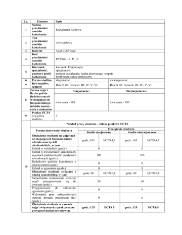 Lp. 1 2 3 4 5 6 7 8 9 Element Nazwa przedmiotu/ modułu kształcenia Typ przedmiotu/ modułu kształcenia Instytut Kod przedmiotu/ modułu kształcenia Kierunek, specjalność, poziom i profil kształcenia Forma studiów Rok studiów, semestr Forma zajęć i liczba godzin dydaktycznych wymagających bezpośredniego udziału nauczyciela i studentów Punkty ECTS (wg planu studiów) Opis Kształcenie ruchowe obowiązkowy Nauk o Zdrowiu PPWSZ – F- P_13 kierunek: Fizjoterapia specjalność: poziom kształcenia: studia pierwszego stopnia profil kształcenia: praktyczny stacjonarne niestacjonarne Rok II ,III Semestr III, IV, V, VI Rok II ,III Semestr III, IV, V, VI Stacjonarne: Niestacjonarne: ćwiczenia - 105 ćwiczenia - 105 5 Nakład pracy studenta – bilans punktów ECTS Forma aktywności studenta 10 Obciążenie studenta na zajęciach wymagających bezpośredniego udziału nauczycieli akademickich, w tym: Udział w wykładach (godz.) Udział w ćwiczeniach/ seminariach/ zajęciach praktycznych/ praktykach zawodowych (godz.) Dodatkowe godziny kontaktowe z nauczycielem (godz.) Udział w egzaminie (godz.) Obciążenie studenta związane z nauką samodzielną, w tym: Samodzielne studiowanie tematyki zajęć/ przygotowanie się do ćwiczeń (godz.) Przygotowanie do zaliczenia/ egzaminu (godz.) Wykonanie prac zaliczeniowych (referat, projekt, prezentacja itd.) (godz.) Obciążenie studenta w ramach zajęć związanych z praktycznym przygotowaniem zawodowym Obciążenie studenta Studia stacjonarne Studia niestacjonarne godz.:105 ECTS:4,2 ECTS:4,2 0 0 105 105 0 0 0 0 godz.:20 godz.:125 godz.:105 ECTS:0,8 godz.:20 ECTS:0,8 20 20 0 0 0 0 ECTS 5 godz.:125 ECTS:5 11 12 13 14 Suma (obciążenie studenta na zajęciach wymagających bezpośredniego godz.:125 ECTS:5 godz.:125 ECTS:5 udziału nauczycieli akademickich oraz związane z nauką samodzielną) Nauczyciel akademicki odpowiedzialny dr Paweł Gąsior, mgr Katarzyna Węgrzyn za przedmiot/ moduł (egzaminujący) Nauczyciele akademiccy dr Paweł Gąsior, mgr Katarzyna Węgrzyn prowadzący przedmiot/ moduł -Znajomość podstawowych zagadnień w odniesieniu do wiedzy i umiejętności z Wymagania wychowania fizycznego, (kompetencje) -podstawowe wiadomości z fizjologii wysiłków fizycznych oraz anatomii, wstępne -znajomość zasad BHP prowadzenia zajęć z pacjentem lub osobą usprawnianą. 1. Opanowanie umiejętności niezbędnych do samodzielnego prowadzenia zajęć ruchowych. Założenia i cele 2. Stosowanie niezbędnych metod, zasad i form w pracy z osobą usprawnianą lub w grupie dyspanseryjnej. przedmiotu 3. Opanowanie zdolności samodzielnego przygotowania programów treningowych i usprawniających dla osób aktywnych, sportowców i pacjentów. Opis efektów kształcenia w zakresie: W1 W2 15 Efekty kształcenia W3 W4 U1 U2 WIEDZY Zna pojęcie kultury fizycznej, a także podstawowe różnice między wychowaniem fizycznym, sportem, rekreacją ruchową i rehabilitacją medyczną Odniesienie do kierunkowych efektów kształcenia K_W02 Potrafi scharakteryzować i wyjaśnić założenia edukacji zdrowotnej, promocji zdrowia i profilaktyki niepełnosprawności K_W16 Posiada wiedzę i zna terminologię nauk o zdrowiu w tym z zakresu fizjoterapii oraz o kulturze fizycznej K_W27 Zna i rozumie mechanizm działania i skutki uboczne zabiegów fizykalnych i aktywności ruchowych stosowanych w zakresie fizjoterapii K_W29 UMIEJĘTNOŚCI Potrafi posługiwać się wiedzą z zakresu budowy anatomicznej i funkcjonowania podstawowych układów człowieka Rozpoznaje struktury ludzkiego ciała oraz ich lokalizację, rozumie zależność między budową a czynnością narządów i potrafi Odniesienie do efektów kształcenia dla obszaru M1_W01 M1_W04 M1_W06 M1_W01 M1_W06 M1_W10 M1_W03 M1_W05 M1_W07 M1_W10 K_U01 M1_U01 M1_U05 K_ U16 M1_U05 U3 U4 U5 programować zabiegi fizjoterapeutyczne, przeprowadzić testy funkcjonalne i badanie niezbędne do wykonywania zabiegów Potrafi przeprowadzić analizę biomechaniczną, kinezjologiczną, prostych i złożonych ruchów człowieka, w warunkach prawidłowych i różnych zaburzeń układu ruchu Potrafi zastosować wiedzę z zakresu zmian patologicznych dla potrzeb diagnostyki funkcjonalnej oraz zabiegów fizjoterapeutycznych Posiada specjalistyczne umiejętności ruchowe niezbędne do prowadzenia zajęć rekreacyjnych, sportowych i estetycznych w fizjoterapii Potrafi prowadzić szkolenie z zakresu promocji zdrowia i profilaktyki odpowiadających potrzebom pacjenta U6 K1 K2 16 Treści kształcenia 17 Stosowane metody dydaktyczne K_ U17 M1_U05 K_ U18 M1_U04 M1_U05 K_ U30 M1_U11 K_ U35 KOMPETENCJI SPOŁECZNYCH Wykazuje inicjatywę i kreatywność w K_K08 działaniu Dba o poziom sprawności fizycznej niezbędnej niezbędnej do wykonywania działalności zawodowej fizjoterapeuty 1. 2. 3. 4. 5. 6. 7. 8. 9. 10. 11. 12. K_K15 M1_U13 M1_K05 M1_U06 M1_K09 Podział i charakterystyka aktów ruchowych Struktura motoryczności Metody kształtowania poszczególnych zdolności motorycznych Sposoby pomiaru i oceny zdolności motorycznych Podstawowe zasady kształtowania stabilizacji mięśniowej Metody w nauczaniu ruchu Metody prowadzenia zajęć ruchowych Zasady i formy w nauczaniu ruchu Elementy zespołowych gier sportowych Gry i zabawy ruchowe Zajęcia terenowe, elementy Nordic Walkingu Ćwiczenia w wodzie i elementy pływania Wykład informacyjny, wykład problemowy, ćwiczenia, dyskusja, samokształcenie. Sposób weryfikacji efektów kształcenia np. egzamin ustny, egzamin Efekt pisemny, zaliczenie ustne, kolokwium, projekt, referat, prezentacja, kształcenia sprawozdanie, dyskusje, obserwacja w czasie zajęć itd. Metody W1 Rozmowa lub praca pisemna weryfikacji W2 efektów W3 18 kształcenia (w odniesieniu do W4 poszczególnych U1 Samodzielne prowadzenie zajęć w grupach dyspanseryjnych i efektów) usprawniających. U2 U3 U4 U5 U6 K1 Rozmowa lub praca pisemna. K2 Kryteria oceny osiągniętych 19 efektów kształcenia Forma i warunki 