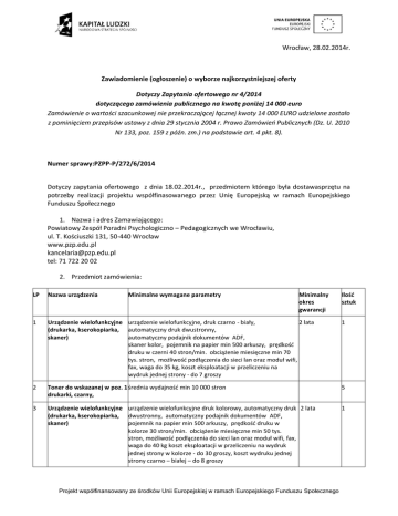 Wrocław, 28.02.2014r. Zawiadomienie (ogłoszenie) o wyborze