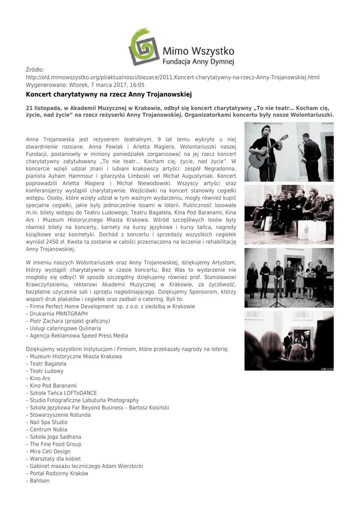 Źródło: http://old.mimowszystko.org/pl/aktualnosci/biezace/2011,Koncert-charytatywny-na-rzecz-Anny-Trojanowskiej.html Wygenerowano: Wtorek, 7 marca 2017, 16:05 Koncert charytatywny na rzecz Anny Trojanowskiej 21 listopada, w Akademii Muzycznej w Krakowie, odbył się koncert charytatywny „To nie teatr… Kocham cię, życie, nad życie” na rzecz reżyserki Anny Trojanowskiej. Organizatorkami koncertu były nasze Wolontariuszki. Anna Trojanowska jest reżyserem teatralnym. 9 lat temu wykryto u niej stwardnienie rozsiane. Anna Pawlak i Arletta Magiera, Wolontariuszki naszej Fundacji, postanowiły w miniony poniedziałek zorganizować na jej rzecz koncert charytatywny zatytułowany „To nie teatr… Kocham cię, życie, nad życie”. W koncercie wzięli udział znani i lubiani krakowscy artyści: zespół Negradonna, pianista Ayham Hammour i gitarzysta Limboski vel Michał Augustyniak. Koncert poprowadzili Arletta Magiera i Michał Niewodowski. Wszyscy artyści oraz konferansjerzy wystąpili charytatywnie. Wejściówki na koncert stanowiły cegiełki wstępu. Osoby, które wzięły udział w tym ważnym wydarzeniu, mogły również kupić specjalne cegiełki, jakie były jednocześnie losami w loterii. Publiczność losowała m.in. bilety wstępu do Teatru Ludowego, Teatru Bagatela, Kina Pod Baranami, Kina Ars i Muzeum Historycznego Miasta Krakowa. Wśród szczęśliwych losów były również bilety na koncerty, karnety na kursy językowe i kursy tańca, nagrody książkowe oraz kosmetyki. Dochód z koncertu i sprzedaży wszystkich cegiełek wyniósł 2450 zł. Kwota ta zostanie w całości przeznaczona na leczenie i rehabilitację Anny Trojanowskiej. W imieniu naszych Wolontariuszek oraz Anny Trojanowskiej, dziękujemy Artystom, którzy wystąpili charytatywnie w czasie koncertu. Bez Was to wydarzenie nie mogłoby się odbyć! W sposób szczególny dziękujemy również prof. Stanisławowi Krawczyńskiemu, rektorowi Akademii Muzycznej w Krakowie, za życzliwość, bezpłatne użyczenie sali i sprzętu nagłaśniającego. Dziękujemy Sponsorom, którzy wsparli druk plakatów i cegiełek oraz zadbali o catering. Byli to: – Firma Perfect Home Development sp. z o.o. z siedzibą w Krakowie – Drukarnia PRINTGRAPH – Piotr Zachara (projekt graficzny) – Usługi cateringowe Qulinaria – Agencja Reklamowa Speed Press Media Dziękujemy wszystkim Instytucjom i Firmom, które przekazały nagrody na loterię: – Muzeum Historyczne Miasta Krakowa – Teatr Bagatela – Teatr Ludowy – Kino Ars – Kino Pod Baranami – Szkoła Tańca LOFToDANCE – Studio Fotograficzne Labuturla Photography – Szkoła Językowa Far Beyond Business – Bartosz Kosiński – Stowarzyszenie Rotunda – Nail Spa Studio – Centrum Nubia – Szkoła Joga Sadhana – The Fine Food Group – Mira Ceti Design – Warsztaty dla kobiet – Gabinet masażu leczniczego Adam Wierzbicki – Portal Rodzinny Kraków – Bahlsen – FM Group Perfumy Dziękujemy także Przyjaciołom, którzy nas wspierali: – Kulturatce i Polskiemu Towarzystwu Stwardnienia Rozsianego Tweet