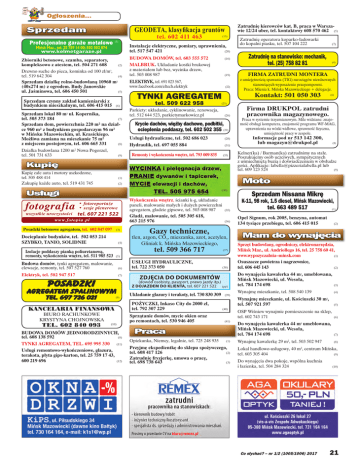 Ogłoszenia... Zatrudnię kierowców kat. B, praca w Warszawie 12/24 uber, tel. kontaktowy 608 570 462 (5) GEODETA, klasyfikacja gruntów Sprzedam Profesjonalne garaże metalowe (1) Mińsk Maz., tel. 25 759 14 00; 502 502 074 www.kelmetgaraze.pl tel. 602 411 463 (13) Instalacje elektryczne, pomiary, uprawnienia, tel. 517 547 421 (20) BUDOWA DOMÓW, tel. 603 555 572 Zbiorniki betonowe, szamba, separatory, kompleksowo z atestem, tel. 504 271 608 (2) Drewno suche do pieca, kominka od 100 zł/m , tel. 519 642 304 (4) 3 Sprzedam działkę rolno-budowlaną 10960 m2 (40x274 m) z ogrodem. Budy Janowskie (5) ul. Jaśminowa, tel. 606 450 501 Sprzedam czynny zakład kamieniarski z budynkiem mieszkalnym, tel. 606 415 015 (6) Sprzedam lokal 80 m2 ul. Kopernika, (7) tel. 505 373 184 Sprzedam dom, powierzchnia 220 m² na działce 960 m² z budynkiem gospodarczym 96 m² w Mińsku Mazowieckim, ul. Krasickiego. Możliwa zamiana na mieszkanie 75 m² (8) z miejscem postojowym, tel. 606 665 331 Działka budowlana 1200 m Nowa Pogorzel, tel. 501 731 633 (16) MALBRUK. Układanie kostki brukowej z materiałem lub bez, wycinka drzew, tel. 503 008 987 (19) ELEKTRYK, tel. 691 023 567, www.facebook.com/eltech.elektryk (22) TYNKI AGREGATEM tel. 509 622 958 (23) Parkiety: układanie, cyklinowanie, renowacja, tel. 512 644 523, parkietymarkowicz.pl (26) Krycie dachów, więźby dachowe, podbitki, ocieplenia poddaszy, tel. 602 502 355 (29) Usługi hydrauliczne, tel. 502 686 023 (28) Hydraulik, tel. 697 055 884 (31) Remonty i wykończenia wnętrz, tel. 793 009 835 (33) Kupię Kupię całe auta i motory uszkodzone, tel. 505 488 414 (1) Zakupię każde auto, tel. 519 431 745 (2) wszystkie uroczystości (30) • fotoreportaże • sesje plenerowe tel. 607 221 522 www.fotopia.pl Posadzki betonowe agregatem, tel. 602 847 097 (3) Docieplanie budynków, tel. 502 053 214 SZYBKO, TANIO, SOLIDNIE (4) Izolacje poddaszy pianką poliuretanową, remonty, wykończenia wnętrz, tel. 511 985 523 (6) (7) Posadzki (9) Gazy techniczne, tlen, argon, CO2, mieszanka, azot, acetylen, Gliniak k. Mińska Mazowieckiego, USŁUGI HYDRAULICZNE, tel. 722 373 050 (37) (38) Układanie glazury i terakoty, tel. 730 830 309 Sprzątanie domów, mycie okien oraz po remontach, tel. 530 946 405 (10) BUDOWA DOMÓW JEDNORODZINNYCH, (8) tel. 608 138 592 TYNKI AGREGATEM, TEL. 695 995 330 (11) Usługi remontowo-wykończeniowe, glazura, terakota, płyta gips-karton, tel. 25 759 17 43, 600 219 696 (12) FIRMA ZATRUDNI MONTERA z umiejętnością spawania (TIG) rurociągów nierdzewnych stanowiących wyposażenie przepompowni. Praca: Mienia k. Mińska Mazowieckiego + delegacje. (6) Firma DRUKPOL zatrudni pracownika magazynowego. Praca w systemie trzyzmianowym. Mile widziane: znajomość obsługi komputera, znajomość programu WF-MAG, uprawnienia na wózki widłowe, sprawność fizyczna, umiejętność pracy w zespole. Informacje pod nr 513 142 300, lub [email protected] (8) Kelner(ka) / Barman(ka) zatrudnimy na stałe. Poszukujemy osób uczciwych, sympatycznych z uśmiechniętą buzią i doświadczeniem w obsłudze gości. Aplikacje: [email protected] lub tel. 609 123 524 (9) (39) (40) (41) Praca Opiekunka, Niemcy, legalnie, tel. 725 248 935 Sprzedam Nissana Mikrę K-11, 98 rok, 1.5 diesel, Mińsk Mazowiecki, tel. 663 489 517 (1) Opel Signum, rok 2005, benzyna, automat 134 tysiące przebiegu, tel. 606 415 015 (2) Mam do wynajęcia Sprzęt budowlany, ogrodniczy, elektronarzędzia, Mińsk Maz., ul. Andriollego 16, tel. 25 758 60 41, www.wypozyczalnia–minsk.com (1) Osuszacze powietrza i nagrzewnice, tel. 606 445 143 (2) Do wynajęcia kawalerka 44 m , umeblowana, Mińsk Mazowiecki, ul. Wesoła, tel. 784 174 698 (3) Wynajmę mieszkanie, tel. 508 540 139 (4) Wynajmę mieszkanie, ul. Kościuszki 30 m2, tel. 507 921 597 (5) OSP Wiśniew wynajmie pomieszczenie na sklep, tel. 602 743 171 (6) Do wynajęcia kawalerka 44 m2 umeblowana, Mińsk Mazowiecki, ul. Wesoła, tel. 784 174 698 (7) Wynajmę kawalerkę 29 m , tel. 503 502 947 (8) 2 ZDJĘCIA DO DOKUMENTÓW POŻYCZKI, Inkaso City do 2000 zł, tel. 792 307 229 KANCELARIA FINANSOWA TEL. 602 840 093 (36) (dowód osobisty, paszport, prawo jazdy itp.) Z DOJAZDEM DO KLIENTA, tel. 607 221 522 (pp) agregatem spalinowym BIURO RACHUNKOWE KRYSTYNA CHOJNOWSKA (35) Gładź, malowanie, tel. 505 305 618, 663 215 976 (5) Elektryk, tel. 502 947 517 tel. 697 726 021 Wykończenia wnętrz, ścianki k-g, układanie paneli, malowanie małych i dużych powierzchni agregatem, gładzie gipsowe, tel. 503 008 987 tel. 509 366 717 Budowa domów, tynki agregatem, malowanie, elewacje, remonty, tel. 507 527 760 (4) Moto Usługi fotografia (7) Zatrudnię na stanowisko: mechanik, tel. (25) 758 82 81 Kontakt: 501 050 303 2 (9) Zatrudnię operatora koparko-ładowarki do kopalni piasku, tel. 507 104 222 (1) Przyjmę ekspedientkę do sklepu spożywczego, (2) tel. 608 417 126 Zatrudnię fryzjerkę, umowa o pracę, tel. 698 738 643 (3) 2 Lokal handlowo-usługowy, 40 m2, centrum Mińska, tel. 603 305 404 (9) Do wynajęcia dwa pokoje, wspólna kuchnia i łazienka, tel. 504 284 324 Co słychać? – nr 1/2 (1005/1006) 2017 (10) 21