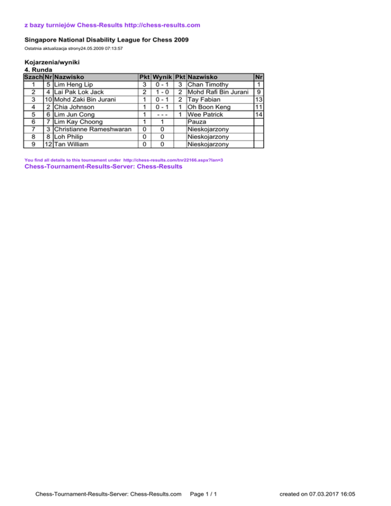 z bazy turniejów Chess-Results http://chess-results.com Singapore National Disability League for Chess 2009 Ostatnia aktualizacja strony24.05.2009 07:13:57 Kojarzenia/wyniki 4. Runda Szach Nr Nazwisko 1 5 Lim Heng Lip 2 4 Lai Pak Lok Jack 3 10 Mohd Zaki Bin Jurani 4 2 Chia Johnson 5 6 Lim Jun Cong 6 7 Lim Kay Choong 7 3 Christianne Rameshwaran 8 8 Loh Philip 9 12 Tan William Pkt 3 2 1 1 1 1 0 0 0 Wynik 0-1 1-0 0-1 0-1 --1 0 0 0 Pkt 3 2 2 1 1 Nazwisko Chan Timothy Mohd Rafi Bin Jurani Tay Fabian Oh Boon Keng Wee Patrick Pauza Nieskojarzony Nieskojarzony Nieskojarzony Nr 1 9 13 11 14 You find all details to this tournament under http://chess-results.com/tnr22166.aspx?lan=3 Chess-Tournament-Results-Server: Chess-Results Chess-Tournament-Results-Server: Chess-Results.com Page 1 / 1 created on 07.03.2017 16:05
