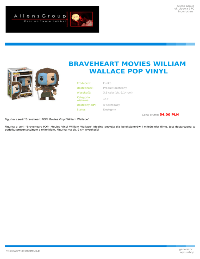 Aliens Group ul. Lipowa 17C Inowrocław BRAVEHEART MOVIES WILLIAM WALLACE POP VINYL Producent: Funko Dostępność: Produkt dostępny Wysokość: 3.6 cala (ok. 9,14 cm) Kategoria wiekowa: 14+ Dostępny od*: w sprzedaży Status: Dostępny Cena brutto: 54,00 PLN Figurka z serii "Braveheart POP! Movies Vinyl William Wallace" Figurka z serii "Braveheart POP! Movies Vinyl William Wallace" Idealna pozycja dla kolekcjonerów i miłośników filmu. Jest dostarczana w pudełku prezentacyjnym z okienkiem. Figurka ma ok. 9 cm wysokości http://www.aliensgroup.pl generator: aptusshop