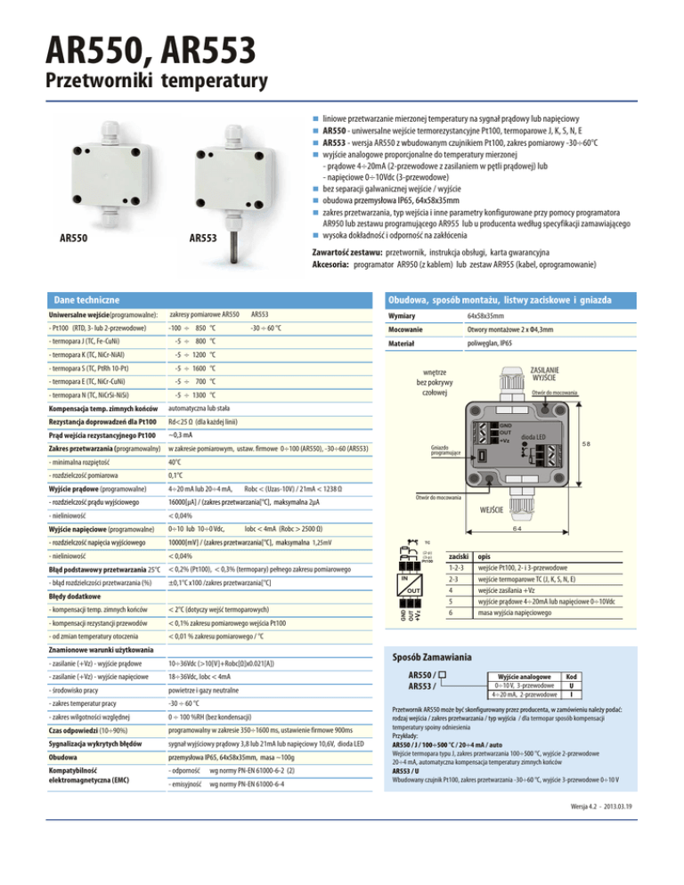 AR550, AR553 Przetworniki temperatury n liniowe przetwarzanie mierzonej temperatury na sygnał prądowy lub napięciowy n AR550 - uniwersalne wejście termorezystancyjne Pt100, termoparowe J, K, S, N, E AR553 - wersja AR550 z wbudowanym czujnikiem Pt100, zakres pomiarowy -30÷60°C n wyjście analogowe proporcjonalne do temperatury mierzonej n AR550 - prądowe 4÷20mA (2-przewodowe z zasilaniem w pętli prądowej) lub - napięciowe 0÷10Vdc (3-przewodowe) bez separacji galwanicznej wejście / wyjście n obudowa przemysłowa IP65, 64x58x35mm n zakres przetwarzania, typ wejścia i inne parametry konfigurowane przy pomocy programatora n AR950 lub zestawu programującego AR955 lub u producenta według specyfikacji zamawiającego wysoka dokładność i odporność na zakłócenia n AR553 Zawartość zestawu: przetwornik, instrukcja obsługi, karta gwarancyjna Akcesoria: programator AR950 (z kablem) lub zestaw AR955 (kabel, oprogramowanie) Dane techniczne Obudowa, sposób montażu, listwy zaciskowe i gniazda Uniwersalne wejście(programowalne): zakresy pomiarowe AR550 AR553 Wymiary 64x58x35mm - Pt100 (RTD, 3- lub 2-przewodowe) -100 ÷ 850 °C -30 ÷ 60 °C Mocowanie Otwory montażowe 2 x Φ4,3mm Materiał poliwęglan, IP65 - termopara J (TC, Fe-CuNi) -5 ÷ 800 °C - termopara K (TC, NiCr-NiAl) -5 ÷ 1200 °C - termopara S (TC, PtRh 10-Pt) -5 ÷ 1600 °C - termopara E (TC, NiCr-CuNi) -5 ÷ 700 °C - termopara N (TC, NiCrSi-NiSi) -5 ÷ 1300 °C Kompensacja temp. zimnych końców automatyczna lub stała Rezystancja doprowadzeń dla Pt100 Rd<25 Ω (dla każdej linii) Prąd wejścia rezystancyjnego Pt100 ~0,3 mA Otwór do mocowania 6 GND 5 OUT 4 +Vz 40°C - rozdzielczość pomiarowa 0,1°C Wyjście prądowe (programowalne) 4÷20 mA lub 20÷4 mA, - rozdzielczość prądu wyjściowego 16000[µA] / (zakres przetwarzania[°C], maksymalna 2µA - nieliniowość < 0,04% Wyjście napięciowe (programowalne) 0÷10 lub 10÷0 Vdc, - rozdzielczość napięcia wyjściowego 10000[mV] / (zakres przetwarzania[°C], maksymalna 1,25mV - nieliniowość < 0,04% + - minimalna rozpiętość dioda LED - Gniazdo programujące Zakres przetwarzania (programowalny) w zakresie pomiarowym, ustaw. firmowe 0÷100 (AR550), -30÷60 (AR553) 58 3 2 1 Robc < (Uzas-10V) / 21mA < 1238 Ω Otwór do mocowania WEJŚCIE Iobc < 4mA (Robc > 2500 Ω) + ±0,1°C x100 /zakres przetwarzania[°C] 64 - Błąd podstawowy przetwarzania 25°C < 0,2% (Pt100), < 0,3% (termopary) pełnego zakresu pomiarowego 1 2 3 IN OUT - kompensacji temp. zimnych końców < 2°C (dotyczy wejść termoparowych) - kompensacji rezystancji przewodów < 0,1% zakresu pomiarowego wejścia Pt100 - od zmian temperatury otoczenia < 0,01 % zakresu pomiarowego / °C Znamionowe warunki użytkowania - zasilanie (+Vz) - wyjście prądowe 10÷36Vdc (>10[V]+Robc[Ω]x0.021[A]) - zasilanie (+Vz) - wyjście napięciowe 18÷36Vdc, Iobc < 4mA - środowisko pracy powietrze i gazy neutralne - zakres temperatur pracy -30 ÷ 60 °C - zakres wilgotności względnej 0 ÷ 100 %RH (bez kondensacji) Czas odpowiedzi (10÷90%) programowalny w zakresie 350÷1600 ms, ustawienie firmowe 900ms Sygnalizacja wykrytych błędów sygnał wyjściowy prądowy 3,8 lub 21mA lub napięciowy 10,6V, dioda LED Obudowa przemysłowa IP65, 64x58x35mm, masa ~100g Kompatybilność elektromagnetyczna (EMC) - odporność wg normy PN-EN 61000-6-2 (2) - emisyjność wg normy PN-EN 61000-6-4 6 5 4 GND OUT Błędy dodatkowe +Vz - błąd rozdzielczości przetwarzania (%) ZASILANIE WYJŚCIE wnętrze bez pokrywy czołowej TC (2-p) (3-p) Pt100 zaciski 1-2-3 2-3 4 5 6 opis wejście Pt100, 2- i 3-przewodowe wejście termoparowe TC (J, K, S, N, E) wejście zasilania +Vz wyjście prądowe 4÷20mA lub napięciowe 0÷10Vdc masa wyjścia napięciowego Sposób Zamawiania AR550 / o Wyjście analogowe 0÷10 V, 3-przewodowe AR553 / 4÷20 mA, 2-przewodowe Kod U I Przetwornik AR550 może być skonfigurowany przez producenta, w zamówieniu należy podać: rodzaj wejścia / zakres przetwarzania / typ wyjścia / dla termopar sposób kompensacji temperatury spoiny odniesienia Przykłady: AR550 / J / 100÷500 °C / 20÷4 mA / auto Wejście termopara typu J, zakres przetwarzania 100÷500 °C, wyjście 2-przewodowe 20÷4 mA, automatyczna kompensacja temperatury zimnych końców AR553 / U Wbudowany czujnik Pt100, zakres przetwarzania -30÷60 °C, wyjście 3-przewodowe 0÷10 V Wersja 4.2 - 2013.03.19