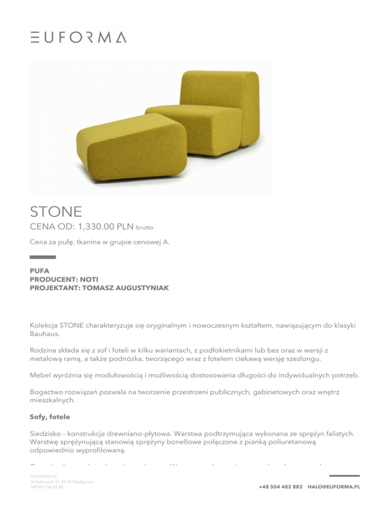 STONE CENA OD: 1,330.00 PLN brutto Cena za pufę, tkanina w grupie cenowej A. PUFA PRODUCENT: NOTI PROJEKTANT: TOMASZ AUGUSTYNIAK Kolekcja STONE charakteryzuje się oryginalnym i nowoczesnym kształtem, nawiązującym do klasyki Bauhaus. Rodzina składa się z sof i foteli w kilku wariantach, z podłokietnikami lub bez oraz w wersji z metalową ramą, a także podnóżka, tworzącego wraz z fotelem ciekawą wersję szezlongu. Mebel wyróżnia się modułowością i możliwością dostosowania długości do indywidualnych potrzeb. Bogactwo rozwiązań pozwala na tworzenie przestrzeni publicznych, gabinetowych oraz wnętrz mieszkalnych. Sofy, fotele Siedzisko – konstrukcja drewniano-płytowa. Warstwa podtrzymująca wykonana ze sprężyn falistych. Warstwę sprężynującą stanowią sprężyny bonellowe połączone z pianką poliuretanową odpowiednio wyprofilowaną. Oparcie – konstrukcja drewniano-płytowa. Warstwa podtrzymująca twarda wykonana z płyty pilśniowej. Warstwę sprężynującą stanowi pianka poliuretanowa odpowiednio wyprofilowana. Podłokietniki – występują w trzech wersjach tapicerowanych, zbudowanych z elementów drewnianych i płytowych, pokrytych pianką poliuretanową. Wersja z rur 25mm lakierowanych wg dostępnej kolorystyki, chromowanych lub ze stali nierdzewnej. Powered by TCPDF (www.tcpdf.org)