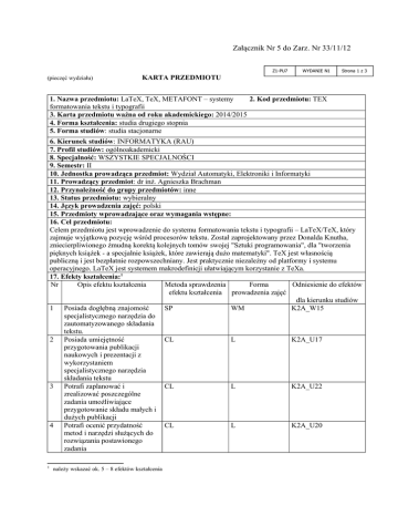 Załącznik Nr 5 do Zarz. Nr 33/11/12 Z1-PU7 (pieczęć wydziału) WYDANIE N1 Strona 1 z 3 KARTA PRZEDMIOTU 1. Nazwa przedmiotu: LaTeX, TeX, METAFONT – systemy 2. Kod przedmiotu: TEX formatowania tekstu i typografii 3. Karta przedmiotu ważna od roku akademickiego: 2014/2015 4. Forma kształcenia: studia drugiego stopnia 5. Forma studiów: studia stacjonarne 6. Kierunek studiów: INFORMATYKA (RAU) 7. Profil studiów: ogólnoakademicki 8. Specjalność: WSZYSTKIE SPECJALNOŚCI 9. Semestr: II 10. Jednostka prowadząca przedmiot: Wydział Automatyki, Elektroniki i Informatyki 11. Prowadzący przedmiot: dr inż. Agnieszka Brachman 12. Przynależność do grupy przedmiotów: inne 13. Status przedmiotu: wybieralny 14. Język prowadzenia zajęć: polski 15. Przedmioty wprowadzające oraz wymagania wstępne: 16. Cel przedmiotu: Celem przedmiotu jest wprowadzenie do systemu formatowania tekstu i typografii – LaTeX/TeX, który zajmuje wyjątkową pozycję wśród procesorów tekstu. Został zaprojektowany przez Donalda Knutha, zniecierpliwionego żmudną korektą kolejnych tomów swojej "Sztuki programowania", dla "tworzenia pięknych książek - a specjalnie książek, które zawierają dużo matematyki". TeX jest własnością publiczną i jest bezpłatnie rozpowszechniany. Jest praktycznie niezależny od platformy i systemu operacyjnego. LaTeX jest systemem makrodefinicji ułatwiającym korzystanie z TeXa. 17. Efekty kształcenia:1 Nr Opis efektu kształcenia Metoda sprawdzenia Forma Odniesienie do efektów efektu kształcenia prowadzenia zajęć dla kierunku studiów 1 Posiada dogłębną znajomość SP WM K2A_W15 specjalistycznego narzędzia do zautomatyzowanego składania tekstu. 2 Posiada umiejętność CL L K2A_U17 przygotowania publikacji naukowych i prezentacji z wykorzystaniem specjalistycznego narzędzia składania tekstu 3 Potrafi zaplanować i CL L K2A_U22 zrealizować poszczególne zadania umożliwiające przygotowanie składu małych i dużych publikacji 4 Potrafi ocenić przydatność CL L K2A_U20 metod i narzędzi służących do rozwiązania postawionego zadania 1 należy wskazać ok. 5 – 8 efektów kształcenia 5 Rozumie potrzebę dalszego dokształcania się CL L K2A_K01 18. Formy zajęć dydaktycznych i ich wymiar (liczba godzin) W. 30 Ćw. -- L. 30 P. -- Sem. II 19. Treści kształcenia: (oddzielnie dla każdej z form zajęć dydaktycznych W./Ćw./L./P./Sem.) Wykłady Ogólna postać tekstu: zasady tworzenia pliku wejściowego, elementy stałe pliku. Predefiniowane formy dokumentu, zmiany formatu, które można zdefiniować w preambule tekstu (rozmiar strony, typ numeracji, marginesy, żywa pagina, stopka). Definiowanie wielkości i kroju czcionki, znaki specjalne, akcenty, polskie litery. Miary odległości, tworzenie poziomych i pionowych odstępów, tworzenie odnośników, łamanie linii i stron. Ustalanie elementów niepodzielnych. Druk wielokolumnowy. Alfabet grecki i cyrylica. Teksty matematyczne: przejście do otoczenia matematycznego, zapis symboli i wyrażeń matematycznych (indeksy, ułamki, pierwiastki, równania i ich układy, macierze, wzory o złożonej strukturze), odstępy i pogrubienia w trybie matematycznym. Struktury specjalne w tekście: definiowanie list i tablic, tabulacja, tworzenie rysunków i włączanie ich do tekstu, język zapisu figur geometrycznych, definiowanie ministron. Zmiany definicji, tworzenie własnych definicji i definiowanie nowego otoczenia. Struktura dokumentu: podział dokumentu na części, rozdziały, sekcje, paragrafy itp., strona tytułowa, plik główny i pliki dołączone, tworzenie spisu treści, spisu rysunków i tablic, dołączanie bibliografii, tworzenie indeksu terminów w tekście, odwołania poprzez etykiety, posługiwanie się licznikami. Poprawianie błędów: komunikaty o błędach i ostrzeżenia w LaTeX-u i TeX-u, możliwości korekcji błędów. Definiowanie własnych form dokumentów: budowa pliku opisu stylu i możliwości zmian jego zawartości. Projektowanie formy żywej paginy i stopki drukarskiej, definiowanie sposobu zmiany parametrów typu listy, zmiany obiektów o płynnym położeniu, projektowanie formy nagłówków rozdziałów i podrozdziałów, zmiany formatu spisu treści i bibliografii. Tworzenie nowych zmiennych obiektów. Zestawy znaków: dołączanie nowego zestawu, zmiana skali znaków, definiowanie typu czcionki, powiązania słowa kluczowego ze znakami tej samej rodziny, sposób wiązania podstawowej i względnej wielkości z rodziną zestawów znaków. Wykorzystanie języka METAFONT do tworzenia własnych czcionek i znaków: opis języka — sposób zapisu współrzędnych, tworzenie linii krzywych, wypełnianie powierzchni, skalowanie i transformacje znaków. Opis instalacji i inicjalizacji pakietu, programy wydruku na drukarkę laserową i mozaikową, ustawianie zmiennych systemowych, plik podziału słów, tabele zestawów znaków. Zakres laboratorium Celem laboratorium jest nabycie umiejętności składania złożonych tekstów, przy wykorzystaniu wszystkich metod prezentowanych na wykładzie. Składanie tekstów o narastającej złożoności, dobór wielkości i kroju czcionki, projektowanie układu tekstu, skład tabel, złożonych wzorów matematycznych i tekstów matematycznych, tworzenie i wstawianie rysunków, analiza plików stylu i projektowanie własnych stylów (książki, czasopisma, raportu, pracy dyplomowej), złożenie wszystkich ćwiczeń w jednolity dokument mający formę książki, ze spisem treści, literaturą, załącznikami i indeksem. 20. Egzamin: nie (opcjonalny) 21. Literatura podstawowa: Leslie Lamport, LATEX. System opracowywania dokumentów, Podręcznik i przewodnik użytkownika, WNT 22. Literatura uzupełniająca: Antoni Diller, LaTeX. Wiersz po wierszu, Helion, 23. Nakład pracy studenta potrzebny do osiągnięcia efektów kształcenia Lp. Forma zajęć 1 2 3 4 5 6 Liczba godzin kontaktowych / pracy studenta 30 / 15 -/30 / 20 -/-/15 / 10 75 / 45 Wykła