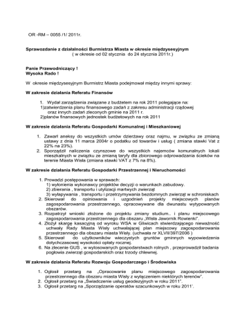OR -RM – 0055 /1/ 2011r. Sprawozdanie z działalności Burmistrza Miasta w okresie międzysesyjnym ( w okresie od 02 stycznia do 24 stycznia 2011r.) Panie Przewodniczący ! Wysoka Rado ! W okresie międzysesyjnym Burmistrz Miasta podejmował między innymi sprawy: W zakresie działania Referatu Finansów 1. Wydał zarządzenia związane z budżetem na rok 2011 polegające na: 1)zatwierdzenia planu finansowego zadań z zakresu administracji rządowej oraz innych zadań zleconych gminie na 2011 r. 2)planów finansowych jednostek budżetowych na rok 2011 W zakresie działania Referatu Gospodarki Komunalnej i Mieszkaniowej 1. Zawarł aneksy do wszystkich umów dzierżawy oraz najmu, w związku ze zmianą ustawy z dnia 11 marca 2004r o podatku od towarów i usług ( zmiana stawki Vat z 22% na 23%). 2. Sporządził naliczenia czynszowe do wszystkich najemców komunalnych lokali mieszkalnych w związku ze zmianą taryfy dla zbiorowego odprowadzania ścieków na terenie Miasta Wisła (zmiana stawki VAT z 7% na 8%). W zakresie działania Referatu Gospodarki Przestrzennej i Nieruchomości 1. Prowadzi postępowania w sprawach: 1) wyłonienia wykonawcy projektów decyzji o warunkach zabudowy. 2) zbierania , transportu i utylizacji martwych zwierząt 3) wyłapywania , transportu i przetrzymywania bezdomnych zwierząt w schroniskach 2. Skierował do opiniowania i uzgodnień projekty miejscowych planów zagospodarowania przestrzennego, opracowywane dla dwunastu wytypowanych obszarów. 3. Rozpatrzył wnioski złożone do projektu zmiany studium.. i planu miejscowego zagospodarowania przestrzennego dla obszaru „Wisła Jawornik Rowienki”. 4. Złożył skargę kasacyjną od wyroku WSA w Gliwicach stwierdzającego nieważność uchwały Rady Miasta Wisły uchwalającej plan miejscowy zagospodarowania przestrzennego dla obszaru miasta Wisły. (uchwała nr XLVII/397/2006 ) 5. Skierował do użytkowników wieczystych gruntów gminnych wypowiedzenia dotychczasowej wysokości opłaty rocznej. 6. Na zlecenie GUS , w wylosowanych gospodarstwach rolnych , przeprowadził badania pogłowia zwierząt gospodarskich oraz trzody chlewnej. W zakresie działania Referatu Rozwoju Gospodarczego i Środowiska 1. Ogłosił przetarg na „Opracowanie planu miejscowego zagospodarowania przestrzennego dla obszaru miasta Wisły z wyłączeniem niektórych terenów”. 2. Ogłosił przetarg na „Świadczenie usług geodezyjnych w roku 2011”. 3. Ogłosił przetarg na „Sporządzanie operatów szacunkowych w roku 2011’. 4. Ogłosił przetarg na „Ubezpieczenie majątku oraz ryzyk związanych z działalnością Gminy WISŁA wraz z jednostkami organizacyjnymi i instytucjami kultury”. 5. Złożył wniosek o dofinansowanie projektu pn. „Wiślański szlak przyrodniczy - ochrona przyrody u źródeł”. 6. Uzyskał informację o dofinansowaniu projektu Gminy Wisła pn. „Komputer jest dobry na wszystko” (szkolenia komputerowe). 7. Uzyskał informację o dofinansowaniu projektu Gminy Wisła pn. „Jabłonków-Wisła na turystycznych ścieżkach transgranicznych - etap II” (ścieżka zdrowia na Jonidle). W zakresie działania Miejskiej Służby Drogowej 1. Rozstrzygnął przetarg na „Usługi w zakresie utrzymania czystości w mieście Wisła, w roku 2011”. Podpisano umowę z Przedsiębiorstwem Transportowo - UsługowoHandlowym „Eko- Groń” .Wartość podpisanej umowy 589.000,00zł. 2. Ogłosił zapytanie ofertowe na dostawę i transport żużla na drogi gminne . W wyniku postępowania podpisano umowę z Przedsiębiorstwem Transportowo Usługowo-Handlowym „Eko- Groń” . Wartość podpisanej umowy 30.000,00zł. 3. Ogłosił zapytania ofertowe na usługi ślusarskie (prace polegające na remontach barier na mostach w ciągu dróg gminnych i powiatowych). 4. Ogłosił zapytanie ofertowe na usługi koparko- ładowarką . W zakresie działania Referatu Spraw Społecznych Przeprowadził rejestrację kobiet i mężczyzn rocznika 1992. W zakresie działania Miejskiego Zespołu Ekonomiczno-Administracyjnego Szkół 1. Przyjął zarządzenie z dnia 13 grudnia 2010r. w sprawie przyznania pomocy zdrowotnej dla nauczycieli. 2. Przyjął zarządzenie z dnia 29 grudnia 2010r. w sprawie przyznania dodatków motywacyjnych dla dyrektorów szkół i przedszkoli. 3. Przyjął zarządzenie z dnia 29 grudnia 2010r. w sprawie przyznania dodatków funkcyjnych dla dyrektorów szkół i przedszkoli. 4. Udzielił odpowiedzi na pismo z dnia 28 grudnia 2010r. Pani Lidii Janota Prezes Oddziału ZNP w Wiśle w sprawie wynagrodzeń pracowników administracji i obsługi w placówkach oświatowych. W zakresie działania Referatu Organizacyjnego 1. W Dniu 17 grudnia 2010 r. uczestniczył w spotkaniu zarządu Śląsko-Beskidzkiego Związku Narciarskiego. 2. W dniu 28 grudnia 2010 r. przywitał na rynku w Wiśle Prezydenta RP Bronisława Komorowskiego wraz z małżonką, a później brał udział w spotkaniu na Zameczku Prezydenckim wraz z władzami samorządowymi z całego powiatu. 3. W dniu 29 grudnia 2010 r. brał udział, w organizowanym przez Wiślańskie Centrum Kultury, trzecim Koncercie Kolęd, w którym uczestniczył także Prezydent RP wraz z małżonką. 4. W dniu 30 grudnia 2010 r. spotkał się z Prezydentem RP na skoczni w Wiśle-Malince. 5. W dniu 1 stycznia 2011 r. uczestniczył w ekumenicznym nabożeństwie noworocznym w kaplicy na Zadnim Groniu wraz z Prezydentem RP i jego małżonką oraz władzami samorządowymi z całego powiatu. 6. W dniu 12-13 stycznia 2011 r. brał udział w wyjazdowym posiedzeniu Wójtów, Burmistrzów, Prezydentów i Starostów Samorządów Lokalnych Euroregionu Śląsk Cieszyński w Kyjovie (Brno). 7. W dniu 14 stycznia 2011 r. spotkał się m.in. z Przewodniczącym Parlamentu Europejskiego – prof. Jerzym Buzkiem w ramach Spotkań Samorządowców Ewangelików organizowanych przez Parafię w Wiśle-Centrum. 8. W dniu 15 stycznia 2011 r. uczestniczył w Koncercie Noworocznym oraz III Wiślańskim Balu 