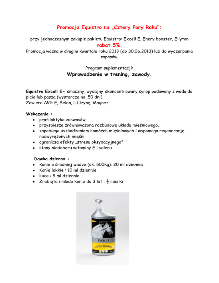 Promocja Equistro na „Cztery Pory Roku”: przy jednoczesnym zakupie pakietu Equistro: Excell E, Enery booster, Ellytan rabat 5%. Promocja ważna w drugim kwartale roku 2013 (do 30.06.2013) lub do wyczerpania zapasów. Program suplementacji: Wprowadzenie w trening, zawody. Equistro Excell E- smaczny, wydajny skoncentrowany syrop podawany z wodą do picia lub paszą (wystarcza na 50 dni) Zawiera :Wit E, Selen, L Lizynę, Magnez. Wskazania : profilaktyka zakwasów przyspiesza zrównoważoną rozbudowę układu mięśniowego, zapobiega uszkodzeniom komórek mięśniowych i wspomaga regenerację nadwyrężonych mięśni ogranicza efekty „stresu oksydacyjnego” stany niedoboru witaminy E i selenu Dawka dzienna : Konie o średniej wadze (ok. 500kg): 20 ml dziennie Konie lekkie : 10 ml dziennie kuce : 5 ml dziennie Źrebięta i młode konie do 3 lat : ½ miarki Natychmiastowa poprawa wydolności koni sportowych Energy Booster jest wieloskładnikowym, wysokoenergetycznym koncentratem, uzupełniającym zwiększone zapotrzebowanie zwierząt na makro - i mikroelementy oraz witaminy z grupy B i witaminę E. Sytuacje stresowe – obciążenie organizmu podczas treningu, zawodów sportowych, okres rekonwalescencji wymagają regeneracji oraz stabilizacji. Equistro Energy Booster dostarcza składników odżywczych o wysokim stopniu czystości i gwarantuje optymalną biodostępność i skuteczność. Magnez -zapewnia utrzymanie prawidłowej pobudliwości tkanki nerwowej i zwiększa odporność na stres, wpływa stabilizująco na psychikę koni Witamina E – niezbędna do przemian anabolicznych w mięśniach szkieletowych, podnoszenia wydolności fizycznej i utrzymywania dobrej kondycji Witamina B-kompleks – przyspiesza regenerację organizmu Żelazo i cynk – konieczne w procesie erytropoezy (tworzeniu krwinek) Aminokwasy – niezbędne do budowy białek Składniki mineralne – uzupełnianie niedoborów elektrolitów wskutek pocenia się oraz szybkiej regeneracji po wysiłku fizycznym Stosowanie i dawkowanie: Koncentrat jest przeznaczony dla koni startujących w zawodach, dla źrebiąt, a także dla zwierząt osłabionych, w okresie rekonwalescencji i w sytuacjach stresowych. Koncentrat podawać bezpośrednio do jamy ustnej przy pomocy dozownika lub z paszą. Konie sportowe: 1 dozownik (20 g) 2 razy w tygodniu oraz 1 dozownik na 4-6 godzin przed i 1 po ukończeniu zawodów Źrebięta, pony: ½ wyżej zalecanej dawki EQUISTRO ELYTAAN - Preparat elektrolitowy dla koni z dodatkiem mikroelementów, witamin i aminokwasów Wskazania i stosowanie: Preparat jest przeznaczony dla zwierząt w okresie zwiększonego obciążenia (trening, zawody, transport) oraz dla zwierząt osłabionych, w okresie rekonwalescencji i w sytuacjach stresowych. Działanie: Preparat przywraca homeostazę wodno-elektrolitową uzupełniając straty wody i elektrolitów zachodzące podczas intensywnego wysiłku, a także podczas stanów chorobowych przebiegających z podwyższeniem temperatury i przy biegunkach. Skraca czas regeneracji organizmu, podnosi wydolność fizyczną i wytrzymałość. Dzięki zawartości aminokwasów egzogennych poprawia wykorzystanie karmy. Dawkowanie: Podawać bezpośrednio do jamy ustnej lub w wodzie do picia w ilości: Konie dorosłe: 20 ml dziennie (1 objętość dozownika) Źrebięta, pony: 10 ml dziennie W razie konieczności dawka dzienna może ulec podwojeniu. Przed użyciem preparat wstrząsnąć