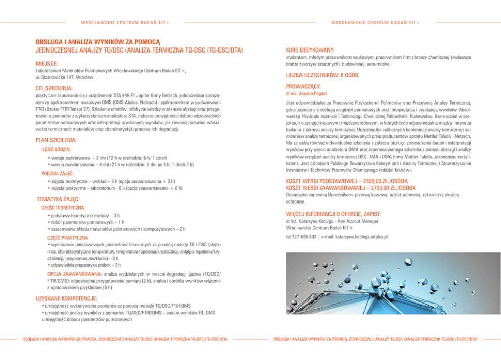 WROCŁAWSKIE CENTRUM BADAŃ EIT+ OBSŁUGA I ANALIZA WYNIKÓW ZA POMOCĄ JEDNOCZESNEJ ANALIZY TG/DSC (ANALIZA TERMICZNA TG-DSC (TG-DSC/DTA) WROCŁAWSKIE CENTRUM BADAŃ EIT+ KURS DEDYKOWANY: MIEJSCE: studentom, młodym pracownikom naukowym, pracownikom firm z branży chemicznej (zwłaszcza branża tworzyw sztucznych), budowlanej, auto-motive. Laboratorium Materiałów Polimerowych Wrocławskiego Centrum Badań EIT+, ul. Stabłowicka 147, Wrocław LICZBA UCZESTNIKÓW: 6 OSÓB CEL SZKOLENIA: PROWADZĄCY: praktyczne zapoznanie się z urządzeniem STA 449 F1 Jupiter firmy Netzsch, jednocześnie sprzężonym ze spektrometrem masowym QMS (QMS Aëolos, Netzsch) i spektrometrem w podczerwieni FTIR (Bruker FTIR Tensor 27). Szkolenie umożliwi zdobycie wiedzy w zakresie obsługi oraz przygotowania pomiarów z wykorzystaniem analizatora STA, nabycie umiejętności doboru odpowiednich parametrów pomiarowych oraz interpretacji uzyskanych wyników, jak również poznania właściwości termicznych materiałów oraz charakterystyki procesu ich degradacji. PLAN SZKOLENIA: ILOŚĆ GODZIN: • wersja podstawowa – 2 dni (12 h w rozkładzie: 6 h/ 1 dzień) •wersja zaawansowana – 4 dni (21 h w rozkładzie: 3 dni po 6 h; 1 dzień 3 h) PODZIAŁ ZAJĘĆ: • zajęcia teoretyczne – wykład – 6 h (opcja zaawansowana + 3 h) • zajęcia praktyczne – laboratorium - 6 h (opcja zaawansowana + 6 h) TEMATYKA ZAJĘĆ: CZĘŚĆ TEORETYCZNA dr inż. Joanna Pagacz Jest odpowiedzialna za Pracownię Fizykochemii Polimerów oraz Pracownię Analizy Termicznej, gdzie zajmuje się obsługą urządzeń pomiarowych oraz interpretacją i ewaluacją wyników. Absolwentka Wydziału Inżynierii i Technologii Chemicznej Politechniki Krakowskiej. Brała udział w projektach o zasięgu krajowym i międzynarodowym, w których była odpowiedzialna między innymi za badania z zakresu analizy termicznej. Uczestniczka cyklicznych konferencji analizy termicznej i seminariów analizy termicznej organizowanych przez producentów sprzętu Mettler Toledo i Netzsch. Ma za sobą również indywidualne szkolenia z zakresu obsługi, prowadzenia badań i interpretacji wyników przy użyciu analizatora DMA oraz zaawansowanego szkolenia z zakresu obsługi i analizy wyników urządzeń analizy termicznej DSC, TMA i DMA firmy Mettler Toledo, zakończone certyfikatem. Jest członkiem Polskiego Towarzystwa Kalorymetrii i Analizy Termicznej i Stowarzyszenia Inżynierów i Techników Przemysłu Chemicznego (oddział Kraków). KOSZT WERSI PODSTAWOWEJ – 2300,00 ZŁ./OSOBA KOSZT WERSI ZAAWANSOWANEJ – 2700,00 ZŁ./OSOBA Organizator zapewnia Uczestnikom: przerwę kawową, odzież ochronną, rękawiczki, okulary ochronne. •podstawy teoretyczne metody – 3 h •dobór parametrów pomiarowych – 1 h •oszacowanie składu materiałów polimerowych i kompozytowych – 2 h WIĘCEJ INFORMACJI O OFERCIE, ZAPISY: CZĘŚĆ PRAKTYCZNA •wyznaczanie podstawowych parametrów termicznych za pomocą metody TG i DSC (ubytki mas, charakterystyczne temperatury, temperatura topnienia/krystalizacji, entalpia topnienia/krystalizacji, temperatura zeszklenia) – 3 h •odpowiednia preparatyka próbek – 3 h tel:727 666 603 | e-mail: katarzyna.koclega.eitplus.pl dr inż. Katarzyna Koclęga – Key Accout Manager Wrocławskie Centrum Badań EIT+ OPCJA ZAAWANSOWANA: analiza wydzielanych w trakcie degradacji gazów (TG/DSC/ FTIR/QMS): odpowiednie przygotowanie pomiaru (3 h), analiza i obróbka wyników włącznie z opracowaniem przykładów (6 h) UZYSKANE KOMPETENCJE: • umiejętność wykonywania pomiarów za pomocą metody TG/DSC/FTIR/QMS • umiejętność analizy wyników z pomiarów TG/DSC/FTIR/QMS – analiza wyników IR, QMS umiejętność doboru parametrów pomiarowych OBSŁUGA I ANALIZA WYNIKÓW ZA POMOCĄ JEDNOCZESNEJ ANALIZY TG/DSC (ANALIZA TERMICZNA TG-DSC (TG-DSC/DTA) OBSŁUGA I ANALIZA WYNIKÓW ZA POMOCĄ JEDNOCZESNEJ ANALIZY TG/DSC (ANALIZA TERMICZNA TG-DSC (TG-DSC/DTA)