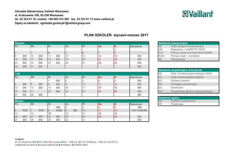 Ośrodek Szkoleniowy Vaillant Warszawa al. Krakowska 106, 02-256 Warszawa tel. 22 323 01 10, mobile: +48 602 412 200 fax. 22 323 01 13 www.vaillant.pl Zapisy na szkolenia: [email protected] PLAN SZKOLEŃ styczeń-marzec 2017 Styczeń Pn Wt 2 9 16 23 30 3 10 17 24 31 DO DO DO DO Luty Pn 6 13 20 27 DO DO DO DO Wt DO DO DO KK Marzec Pn 6 13 20 27 Śr PCF DO DO 7 14 21 28 DO DO Śr 1 8 15 22 DO DO DO DO DO DO DO Pt So 5 12 19 26 6 13 20 27 7 14 21 28 Cz 2 9 16 23 Pt 3 10 17 24 So 4 11 18 25 N 1 8 15 22 29 N 5 12 19 26 KK Wt 7 14 21 28 4 11 18 25 Cz PCF DO DO Śr 1 8 15 22 29 VM PCM DO DO Cz 2 9 16 23 30 RE Pt 3 10 17 24 31 So 4 11 18 25 N 5 12 19 26 Szkolenie DO DO DO DO Szkolenie DO DO DO DO KK Szkolenie VM PCF,PCM,RE DO DO Szkolenia autoryzacyjne Kotły wiszące kondensacyjne KK Regulatory, multiMATIC 700/2 VM Pompy ciepła gruntowe flexoTHERM PCF Pompy ciepła - monoblok PCM Rekuperacja RE Szkolenia uzupełniające autoryzację Kotły kondensacyjne powyżej 45kW KD Kotły kondensacyjne olejowe OL Systemy solarne SO Przeglądy gwarancyjne PG Serwisowe SA Doszkolenia dla firm autoryzowanych DO* Szkolenia ogólne Systemy hydrauliczne SH Projektowe PR Status firmy Czas Koszt trwania brutto Uprawnienia 3 dni 400,- umowa autoryzacyjna instalacja i uruchomienia kotłów kondensacyjnych do 45kW 1 dzień bezpłatne j.w. ukończone szkolenie KK 1 dzień bezpłatne ukończone szkolenie KK 1 dzień bezpłatne ukończone szkolenie KK 1 dzień bezpłatne dla firm autoryzowanych 1 dzień bezpłatne 2 dni bezpłatne Warunki przystąpienia Szkolenia KK - kotły kondensacyjne do 45kW, autoryzacyjne podstawowe rozpoczynające autoryzację firmy na kotły VM - regulatory multiMATIC 700/2 integralna część szkolenia KK Instalator KD - kotły kondensacyjne powyżej autoryzowany 45KW rozrzeszenie uprawnień (IA) uzupełniające autoryzacji OL - kotły kondensacyjne olejowe autoryzację na rozrzeszenie uprawnień autoryzacji kotły SO - systemy solarne rozrzeszenie uprawnień autoryzacji DO - doszkolenia z nowych urządzeń posiadanie uprawnień energ."E" elektrycznych (gr.1) i gazowych (gr.3); dokumenty działalności firmy Instalator Klub (IK) rozszerzenie autoryzacji IA PG - przeglądy gwarancyjne rozrzeszenie uprawnień autoryzacji ukończone szkolenie KK + dodatkowe warunki Serwis Autoryzowany (SA) rozszerzenie autoryzacji IK SA - szkolenie serwisowe rozrzeszenie uprawnień autoryzacji ukończone szkolenia KK + wszystkie uzupełniające 3 dni autoryzację oraz dodatkowe warunki PCF - pompy ciepła gruntowe flexoTHERM autoryzacja firmy PCM - pompy ciepła monoblok autoryzacja firmy posiadanie uprawnień energ."E" elektrycznych (gr.1); dokumenty działalności firmy posiadanie uprawnień energ."E" elektrycznych (gr.1); dokumenty działalności firmy RE - rekuperacja, wentylacja mechaniczna autoryzacja firmy posiadanie uprawnień energ."E" elektrycznych (gr.1); dokumenty działalności firmy Instalator Autoryzowany (IA) autoryzacyjne na pompy ciepła i wentylację SH - systemy hydrauliczne szkolenie zakończone Szkolenia bez autoryzacji zaświadczeniem ogólne PR - szkolenie projektowe zakończone zaświadczeniem * bezpłatne dla Partnerów Autoryzowanych 600,- aneks do umowy KK instalacja i uruchomienia wszystkich kotłów kondensacyjnych aneks do umowy KK instalacja i uruchomienia kotłów olejowych aneks do umowy dla IA instalacja systemów solarnych umowa rozszerzająca przedmiot umowy podstawowej IA o uprawnienia na przeglądy wydłużające gwarancję umowa serwisowa instalacja, uruchomienia, przeglądy i naprawy pogwarancyjne wszystkich urządzeń grzewczych umowa autoryzacyjna instalacja gruntowych pomp ciepła umowa autoryzacyjna instalacja pomp ciepła monoblock 2 dni 200,- 1 dzień *100,- 1 dzień *100,- umowa autoryzacyjna instalacja sytemów wentylacyjnych 1 dzień bezpłatne szkolenie zakończone zaświadczeniem bez autoryzacji 1 dzień bezpłatne szkolenie zakończone zaświadczeniem bez autoryzacji