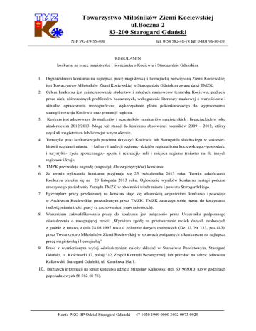 Towarzystwo Miøo ników Ziemi Kociewskiej ul.Boczna 2 83-200 Starogard Gda ski NIP 592-19-55-400 tel. 0-58 582-48-78 lub 0-601 96-80-10 REGULAMIN konkursu na prace magistersk i licencjack o Kociewiu i Starogardzie Gda skim. 1. Organizatorem konkursu na najlepsz prac magistersk i licencjack po wi con Ziemi Kociewskiej jest Towarzystwo Miøo ników Ziemi Kociewskiej w Starogardzie Gda skim zwane dalej TMZK. 2. Celem konkursu jest zainteresowanie studentów i møodych naukowców tematyk Kociewia, podj cie przez nich, ró norodnych problemów badawczych, wzbogacenie literatury naukowej o warto ciowe i aktualne opracowania monograficzne, wykorzystanie plonu pokonkursowego do wypracowania strategii rozwoju Kociewia oraz promocji regionu. 3. Konkurs jest adresowany do studentów i uczestników seminariów magisterskich i licencjackich w roku akademickim 2012/2013. Mog te stan do konkursu absolwenci roczników 2009 – 2012, którzy uzyskali magisterium lub licencjat w tym okresie. 4. Tematyka prac konkursowych powinna dotyczy Kociewia lub Starogardu Gda skiego w zakresie:historii regionu i miasta, - kultury i tradycji regionu,- dziejów regionalizmu kociewskiego,- gospodarki i turystyki,- ycia spoøecznego,- sportu i rekreacji,- roli i miejsca regionu (miasta) na tle innych regionów i kraju. 5. TMZK przewiduje nagrod (nagrody), dla zwyci zcy(ów) konkursu. 6. Za termin ogøoszenia konkursu przyjmuje si 25 pa dziernika 2013 roku. Termin zako czenia Konkursu okre la si na 20 listopada 2013 roku. Ogøoszenie wyników konkursu nast pi podczas uroczystego posiedzenia Zarz du TMZK w obecno ci wøadz miasta i powiatu Starogardzkiego. 7. Egzemplarz pracy przekazanej na konkurs staje si wøasno ci organizatora konkursu i pozostaje w Archiwum Kociewskim prowadzonym przez TMZK. TMZK zastrzega sobie prawo do korzystania i udost pniania tre ci pracy (z zachowaniem praw autorskich). 8. Warunkiem zakwalifikowania pracy do konkursu jest zaø czenie przez Uczestnika podpisanego o wiadczenia o nast puj cej tre ci: „Wyra am zgod na przetwarzanie moich danych osobowych z godnie z ustaw z dnia 28.08.1997 roku o ochronie danych osobowych (Dz. U. Nr 133, poz.883). przez Towarzystwo Miøo ników Ziemi Kociewskiej w sprawach zwi zanych z konkursem na najlepsz prac magistersk i licencjack ”. 9. Prace z wymienionym wy ej o wiadczeniem nale y skøada w Starostwie Powiatowym, Starogard Gda ski, ul. Ko ciuszki 17, pokój 312, Zespóø Kontroli Wewn trznej lub przesøa na adres: Mirosøaw Kalkowski, Starogard Gda ski, ul. Kanaøowa 19a/1. 10. Bli szych informacji na temat konkursu udziela Mirosøaw Kalkowski (tel. 601968010 lub w godzinach popoøudniowych 58 582 48 78). Konto PKO BP Odziaø Starogard Gda ski 47 1020 1909 0000 3602 0073 0929