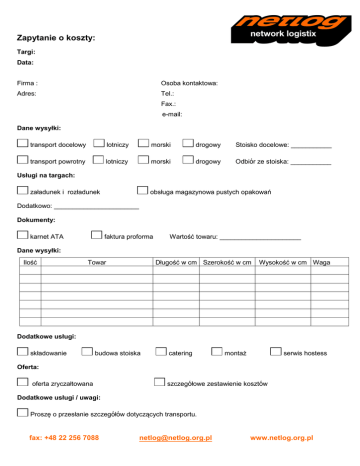 Zapytanie o koszty: Targi: Data: Firma : Osoba kontaktowa: Adres: Tel.: Fax.: e-mail: Dane wysyłki: transport docelowy lotniczy morski drogowy Stoisko docelowe: ___________ transport powrotny lotniczy morski drogowy Odbiόr ze stoiska: ___________ Usługi na targach: załadunek i rozładunek obsługa magazynowa pustych opakowań Dodatkowo: _______________________ Dokumenty: karnet ATA faktura proforma Wartość towaru: ______________________ Dane wysyłki: Ilość Długość w cm Szerokość w cm Towar Wysokość w cm Waga Dodatkowe usługi: składowanie budowa stoiska catering montaż serwis hostess Oferta: oferta zryczałtowana szczegόłowe zestawienie kosztόw Dodatkowe usługi / uwagi: Proszę o przesłanie szczegόłόw dotyczących transportu. fax: +48 22 256 7088 [email protected] www.netlog.org.pl