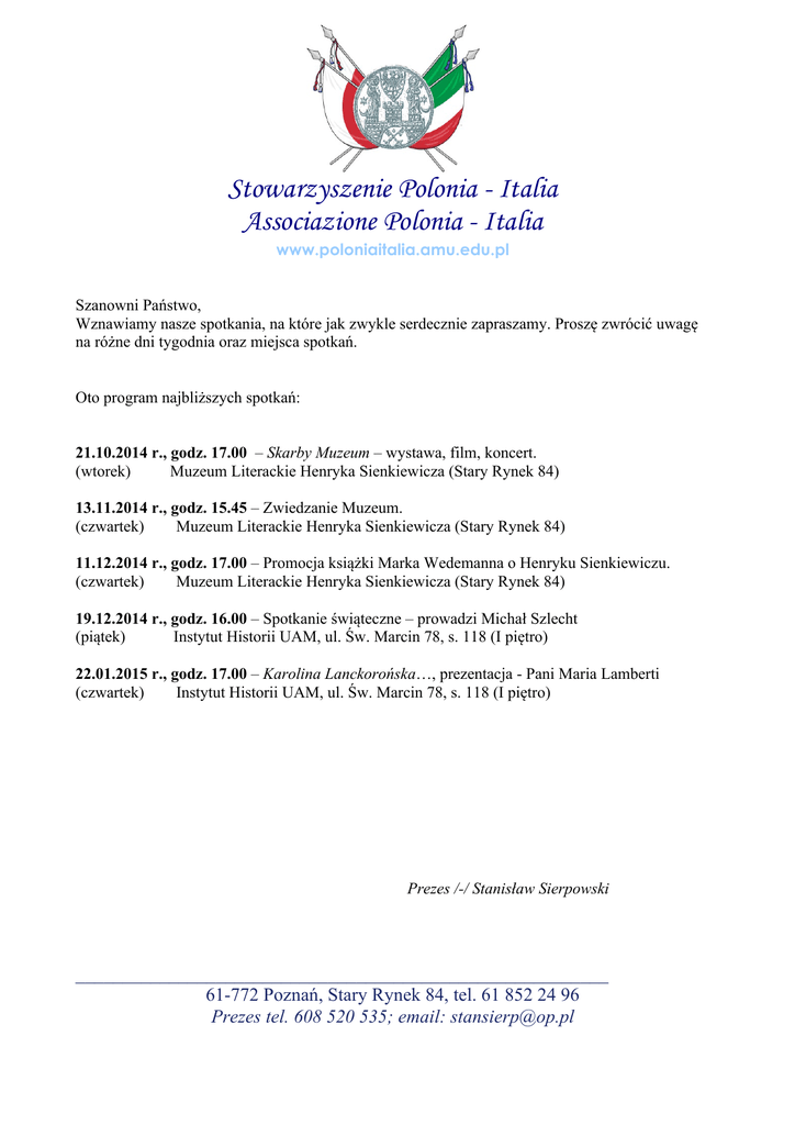 Stowarzyszenie Polonia - Italia Associazione Polonia - Italia www.poloniaitalia.amu.edu.pl Szanowni Państwo, Wznawiamy nasze spotkania, na które jak zwykle serdecznie zapraszamy. Proszę zwrócić uwagę na różne dni tygodnia oraz miejsca spotkań. Oto program najbliższych spotkań: 21.10.2014 r., godz. 17.00 – Skarby Muzeum – wystawa, film, koncert. (wtorek) Muzeum Literackie Henryka Sienkiewicza (Stary Rynek 84) 13.11.2014 r., godz. 15.45 – Zwiedzanie Muzeum. (czwartek) Muzeum Literackie Henryka Sienkiewicza (Stary Rynek 84) 11.12.2014 r., godz. 17.00 – Promocja książki Marka Wedemanna o Henryku Sienkiewiczu. (czwartek) Muzeum Literackie Henryka Sienkiewicza (Stary Rynek 84) 19.12.2014 r., godz. 16.00 – Spotkanie świąteczne – prowadzi Michał Szlecht (piątek) Instytut Historii UAM, ul. Św. Marcin 78, s. 118 (I piętro) 22.01.2015 r., godz. 17.00 – Karolina Lanckorońska…, prezentacja - Pani Maria Lamberti (czwartek) Instytut Historii UAM, ul. Św. Marcin 78, s. 118 (I piętro) Prezes /-/ Stanisław Sierpowski _________________________________________________________ 61-772 Poznań, Stary Rynek 84, tel. 61 852 24 96 Prezes tel. 608 520 535; email: [email protected]