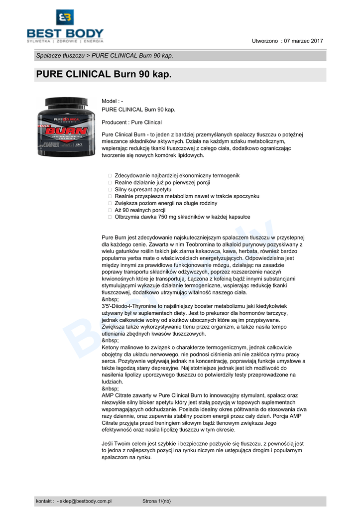 Utworzono : 07 marzec 2017 Spalacze tłuszczu > PURE CLINICAL Burn 90 kap. PURE CLINICAL Burn 90 kap. Model : PURE CLINICAL Burn 90 kap. Producent : Pure Clinical Pure Clinical Burn - to jeden z bardziej przemyślanych spalaczy tłuszczu o potężnej mieszance składników aktywnych. Działa na każdym szlaku metabolicznym, wspierając redukcję tkanki tłuszczowej z całego ciała, dodatkowo ograniczając tworzenie się nowych komórek lipidowych. � Zdecydowanie najbardziej ekonomiczny termogenik � Realne działanie już po pierwszej porcji � Silny supresant apetytu � Realnie przyspiesza metabolizm nawet w trakcie spoczynku � Zwiększa poziom energii na długie rodziny � Aż 90 realnych porcji � Olbrzymia dawka 750 mg składników w każdej kapsułce y d Pure Burn jest zdecydowanie najskuteczniejszym spalaczem tłuszczu w przystepnej dla każdego cenie. Zawarta w nim Teobromina to alkaloid purynowy pozyskiwany z wielu gatunków roślin takich jak ziarna kakaowca, kawa, herbata, również bardzo popularna yerba mate o właściwościach energetyzujących. Odpowiedzialna jest między innymi za prawidłowe funkcjonowanie mózgu, działając na zasadzie poprawy transportu składników odżywczych, poprzez rozszerzenie naczyń krwionośnych które je transportują. Łączona z kofeiną bądź innymi substancjami stymulującymi wykazuje działanie termogeniczne, wspierając redukcję tkanki tłuszczowej, dodatkowo utrzymując witalność naszego ciała. 3'5'-Diiodo-l-Thyronine to najsilniejszy booster metabolizmu jaki kiedykolwiek używany był w suplementach diety. Jest to prekursor dla hormonów tarczycy, jednak całkowicie wolny od skutków ubocznych które są im przypisywane. Zwiększa także wykorzystywanie tlenu przez organizm, a także nasila tempo utleniania zbędnych kwasów tłuszczowych. Ketony malinowe to związek o charakterze termogenicznym, jednak całkowicie obojętny dla układu nerwowego, nie podnosi ciśnienia ani nie zakłóca rytmu pracy serca. Pozytywnie wpływają jednak na koncentrację, poprawiają funkcje umysłowe a także łagodzą stany depresyjne. Najistotniejsze jednak jest ich możliwość do nasilenia lipolizy uporczywego tłuszczu co potwierdziły testy przeprowadzone na ludziach. AMP Citrate zawarty w Pure Clinical Burn to innowacyjny stymulant, spalacz oraz niezwykle silny bloker apetytu który jest stałą pozycją w topowych suplementach wspomagających odchudzanie. Posiada idealny okres półtrwania do stosowania dwa razy dziennie, oraz zapewnia stabilny poziom energii przez cały dzień. Porcja AMP Citrate przyjęta przed treningiem siłowym bądź tlenowym zwiększa Jego efektywność oraz nasila lipolizę tłuszczu w tym okresie. t s e B o B Jeśli Twoim celem jest szybkie i bezpieczne pozbycie się tłuszczu, z pewnością jest to jedna z najlepszych pozycji na rynku niczym nie ustępująca drogim i popularnym spalaczom na rynku. kontakt : - [email protected] Strona 1/{nb} Utworzono : 07 marzec 2017 Spalacze tłuszczu > PURE CLINICAL Burn 90 kap. PURE CLINICAL Burn 90 kap. Wielkość porcji: 1 kap. Ilość porcji w opakowaniu: 90 Dawkowanie i sposób użycia: stosować 1 kap. Pure Burn codziennie po przebudzeniu oraz 1 kap. w godzinach po południowych lub przed treningiem. Produkt nie może być stosowany jako substytut zróżnicowanej diety. Nie należy stosować w przypadku jakichkolwiek problemów fizjologicznych lub psychologicznych, a także podczas stosowania niektórych leków. W razie wątpliwości należy skonsultować się z lekarzem. Nie należy przekraczać zalecanej przez producenta dziennej porcji do spożycia. Przechowywać w miejscu niedostępnym dla dzieci. UWAGA - kopiowanie oraz rozpowszechnianie opisów jest zabronione przez sklep BEST BODY © 2015. Ustawa z dnia 4 lutego 1994 r. o prawie autorskim i prawach pokrewnych (Dz. U. z 2006 r. Nr 90, poz. 631 z późn. zm.). y d Ochrona autorskich praw osobistych: Twórca, którego autorskie prawa osobiste zostały zagrożone cudzym działaniem, może żądać zaniechania tego działania. W razie dokonanego naruszenia może także żądać, aby osoba, która dopuściła się naruszenia, dopełniła czynności potrzebnych do usunięcia jego skutków, w szczególności, aby złożyła publiczne oświadczenie o odpowiedniej treści i formie. Jeżeli naruszenie było zawinione, sąd może przyznać twórcy odpowiednią sumę pieniężną tytułem zadośćuczynienia za doznaną krzywdę albo - na żądanie twórcy - zobowiązać sprawcę, aby uiścił odpowiednią sumę pieniężną na wskazany przez twórcę cel społeczny. t s e B o B Cena : 129,00 zł Brutto ( 120,56 zł Netto) Cena promocyjna : 109,00 zł Brutto ( 101,87 zł Netto) Dostępność: Produkt dostępny w naszym sklepie od 05 październik 2015 kontakt : - [email protected] Strona 2/{nb}