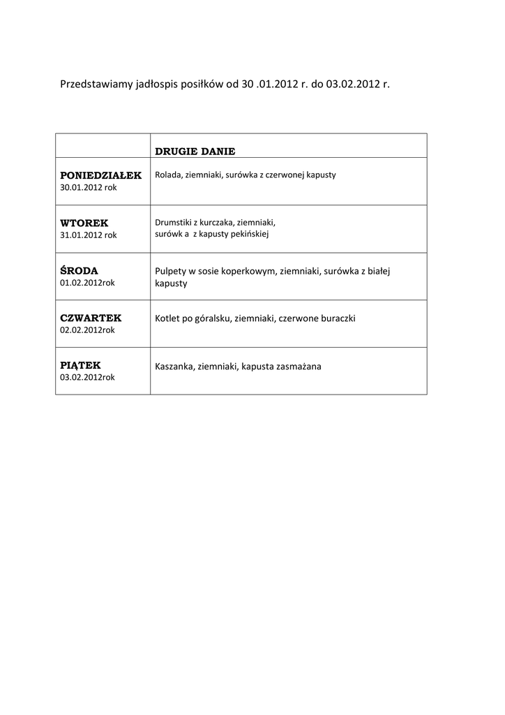 Przedstawiamy jadłospis posiłków od 30 .01.2012 r. do 03.02.2012 r.