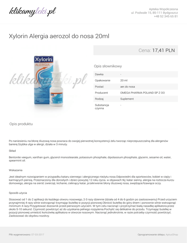 Apteka Współczesna ul. Podwale 15, 85-111 Bydgoszcz +48 52 345 65 81 Xylorin Alergia aerozol do nosa 20ml Cena: 17,41 PLN Opis słownikowy Dawka - Opakowanie 20 ml Postać aer.do nosa Producent OMEGA PHARMA POLAND SP Z OO Rodzaj Suplement Substancja czynna - Opis produktu Po naniesieniu na błonę śluzową nosa powraca do swojej pierwotnej konsystencji żelu tworząc nieprzepuszczalną dla alergenów barierę.Szybka ulga w alergii, działa w 3 minuty. Skład Bentonite veegum, xanthan gum, glycerol monostearate, potassium phosphate, dipotassium phosphate, glycerin, sesame oil, water, spearmint oil. Wskazania Jest idealnym rozwiązaniem w przypadku kataru siennego i alergicznego nieżytu nosa.Odpowiedni dla sportowców, kobiet w cięży i karmiących piersią. Przeznaczony dla dorosłych i dzieci powyżej 12 roku życia. w objawach tkj: katar sienny, alergia na roztocza kurzu domowego, alergia na sierść zwierząt, kichanie, cieknący katar, przekrwienie błony śluzowej nosa, swędzące/łzawiące oczy. Sposób użycia Stosować od 1 do 2 aplikacji do każdego otworu nosowego, 2-3 razy dziennie (działa od 4 do 6 godzin po zastosowaniu) Przed urzyciem przynajmniej 4 razy silnie wstrząsnąć trzymając butelkę w pozycji pionowej.Obrócić butelkę do góry dnem i ponownie silnie wstrząsnąć minimum 4 razy.Przygotować dozownik przed pierwszym użyciem. W tym celu nacisnąć i przytrzymać białą nasadkę aplikatora przez około 5-10 sekund. Czynność powtórzyć aż do uzyskania pełnego rozpylenia.Pochylić się delikatnie do przodu. Trzymając butelkę w pozycji pionowej umieścić końcówkę aplikatora w otworze nosowym. Nacisnąć jednokrotnie, w razie potrzeby czynność powtórzyć. Zastosować do obydwu nozdrzy. Plik wygenerowano: 07-03-2017 Oprogramowanie sklepu: AptusShop Apteka Współczesna ul. Podwale 15, 85-111 Bydgoszcz +48 52 345 65 81 Plik wygenerowano: 07-03-2017 Powered by TCPDF (www.tcpdf.org) Oprogramowanie sklepu: AptusShop
